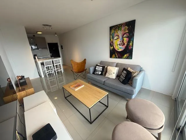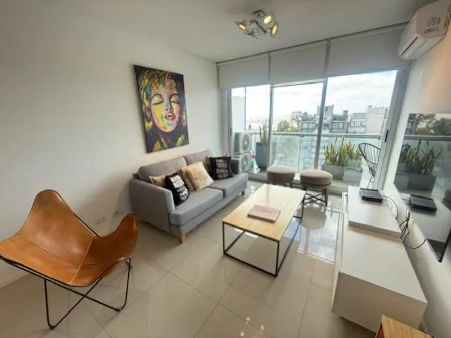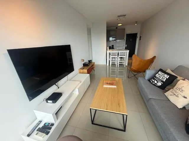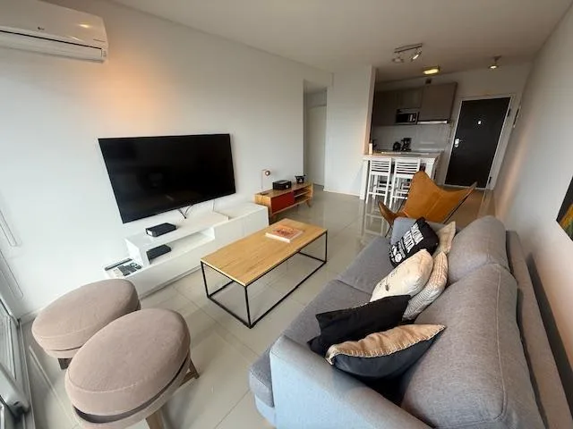 Furnished two-room apartment in Olivos with 1 bedroom and a river view. It is on a high floor and has a living-dining area with access to a continuous balcony. Integrated kitchen separated by a breakfast bar, main bedroom en suite with dressing room, and a guest toilet. Hot-cold air conditioning, a (assigned) parking space, and access to the AWWA building’s amenities including a pool with river views, residents’ lounge with a grill, laundry, gym, tennis court, and a heated pool with 24-hour secu