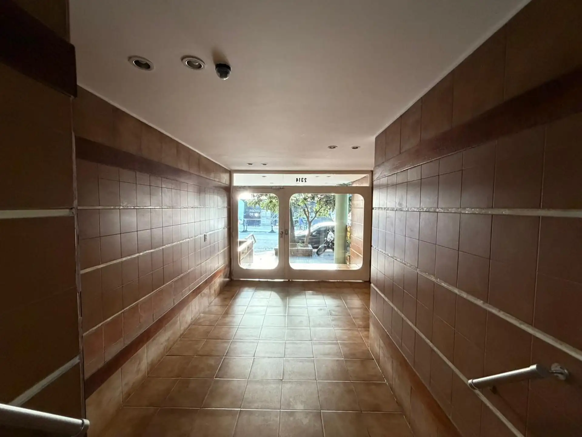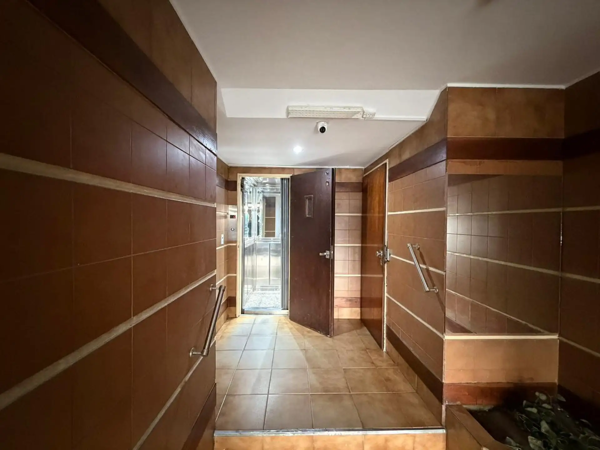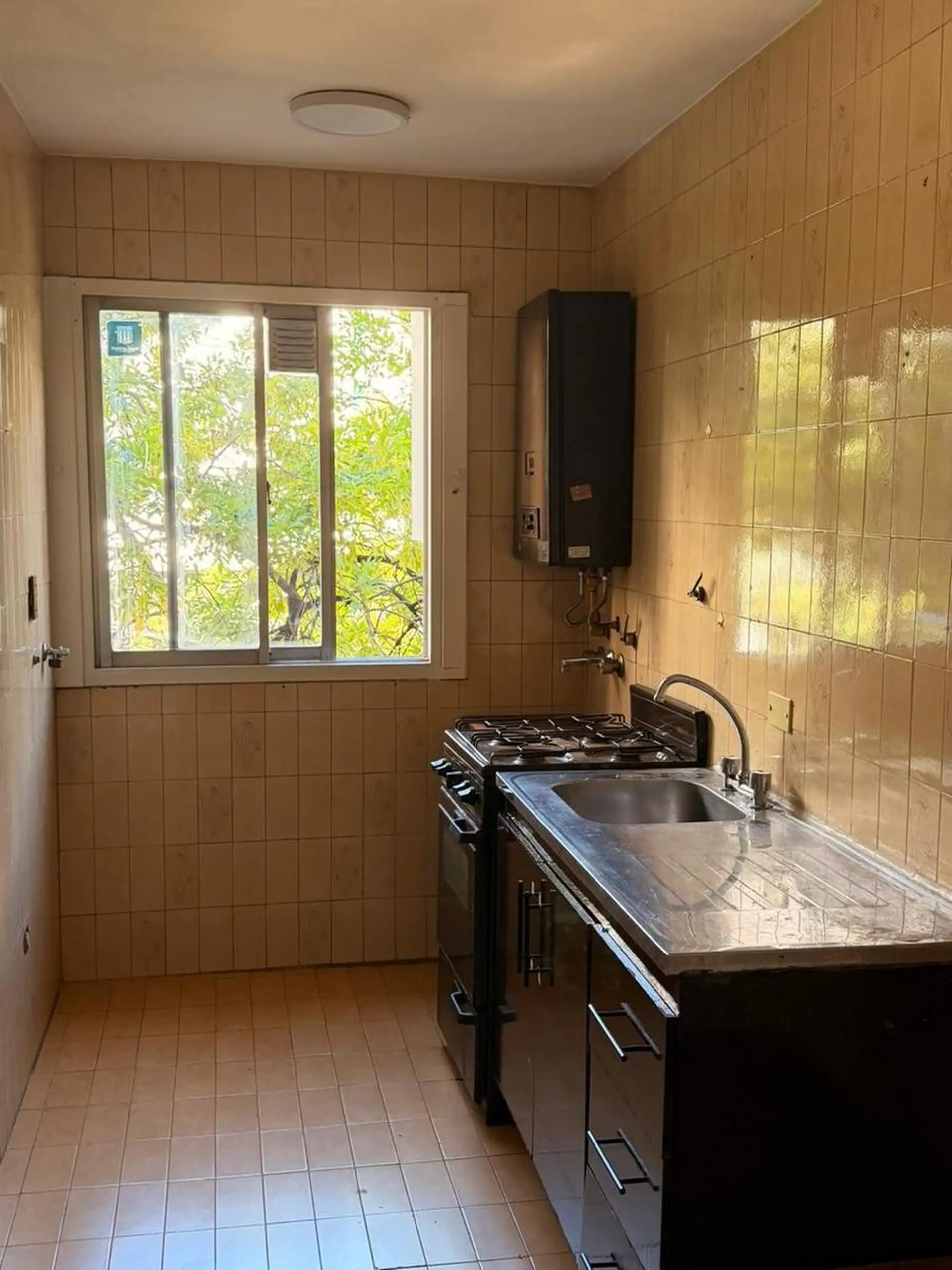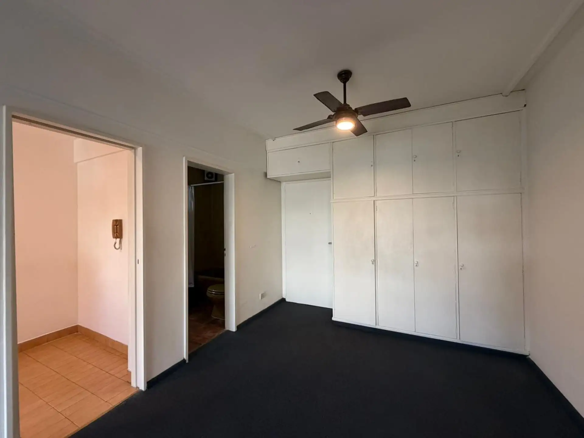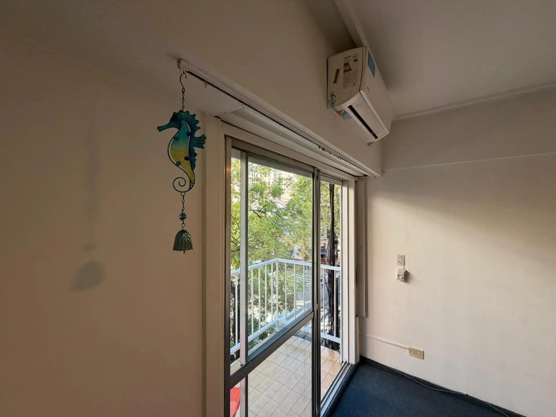 Studio apartment with 35 m² total area, 33 m² covered, on the 3rd floor, street-facing with a 2 m² balcony. It has 1 bathroom and a separate kitchen with a daily dining area. Gas water heater (calefón a gas) and air conditioning (split hot/cold), plus a balanced-flue space heater. The building has two elevators, electric porter, and security cameras; monthly building fees (expensas) are listed separately from rent, along with ABL, electricity and gas.