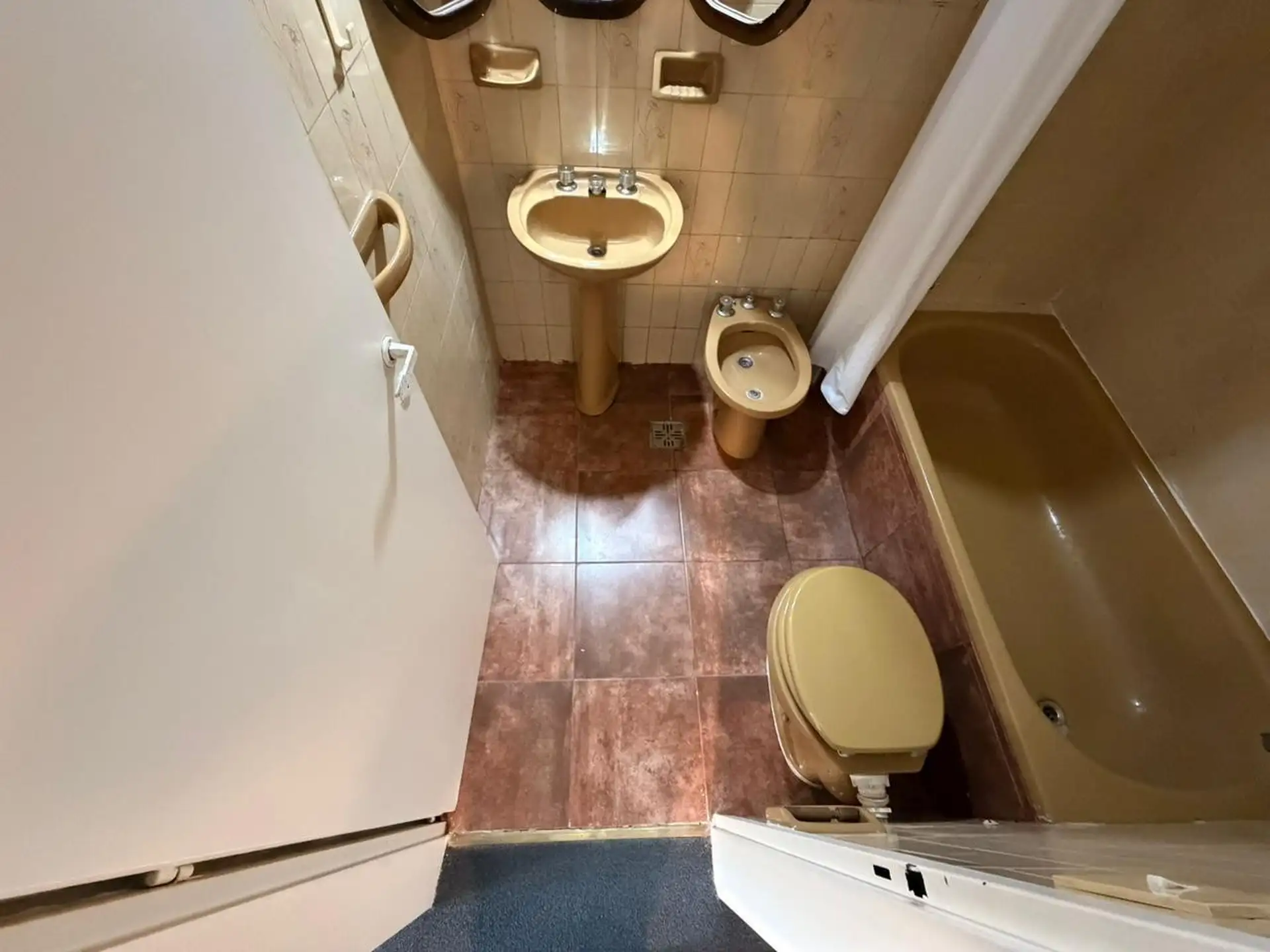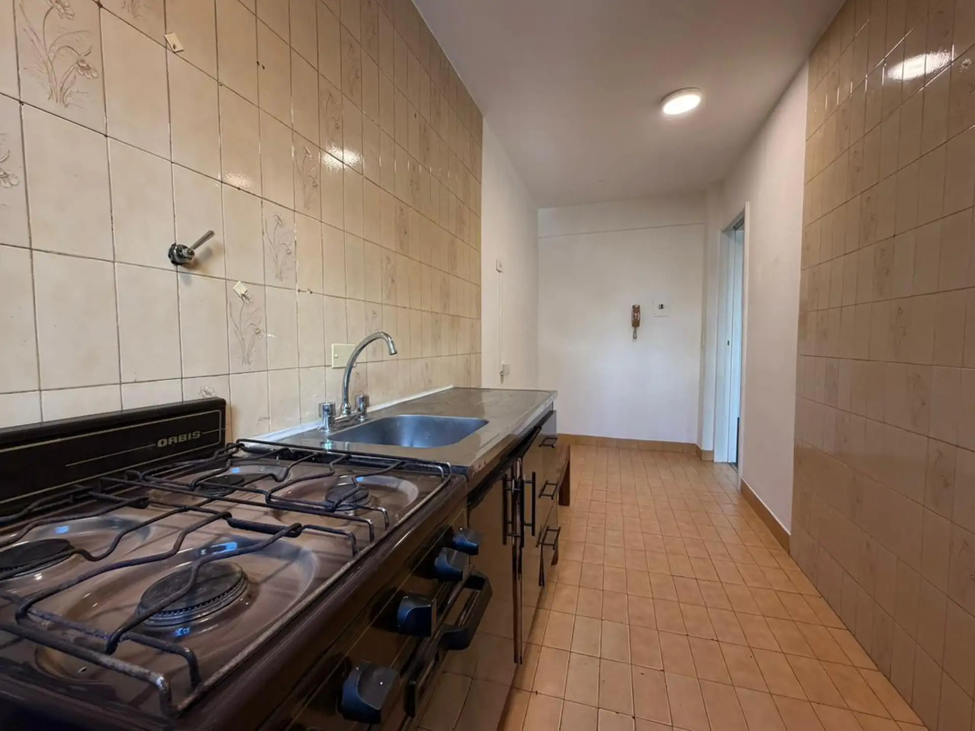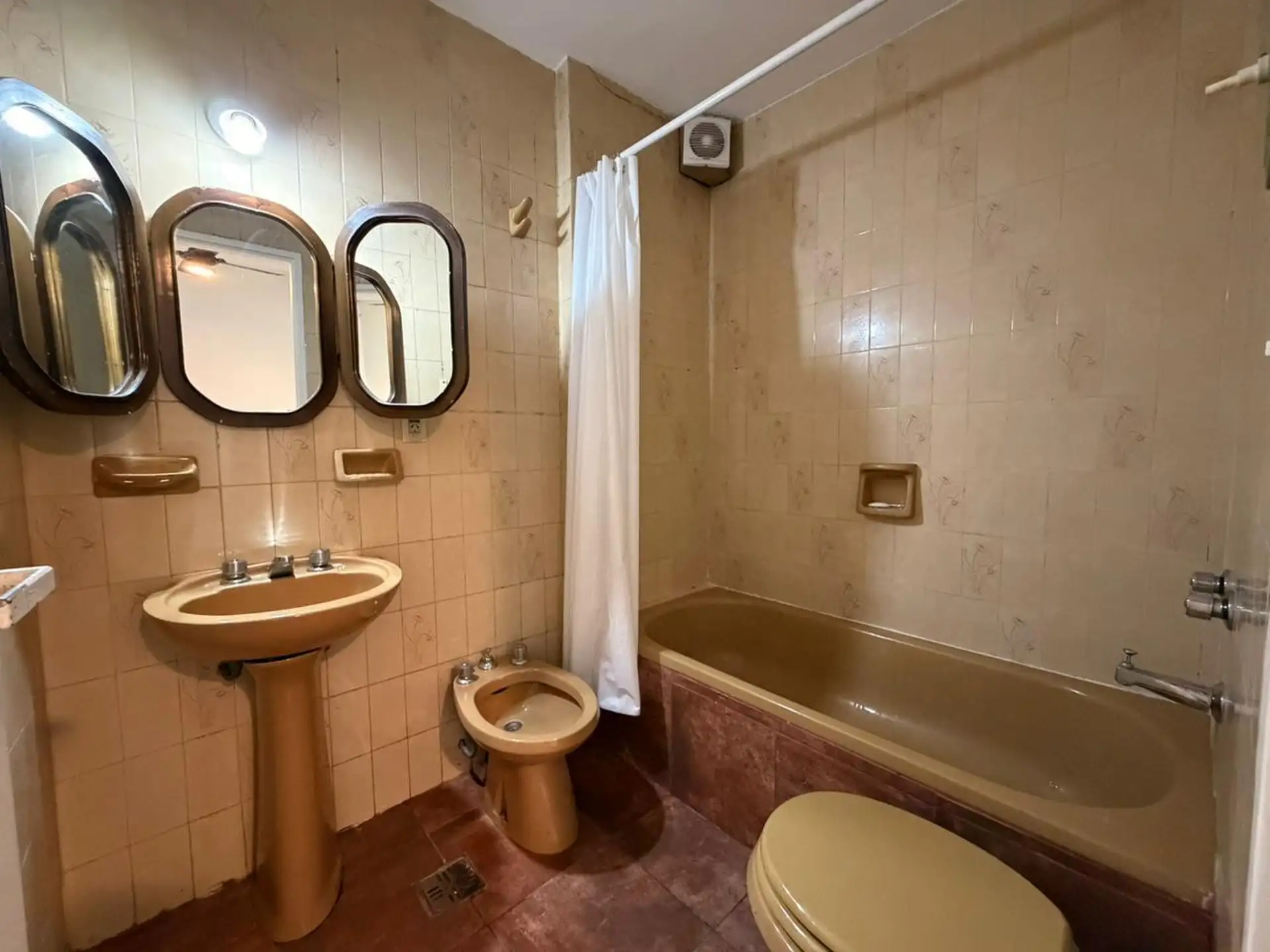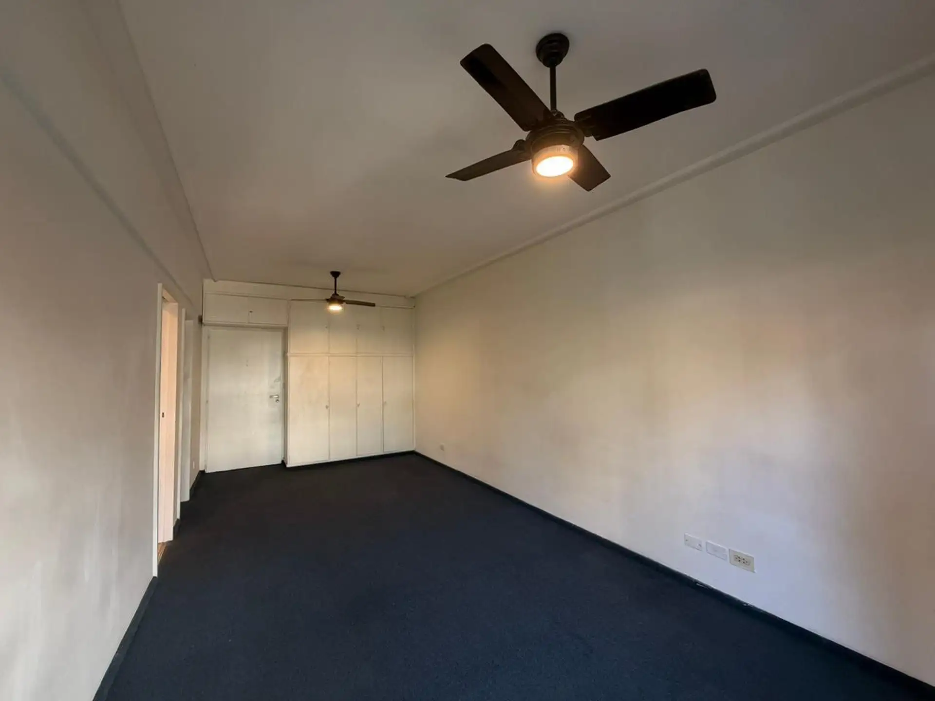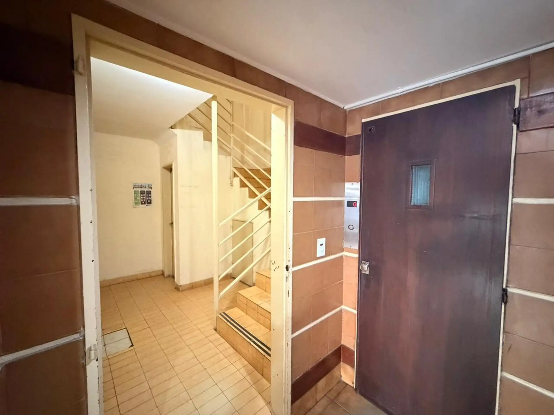 Studio apartment with 35 m² total area, 33 m² covered, on the 3rd floor, street-facing with a 2 m² balcony. It has 1 bathroom and a separate kitchen with a daily dining area. Gas water heater (calefón a gas) and air conditioning (split hot/cold), plus a balanced-flue space heater. The building has two elevators, electric porter, and security cameras; monthly building fees (expensas) are listed separately from rent, along with ABL, electricity and gas.