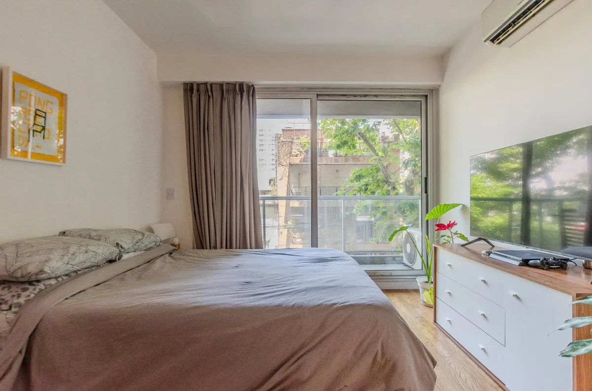 Studio apartment at street level in Palermo, with balcony access and leafy open views. The unit is fully furnished and equipped and includes an integrated kitchen with Philips under-counter fridge, electric oven and hotplate, a full bathroom with bathtub, and a front-facing balcony. Air conditioning (hot/cold) and double-glazed windows (DVH) are installed, with floating “Patagonia” wood flooring. Building amenities include a pool, communal room (SUM), grill area, and laundry. Building fees and e