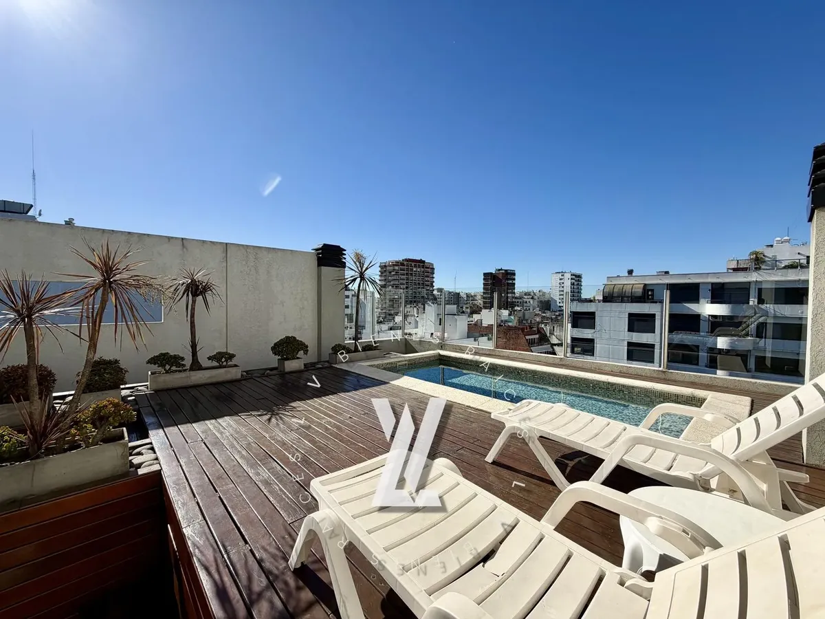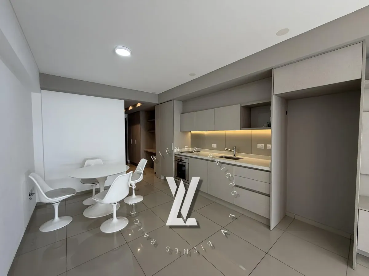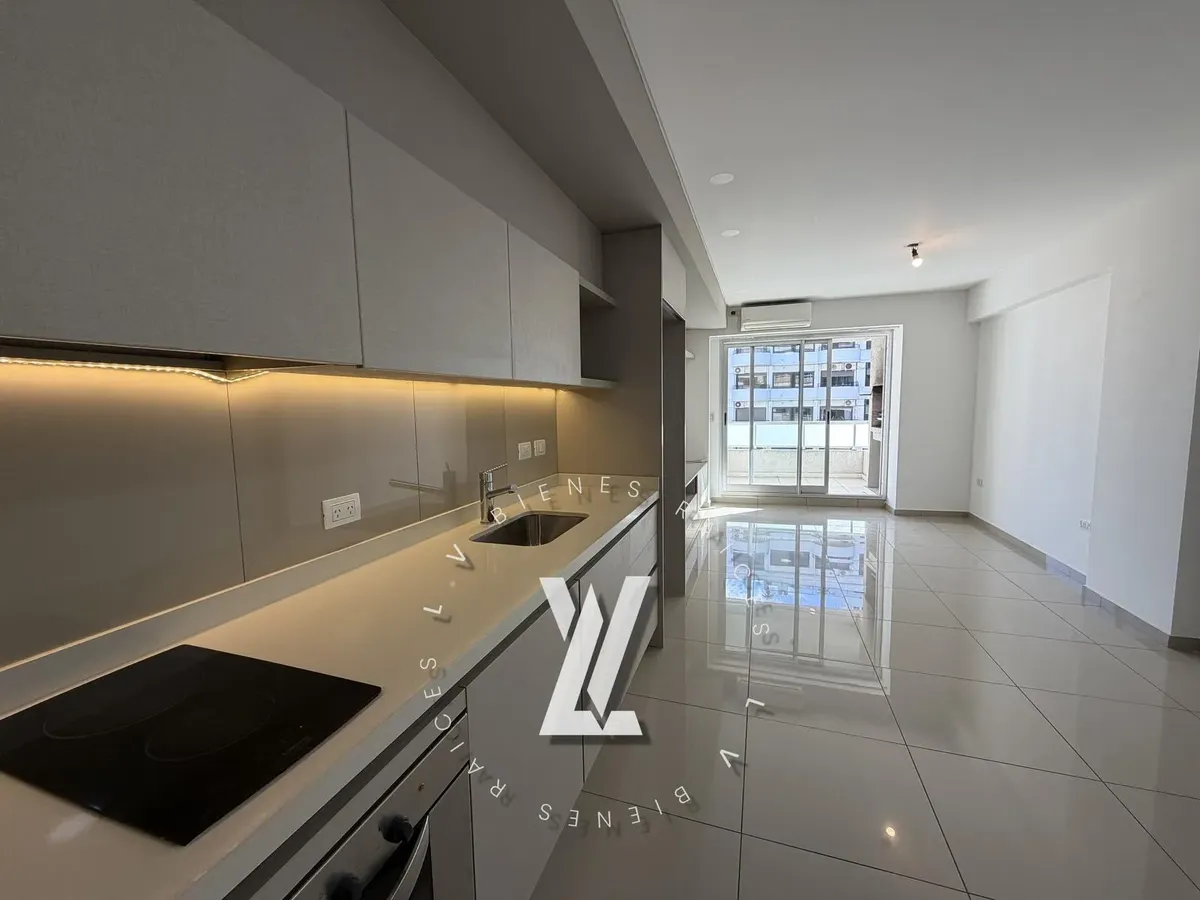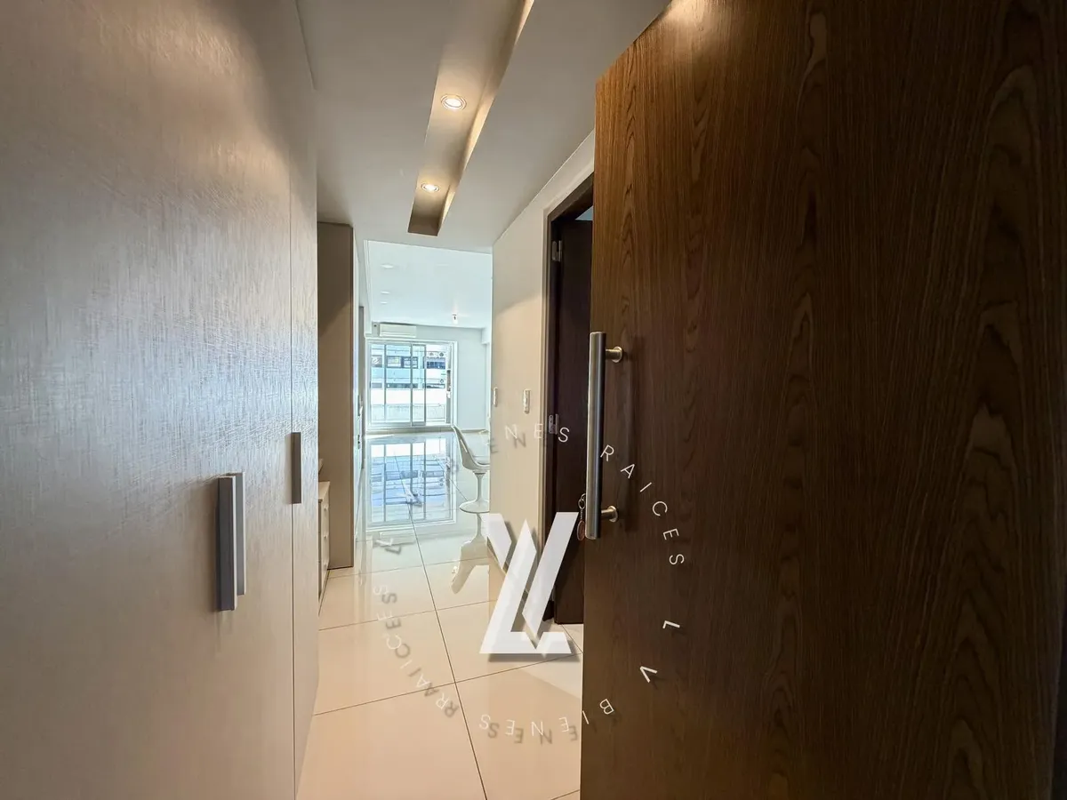 Studio apartment for rent in Palermo Chico. One main room with natural light, with space for a living and sleeping area, plus a functional kitchen with storage and a full bathroom. The unit is in a well-maintained building in a residential setting.