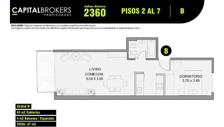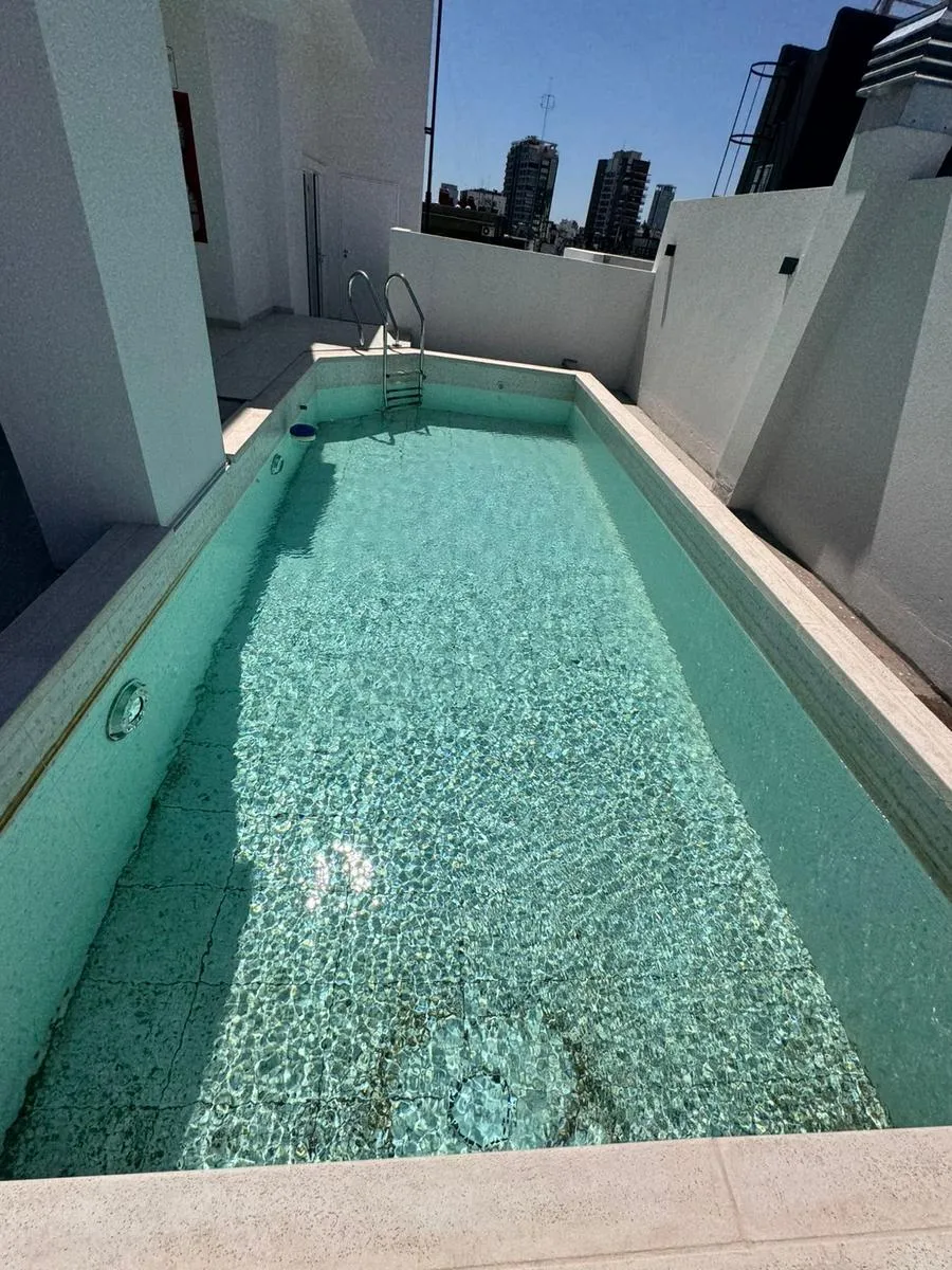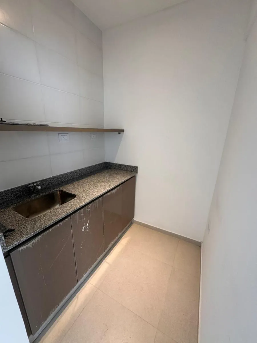 Divisible studio apartment for rent with 47 m², street-facing with a balcony. Integrated kitchen includes a connection for a washing machine and space for a large refrigerator. Full bathroom and air conditioning; central hot water and heating via AA. Building on the 10th floor has a pool, an ample communal room (SUM) on the ground floor, bicycle storage, and a laundry space (no equipment). No pets allowed.