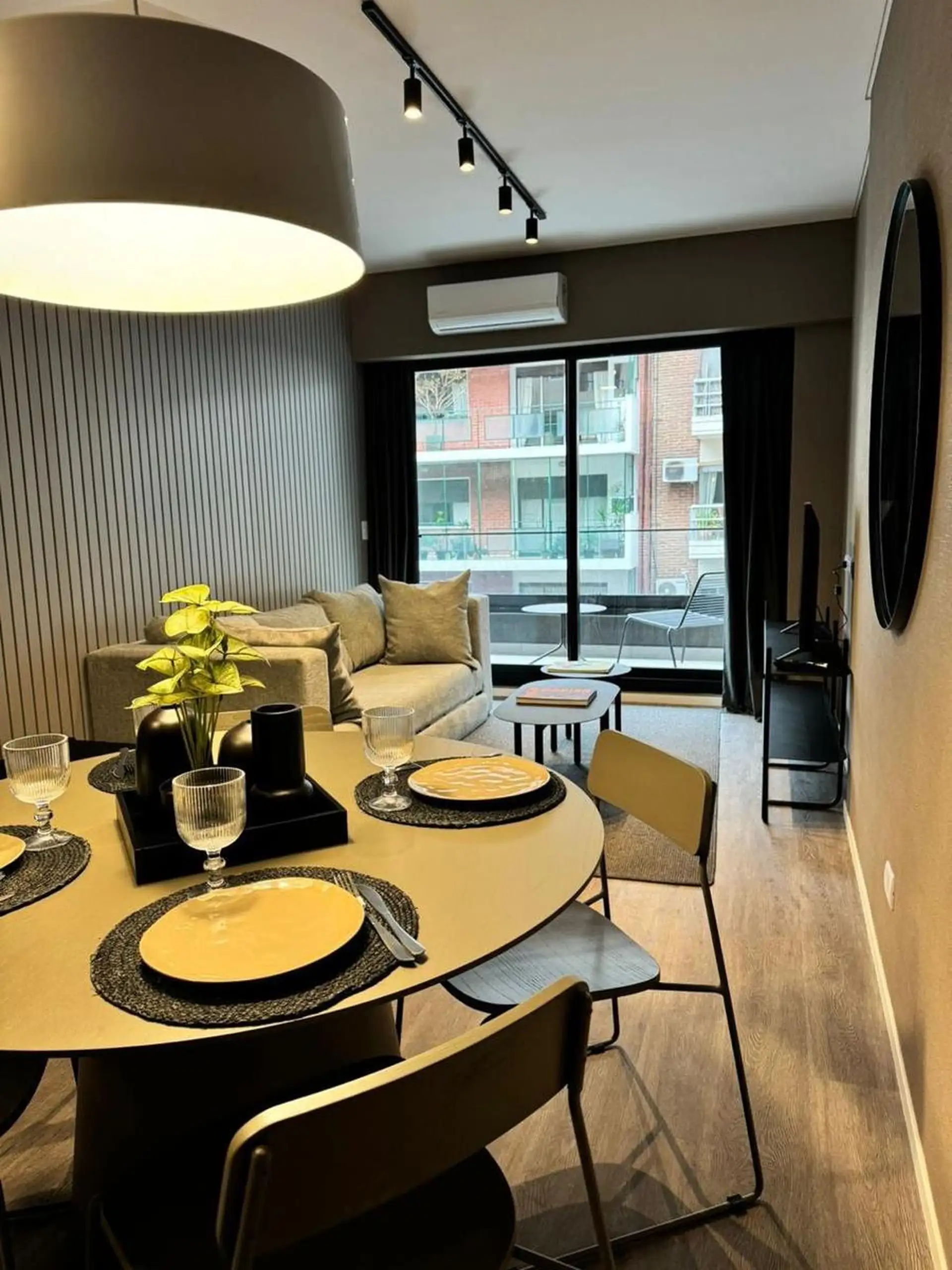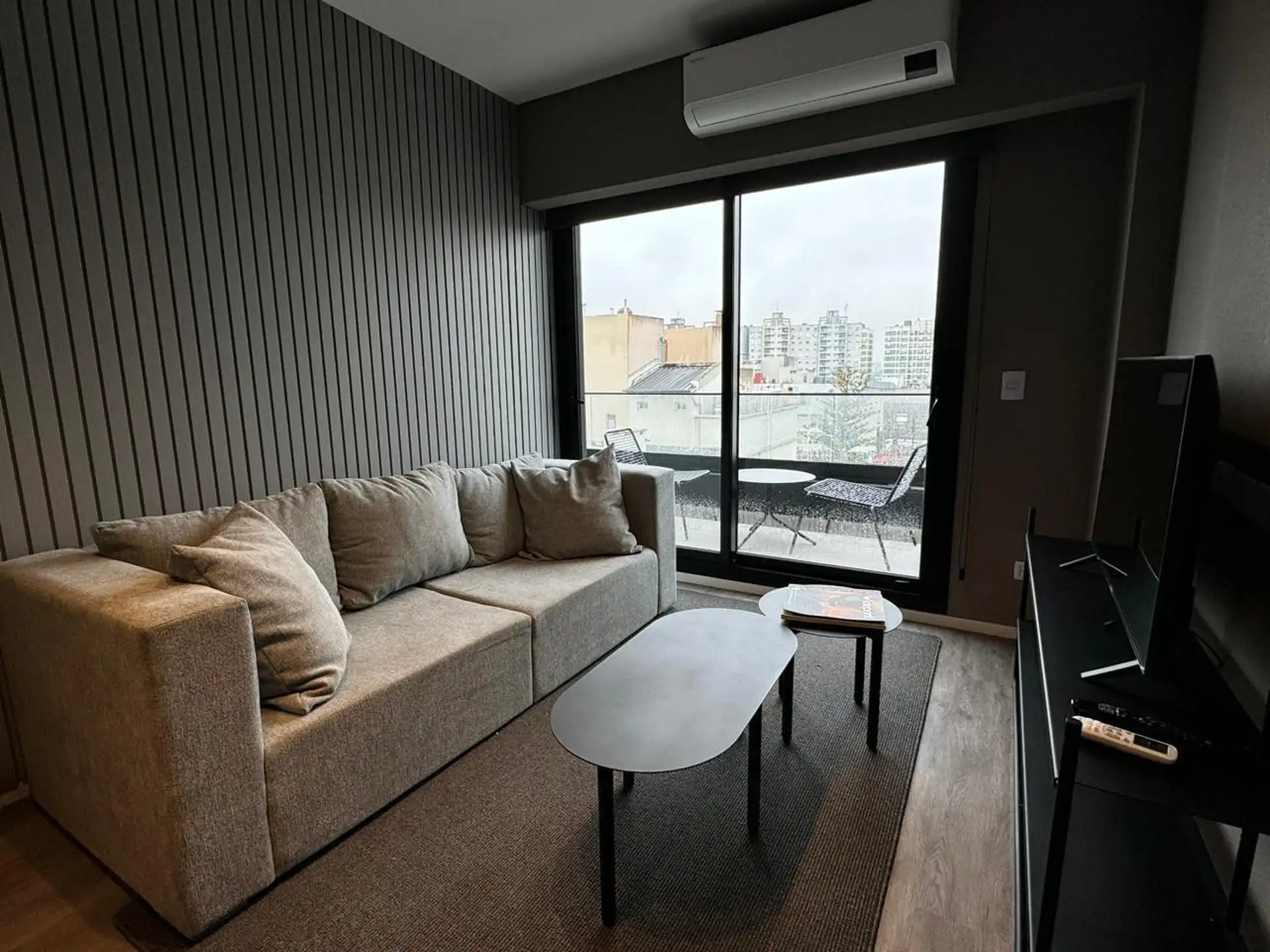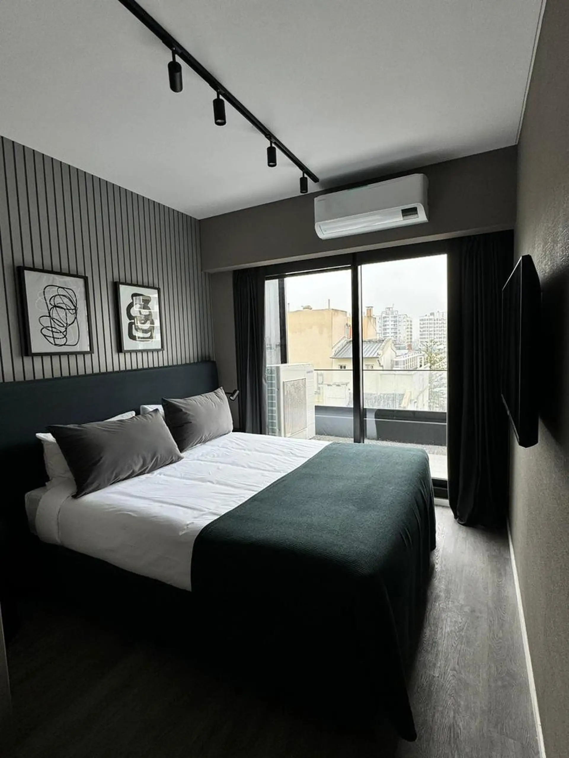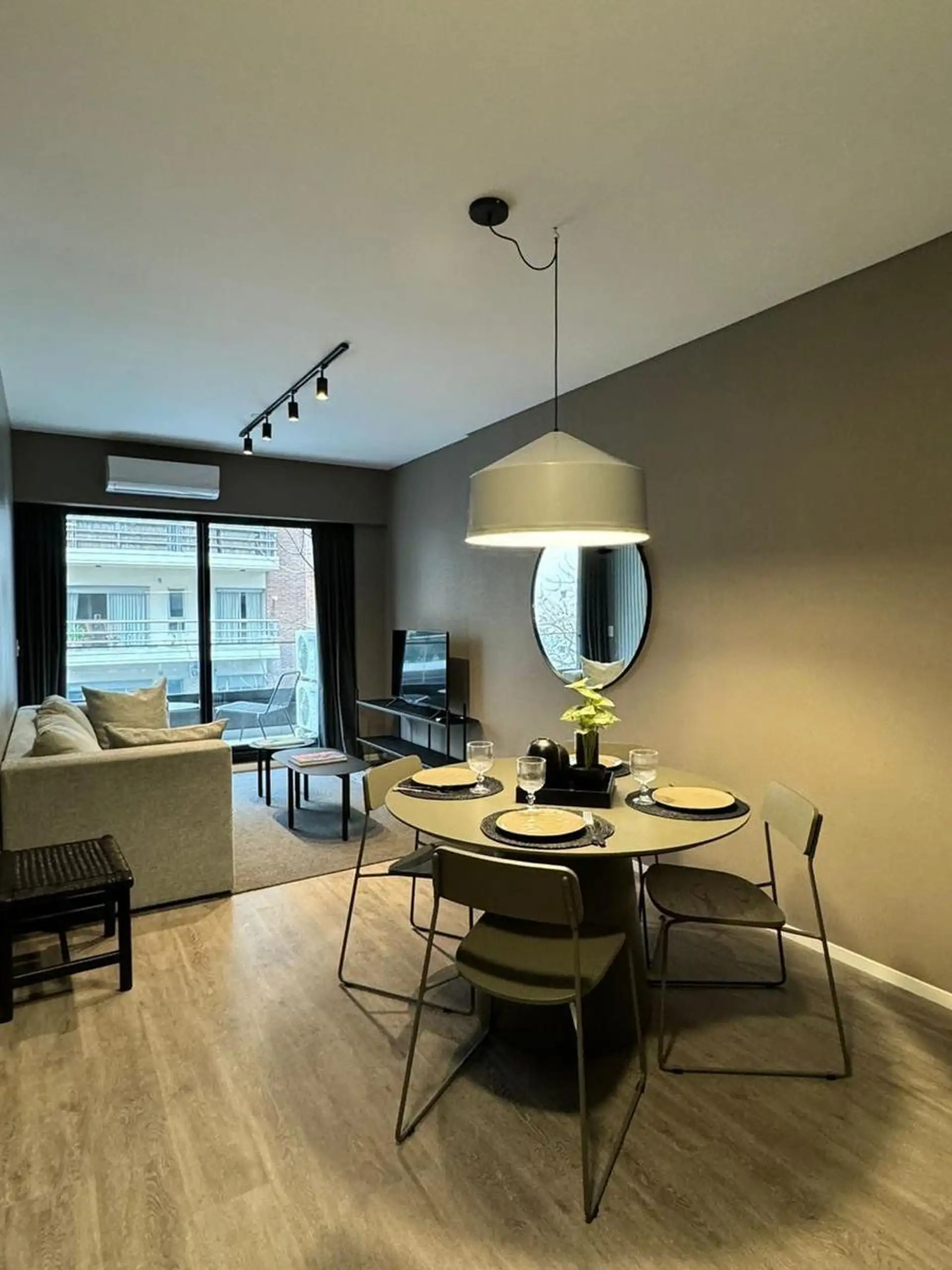 Two-room apartment in Palermo, furnished and fully equipped, with a private balcony. It includes a living-dining area, integrated kitchen with oven, fridge, microwave, and electric kettle, a bedroom with a queen bed and wardrobe, and a full bathroom with a bathtub. Heating and cooling are provided by split air-conditioning (cold/hot) in both rooms; the building has indoor heated pool (semi-Olympic), outdoor pool on the terrace, a 500 m2 fully equipped gym, yoga and meditation room, co-working ro
