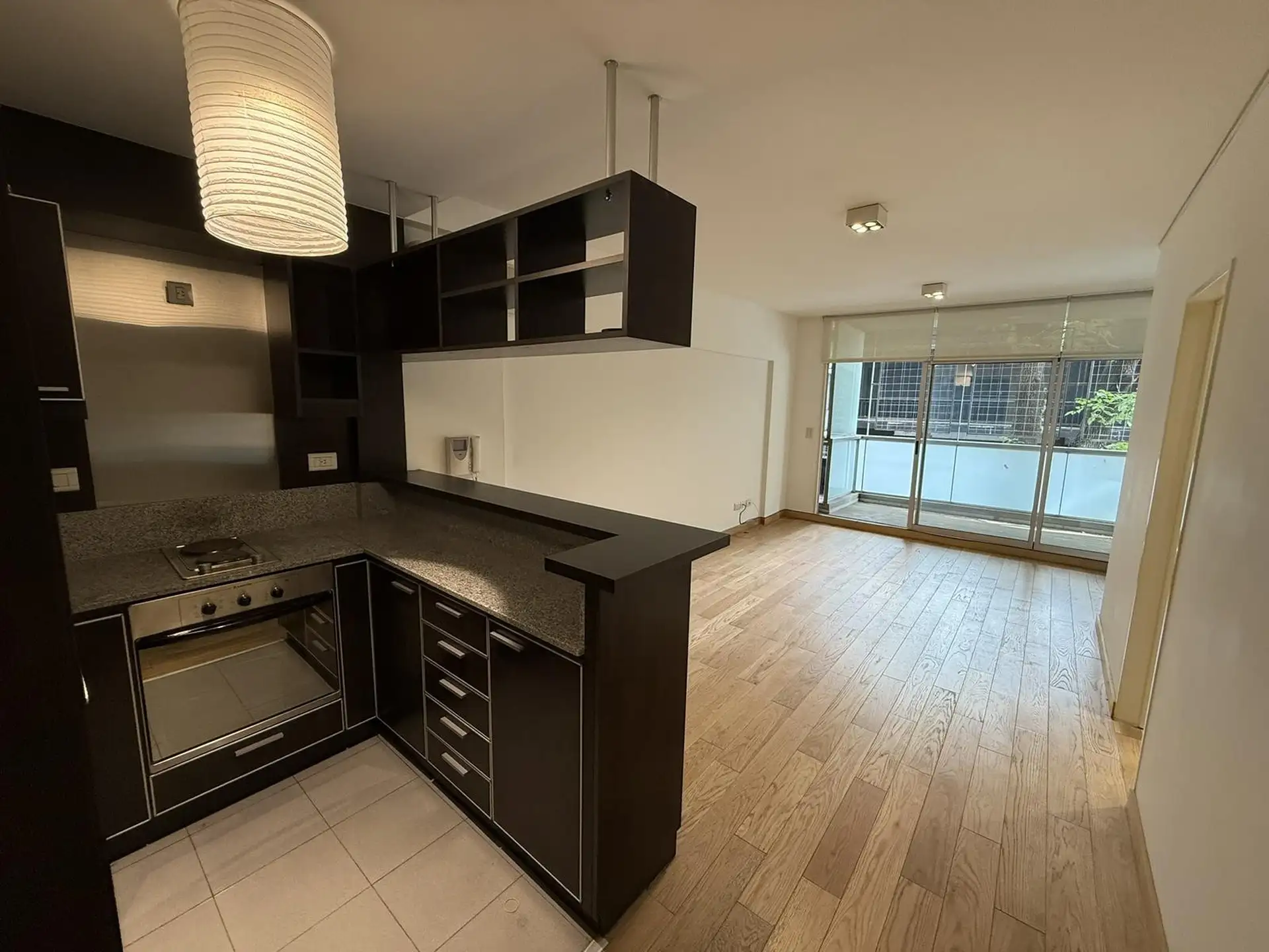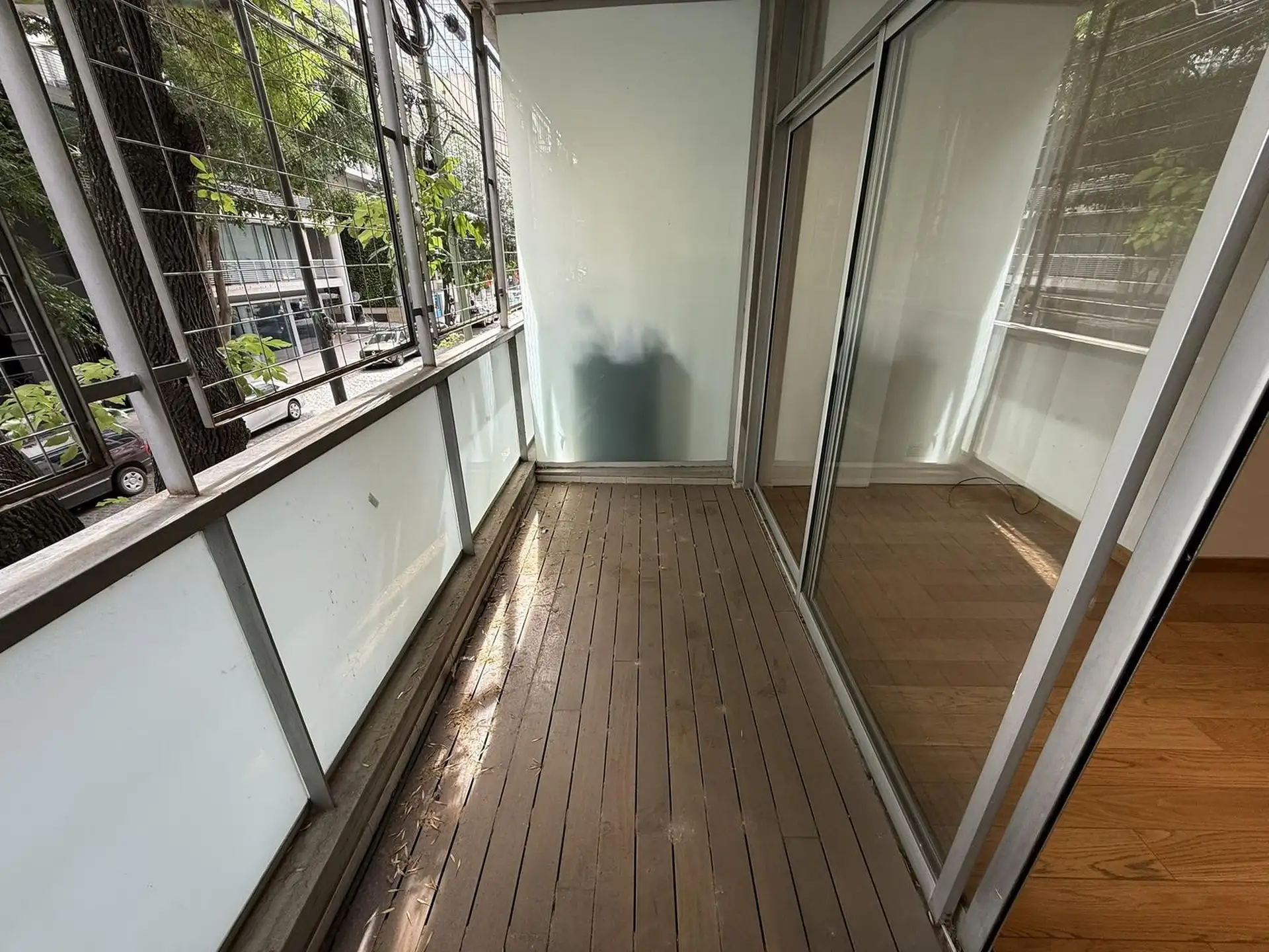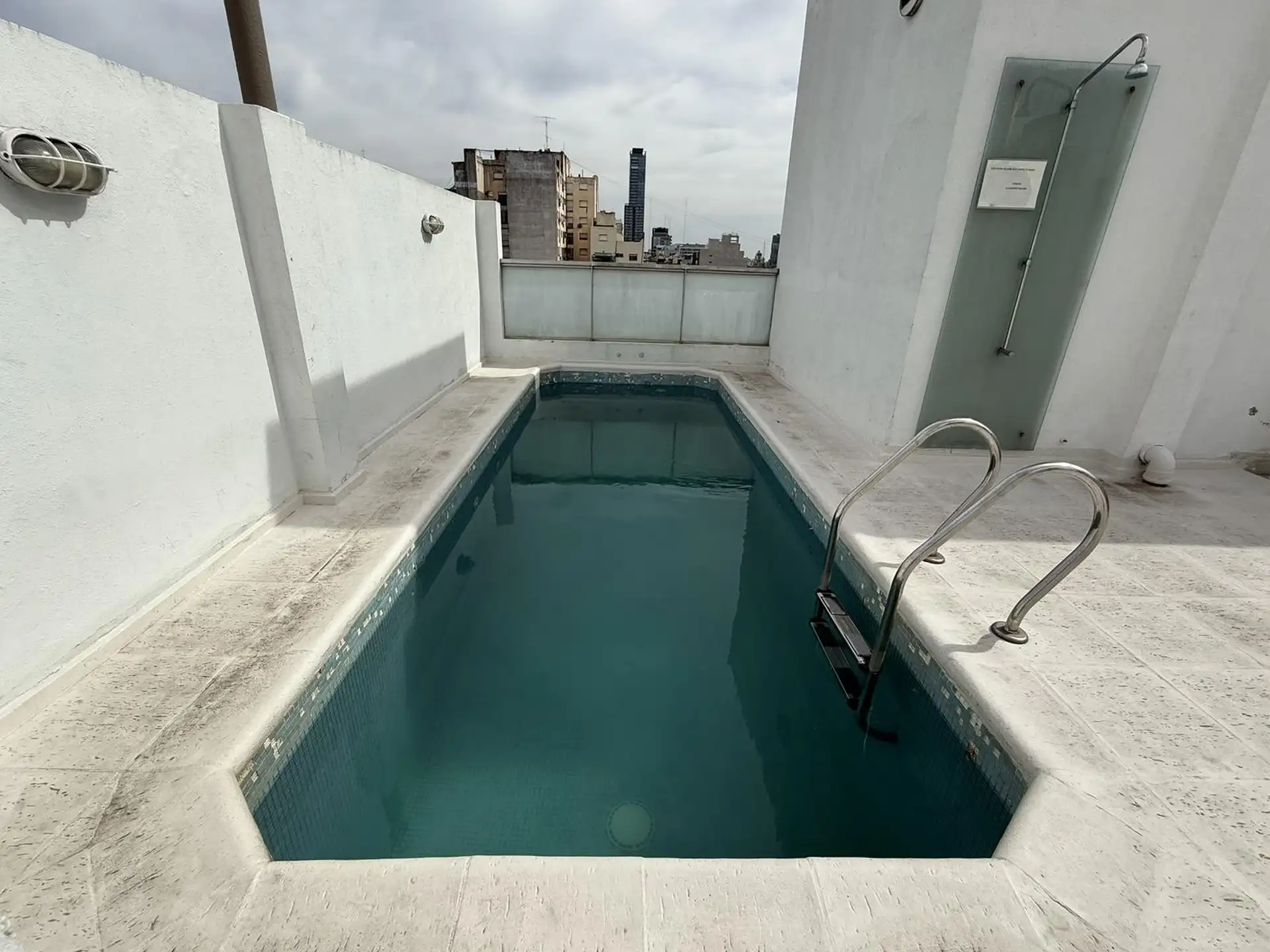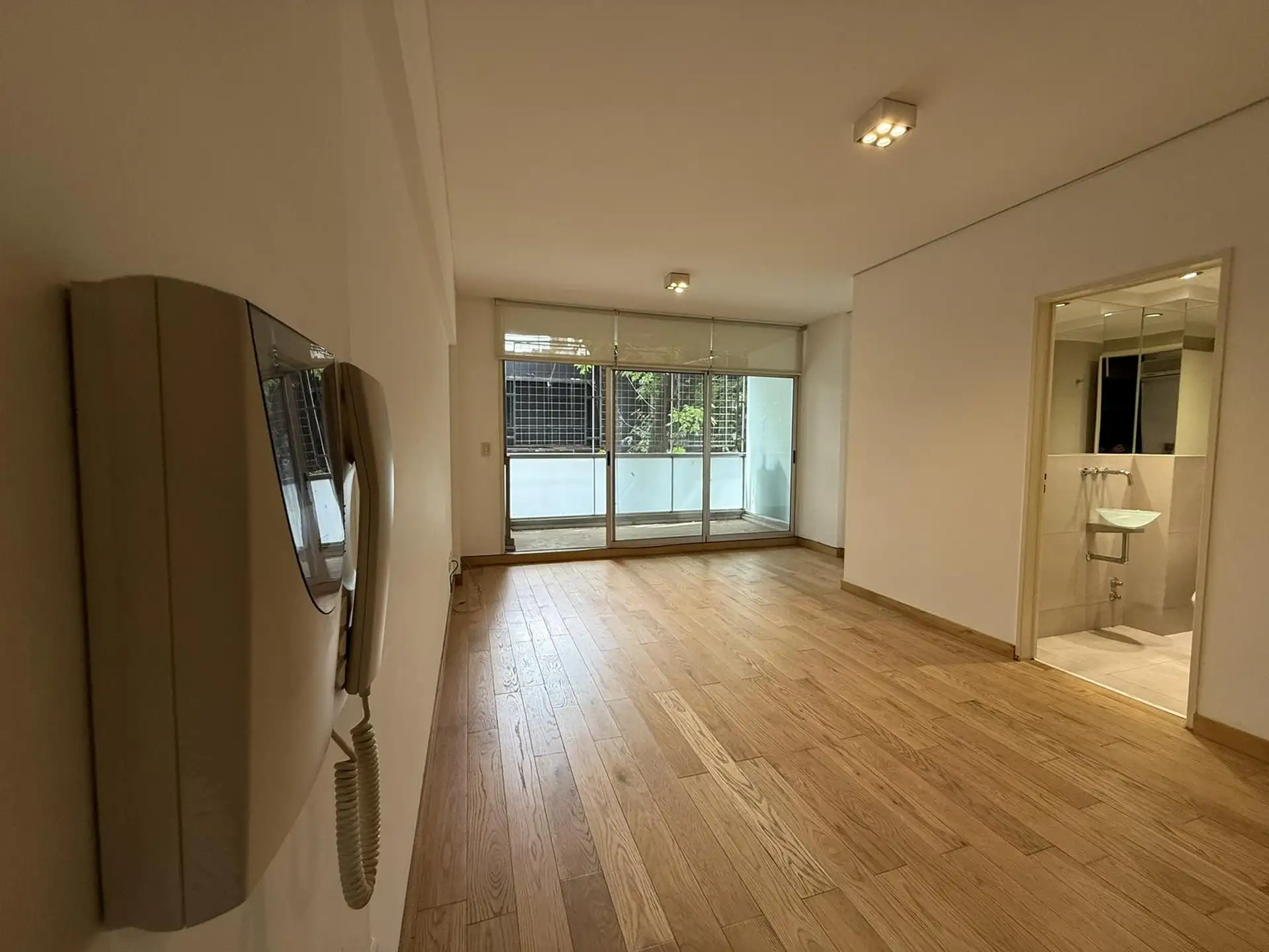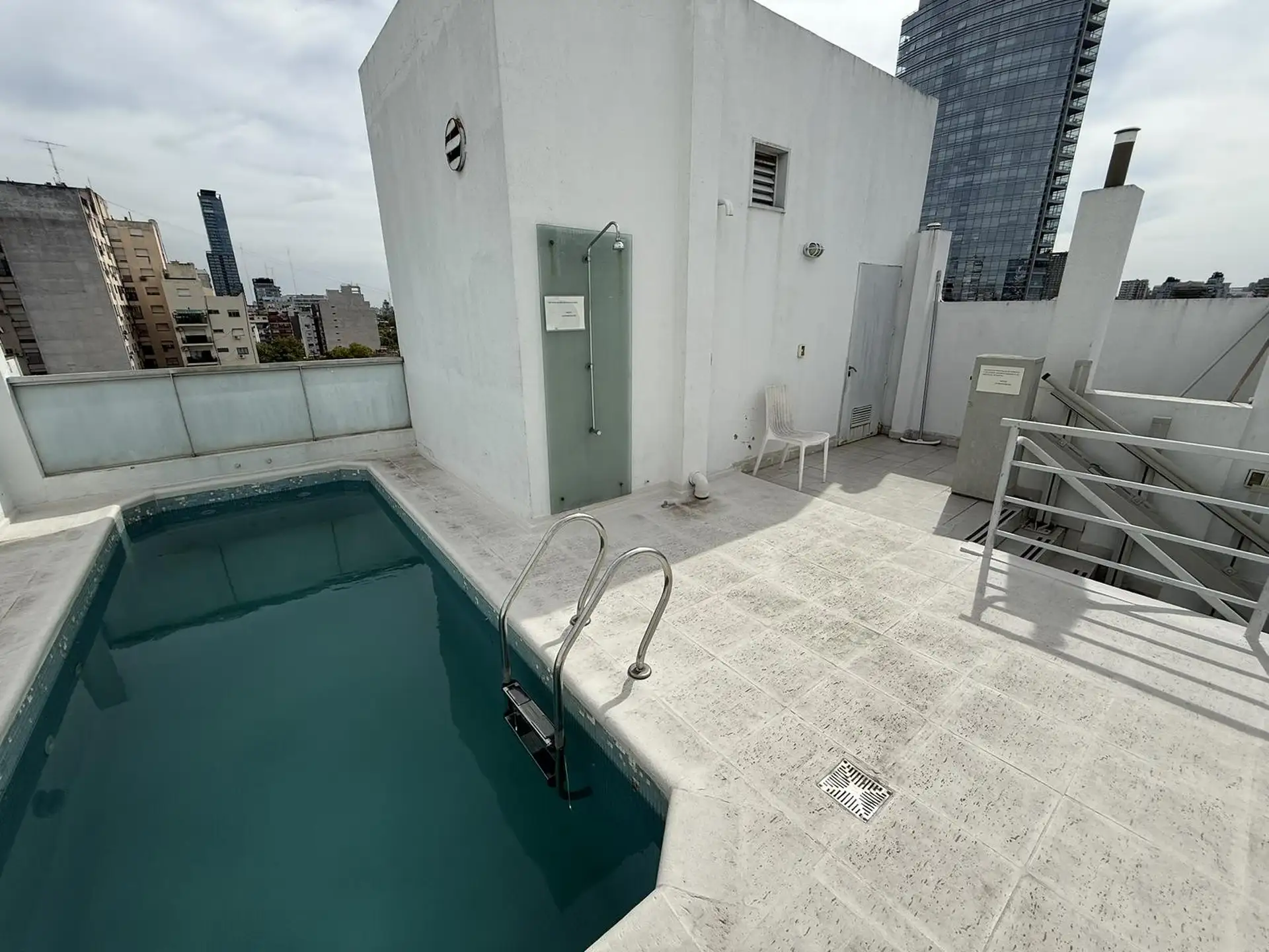 Studio apartment of 45.82 m² in Palermo with an (assigned) parking space. Street-facing unit with balcony with deck. Integrated kitchen and full bathroom plus a separate toilet. The building is under 15 years old and offers pool, solarium with shower, gym, grill, laundry and dry sauna; it also has electronic digital locks. Rental terms include a USD rent and a rental guarantee bond (CABA owner or insurance caución). The unit is on Beruti at 4500, a few metres from La Rural, with access via Subte