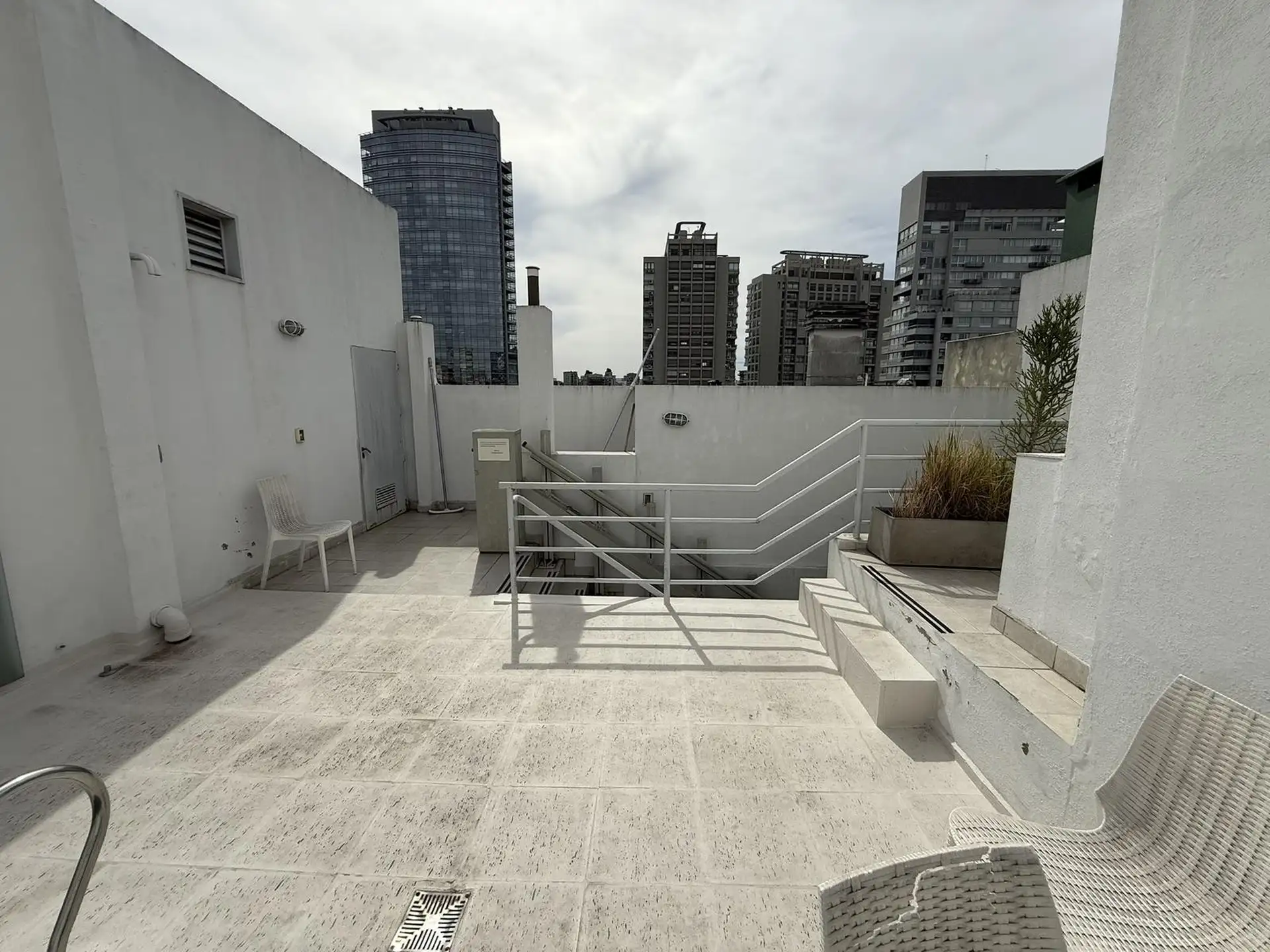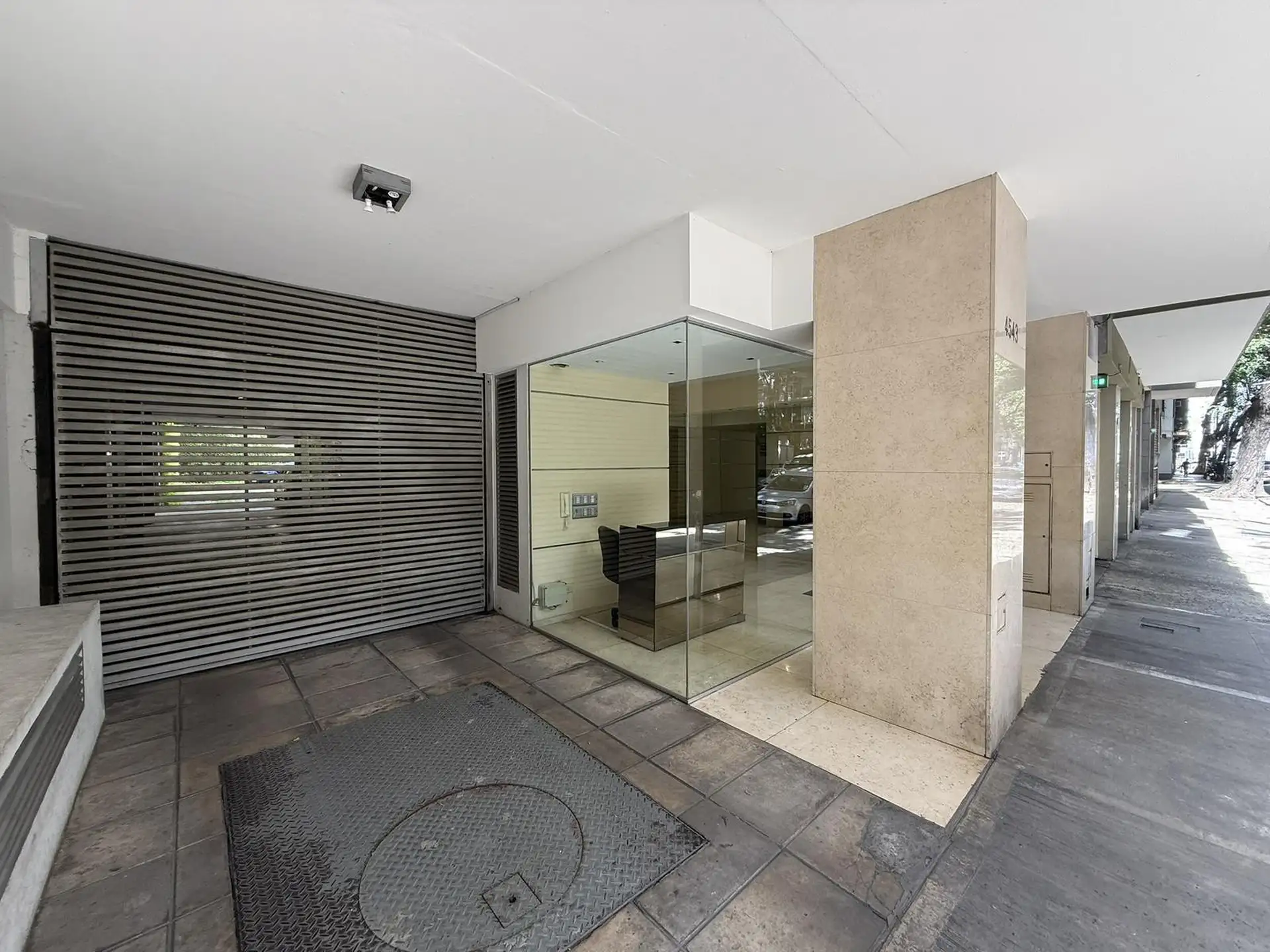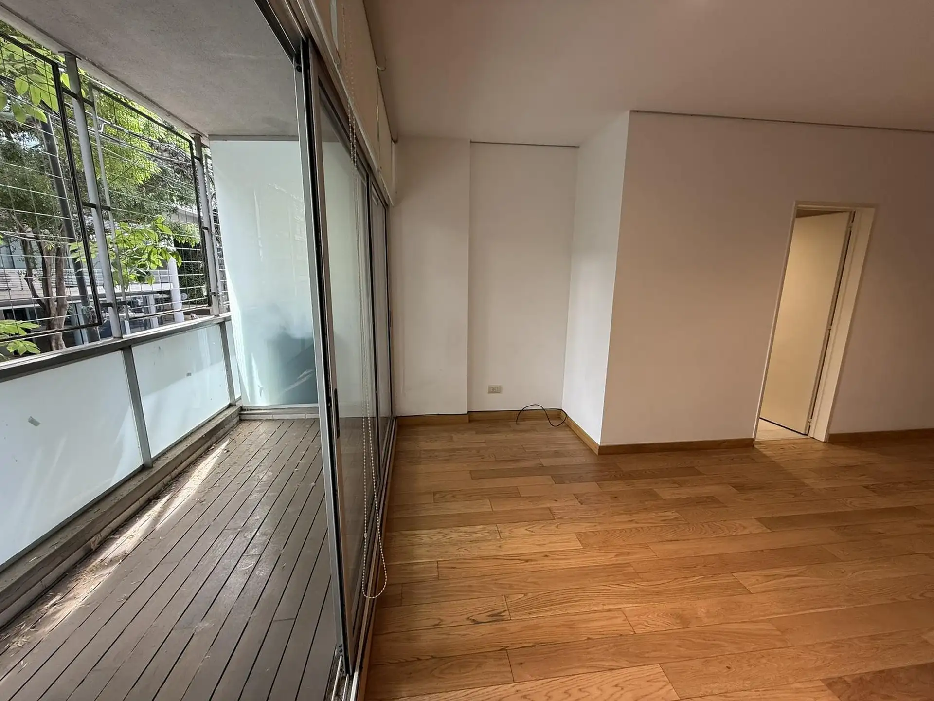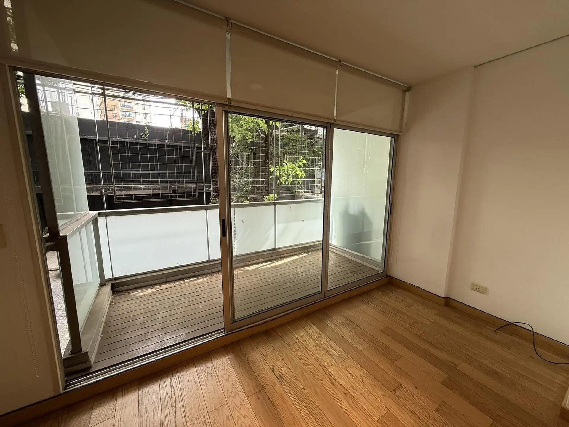 Studio apartment of 45.82 m² in Palermo with an (assigned) parking space. Street-facing unit with balcony with deck. Integrated kitchen and full bathroom plus a separate toilet. The building is under 15 years old and offers pool, solarium with shower, gym, grill, laundry and dry sauna; it also has electronic digital locks. Rental terms include a USD rent and a rental guarantee bond (CABA owner or insurance caución). The unit is on Beruti at 4500, a few metres from La Rural, with access via Subte