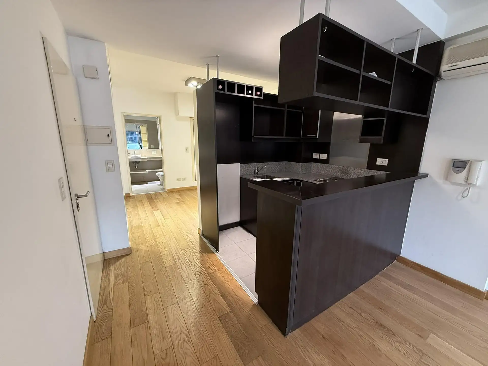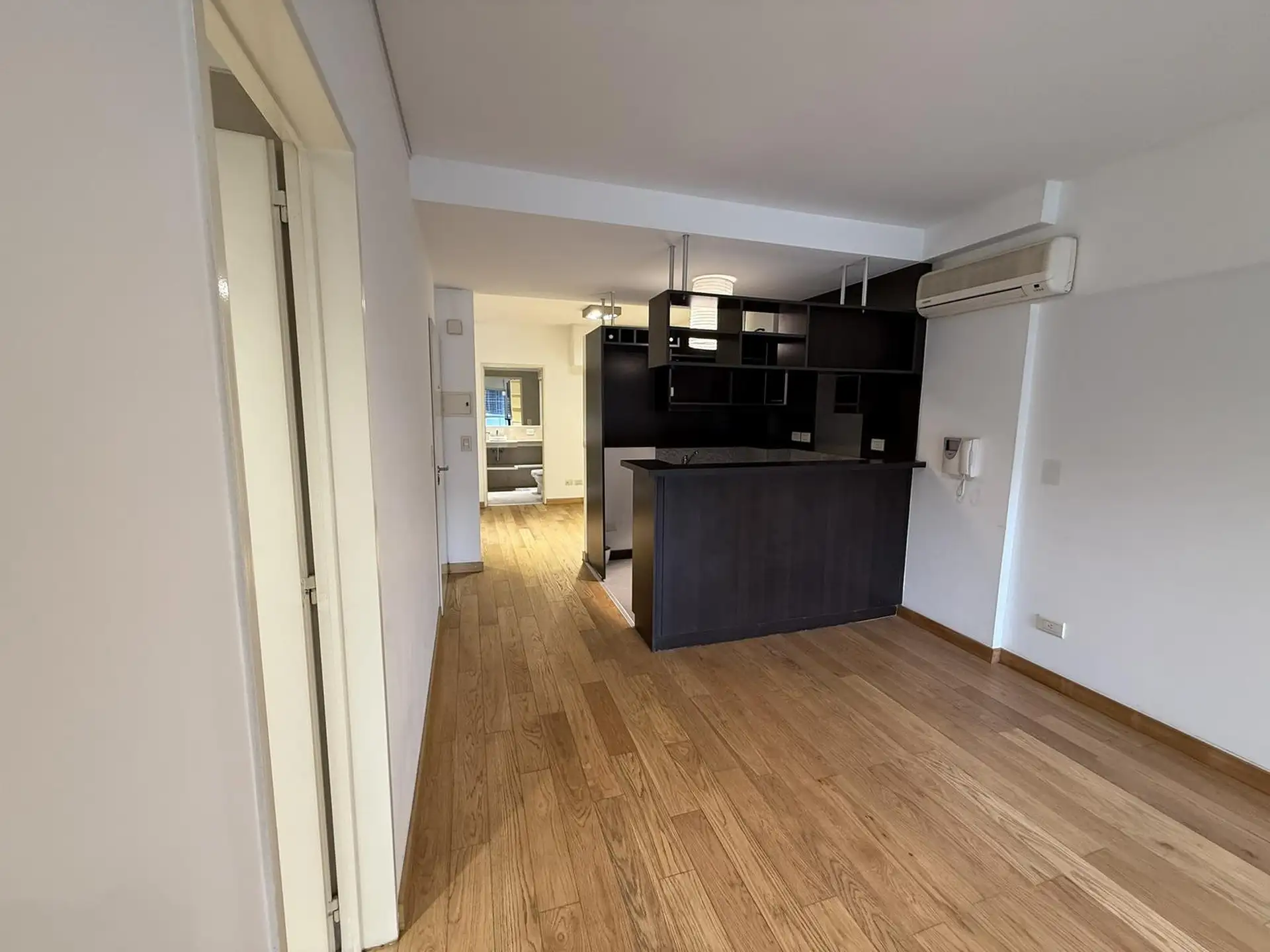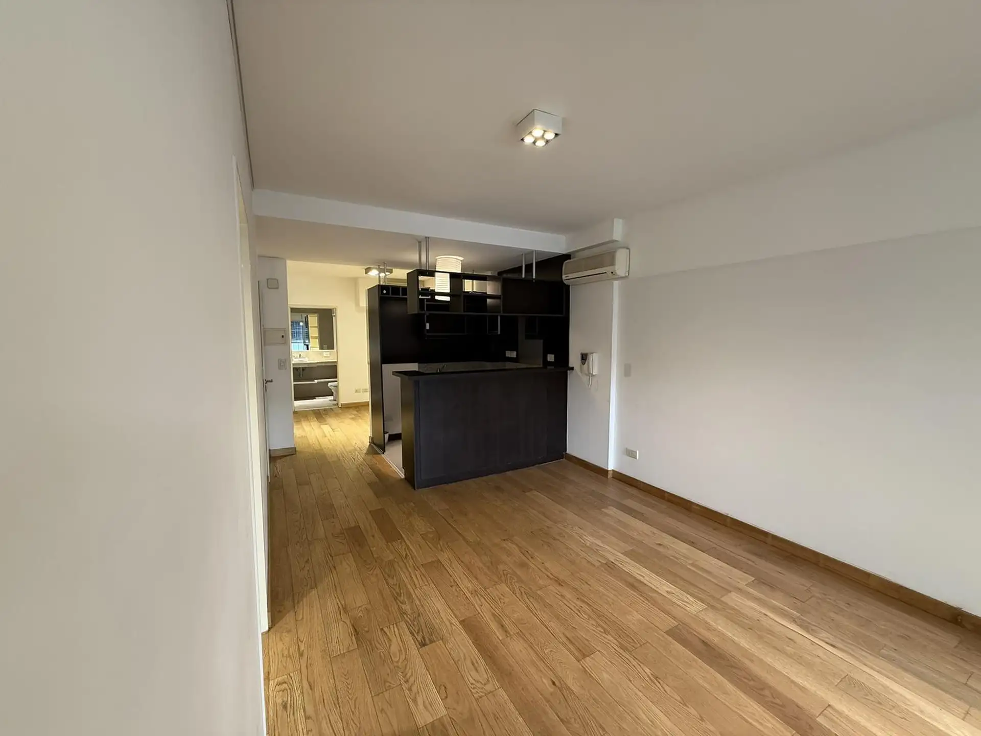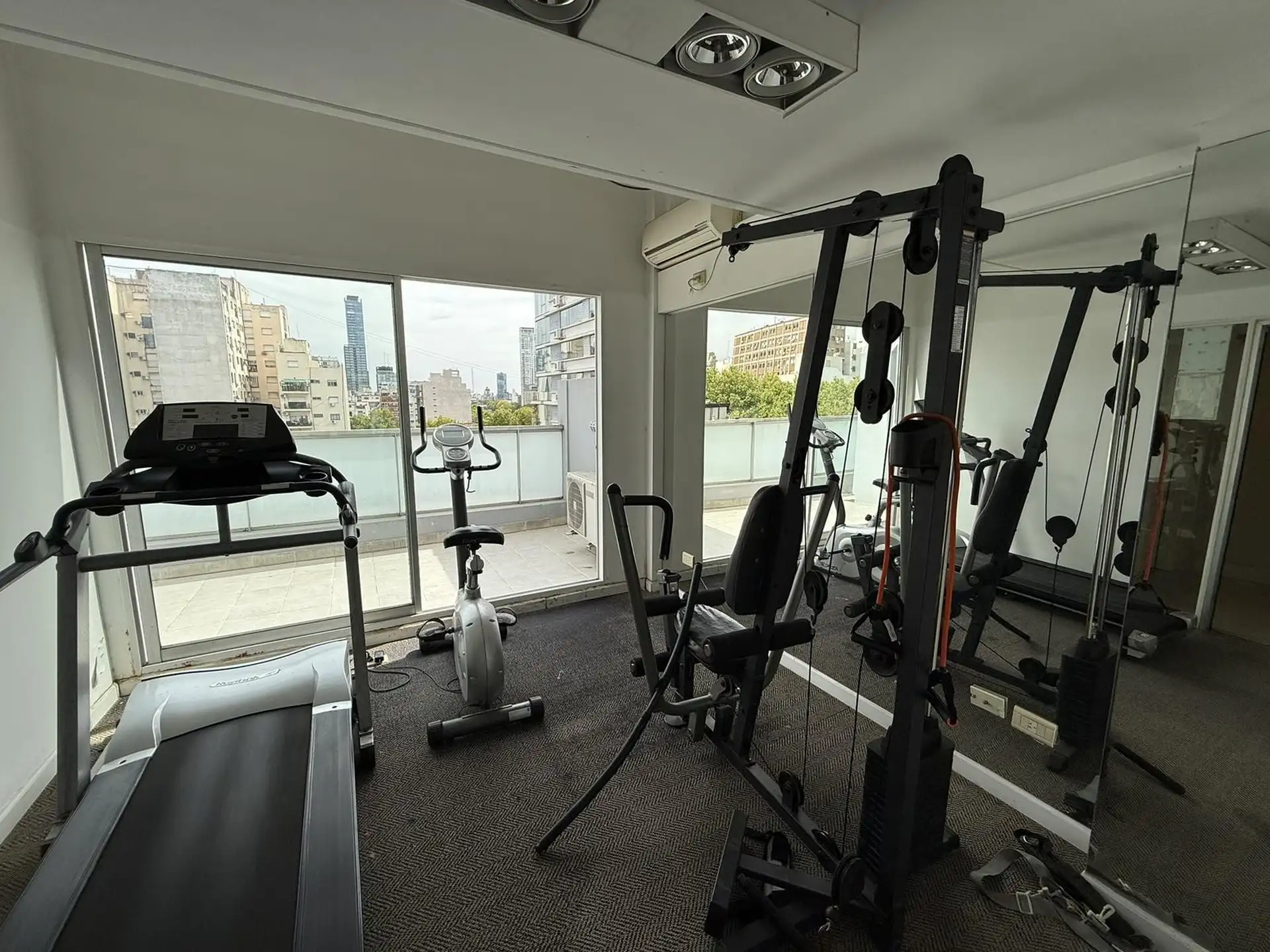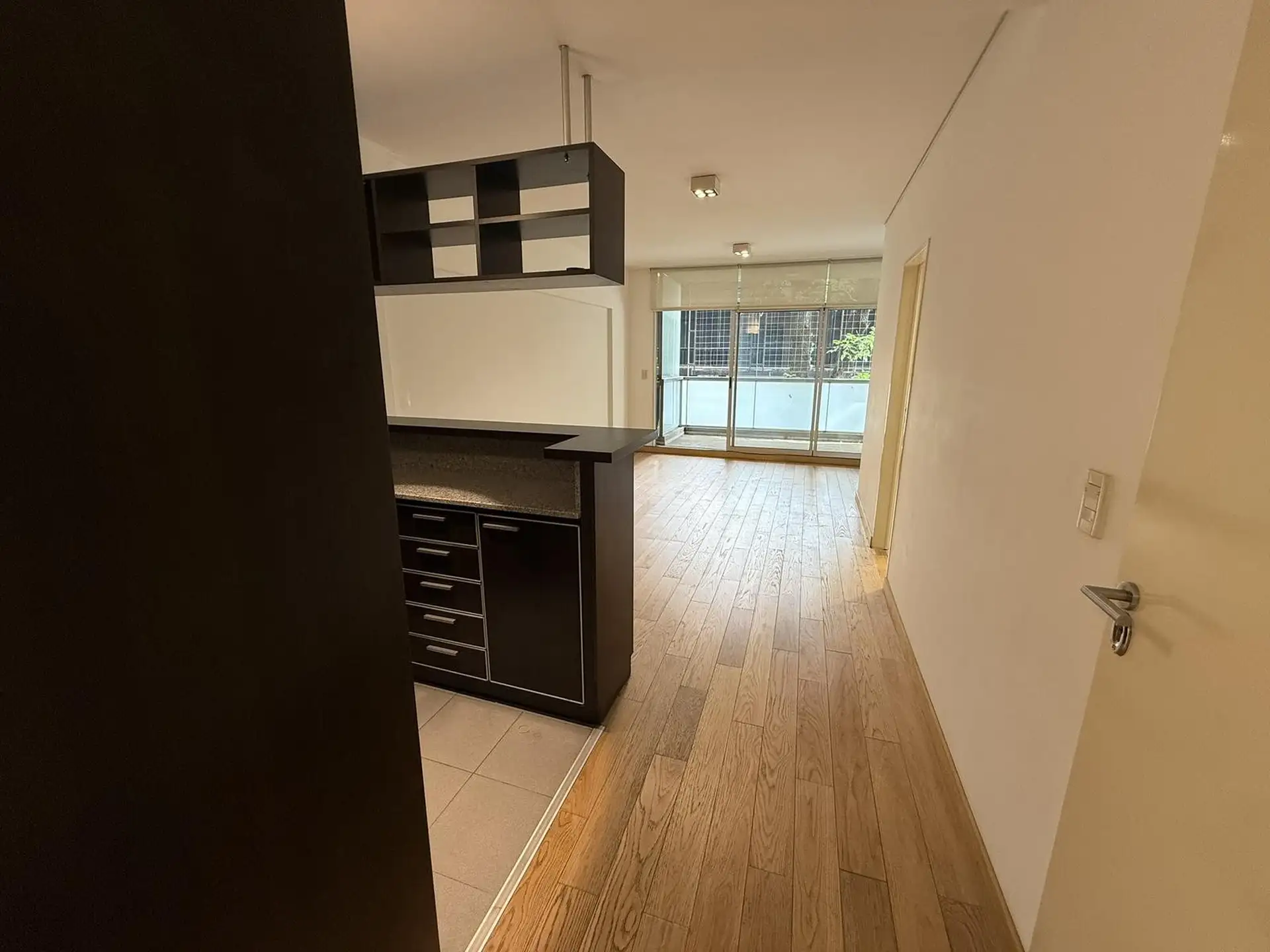 Studio apartment of 45.82 m² in Palermo with an (assigned) parking space. Street-facing unit with balcony with deck. Integrated kitchen and full bathroom plus a separate toilet. The building is under 15 years old and offers pool, solarium with shower, gym, grill, laundry and dry sauna; it also has electronic digital locks. Rental terms include a USD rent and a rental guarantee bond (CABA owner or insurance caución). The unit is on Beruti at 4500, a few metres from La Rural, with access via Subte