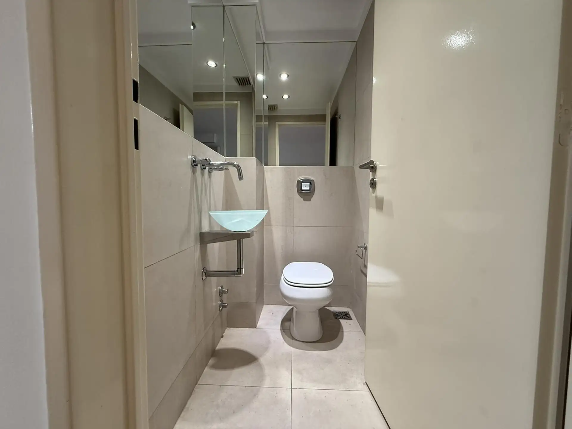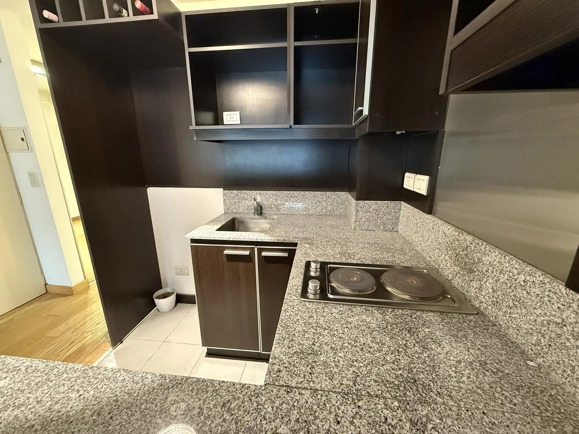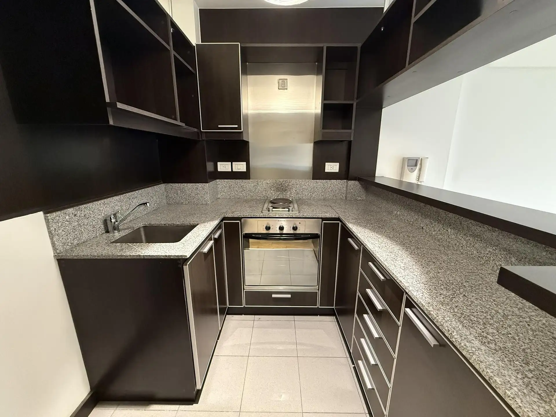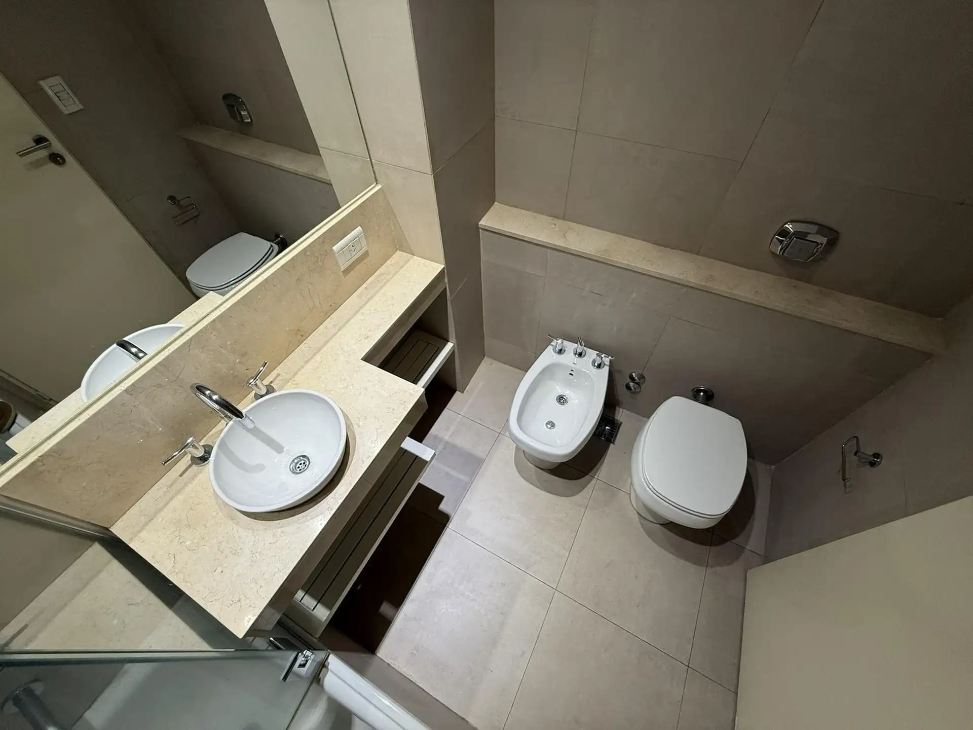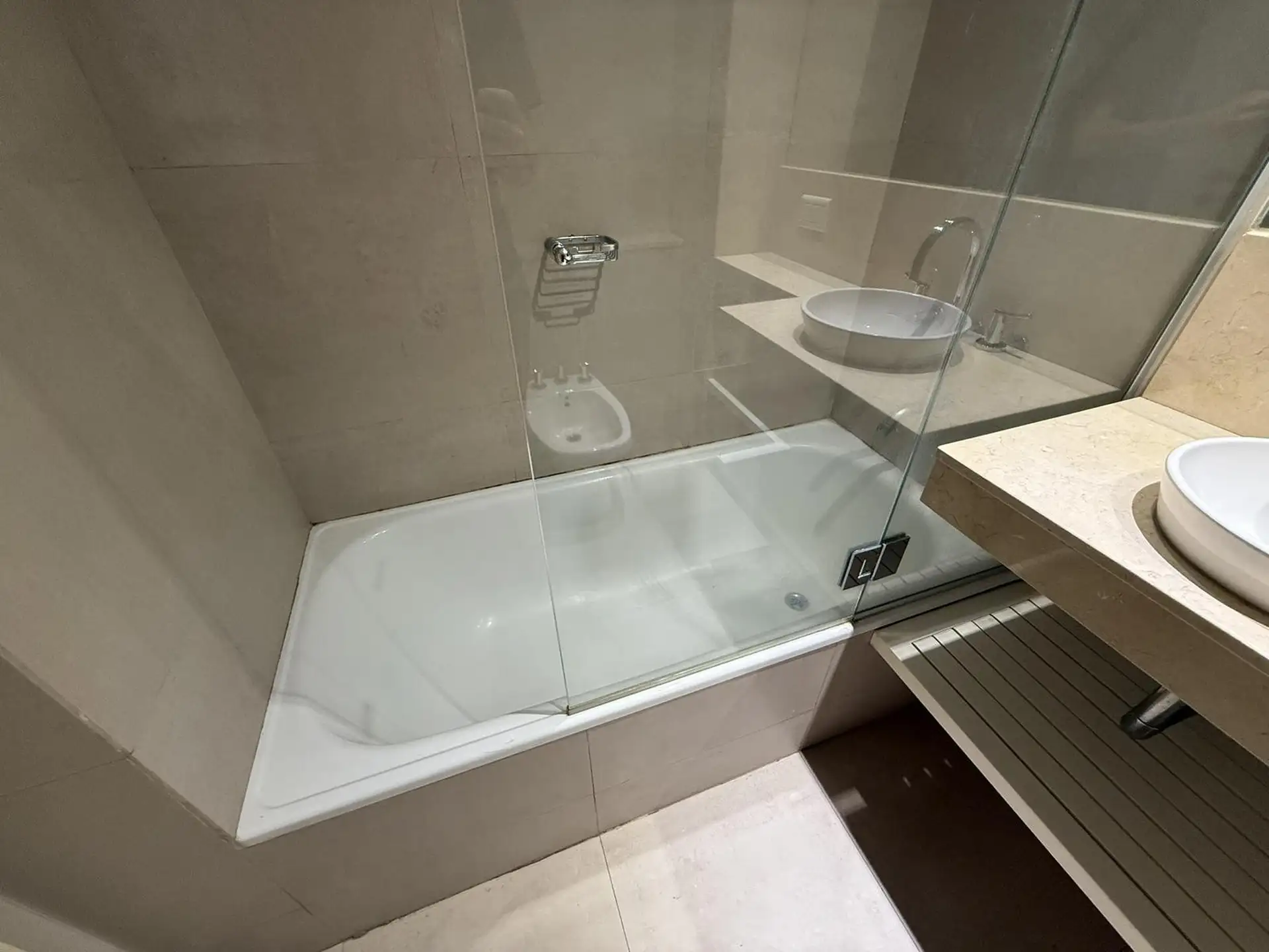 Studio apartment of 45.82 m² in Palermo with an (assigned) parking space. Street-facing unit with balcony with deck. Integrated kitchen and full bathroom plus a separate toilet. The building is under 15 years old and offers pool, solarium with shower, gym, grill, laundry and dry sauna; it also has electronic digital locks. Rental terms include a USD rent and a rental guarantee bond (CABA owner or insurance caución). The unit is on Beruti at 4500, a few metres from La Rural, with access via Subte