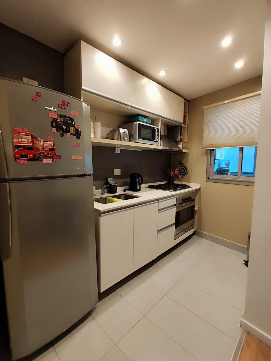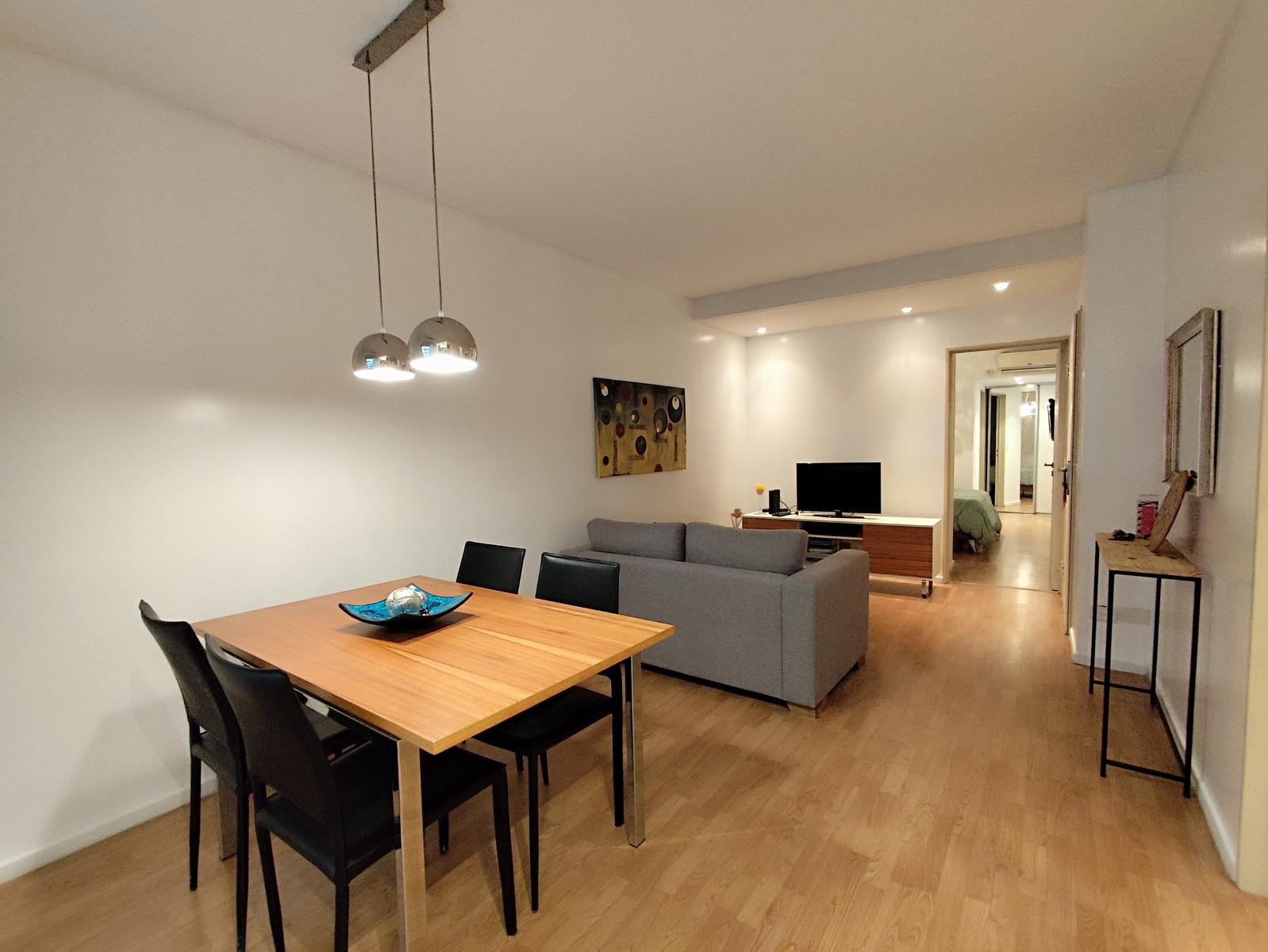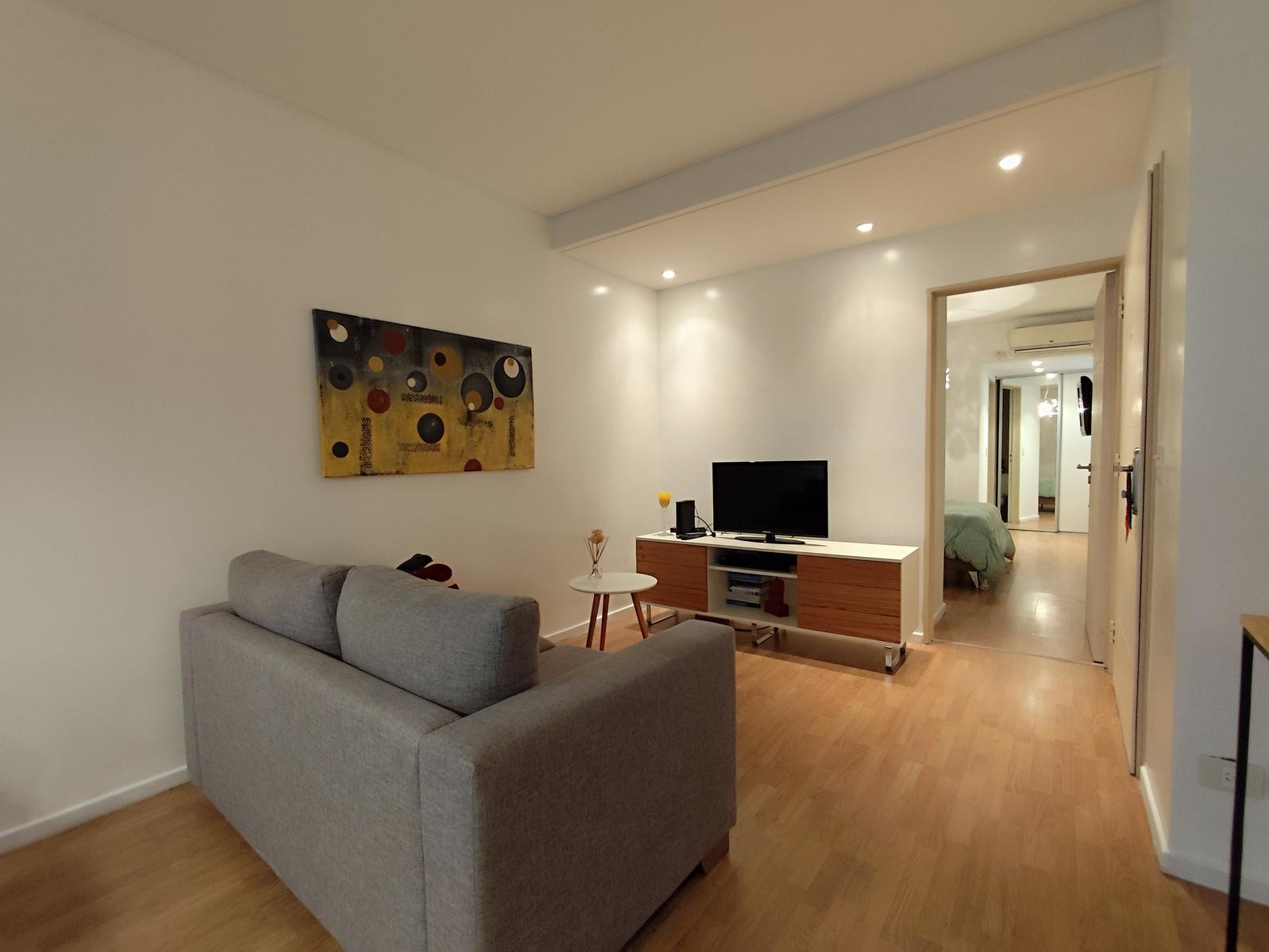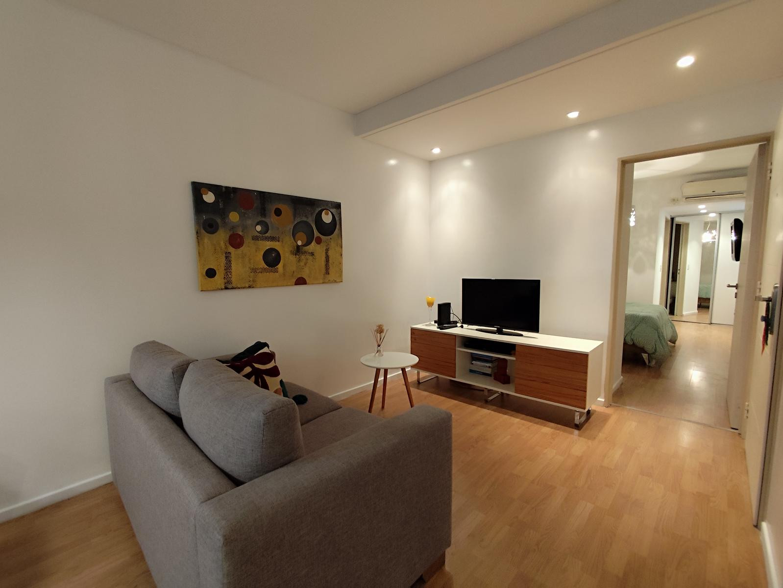 Two-room apartment in Palermo with a terrace balcony, located on the streets of local bus lines and two blocks from estación Scalabrini Ortiz (Subte Línea D). The unit has a living-dining area with sofa, 32-inch TV, a dining table for four and air conditioning. The kitchenette is semi-integrated and includes a gas hob and oven, extractor, fridge with no-frost freezer, electric kettle and microwave, with space to install a washing machine. There is a guest toilet and an en-suite bedroom with dre