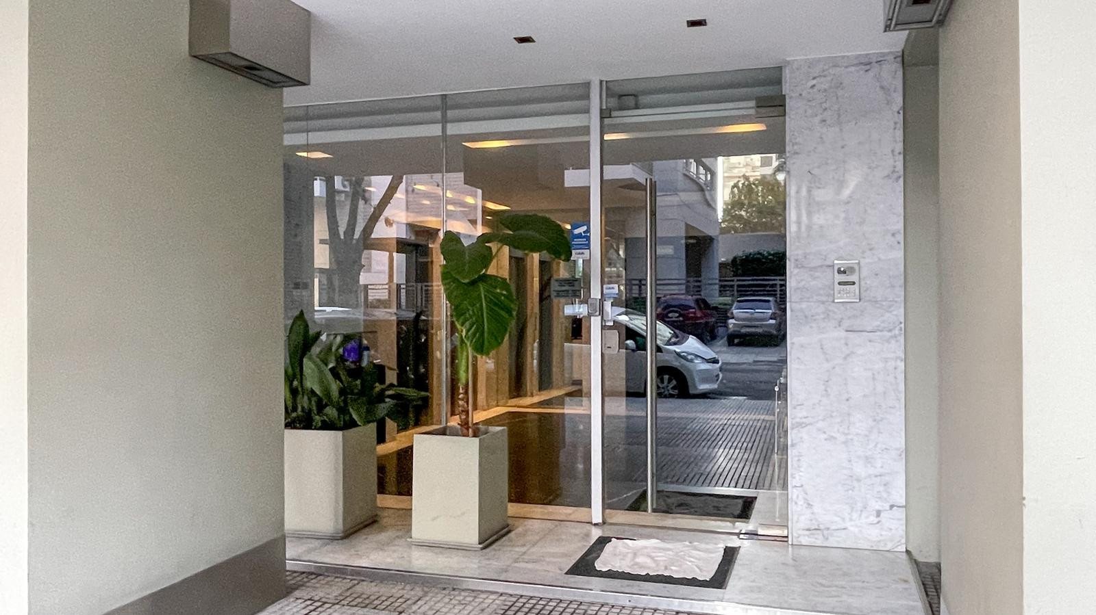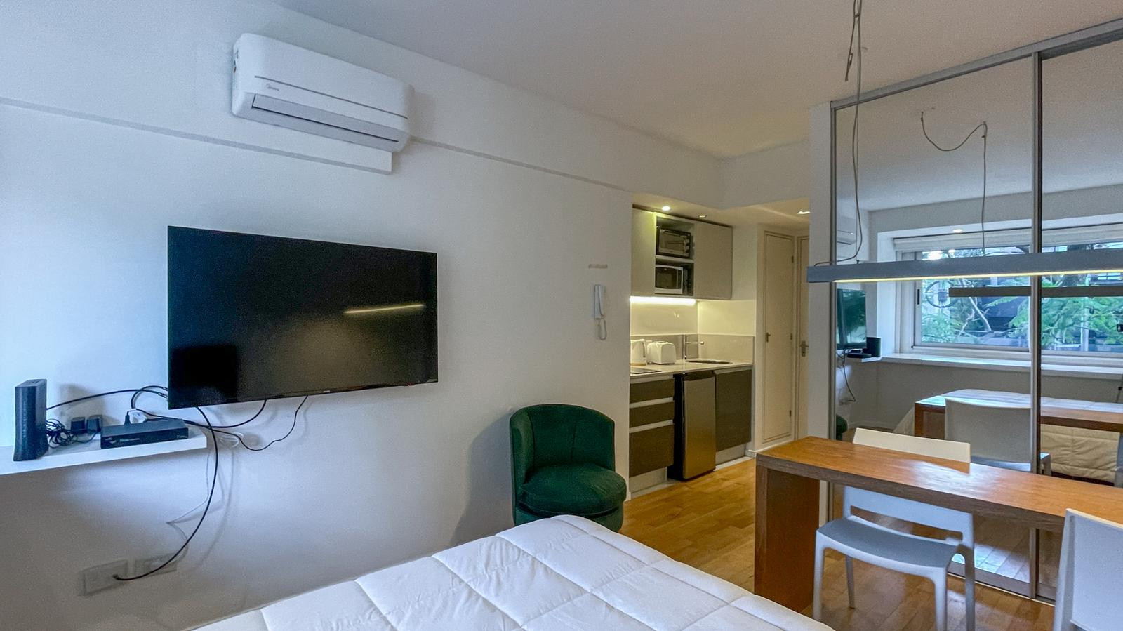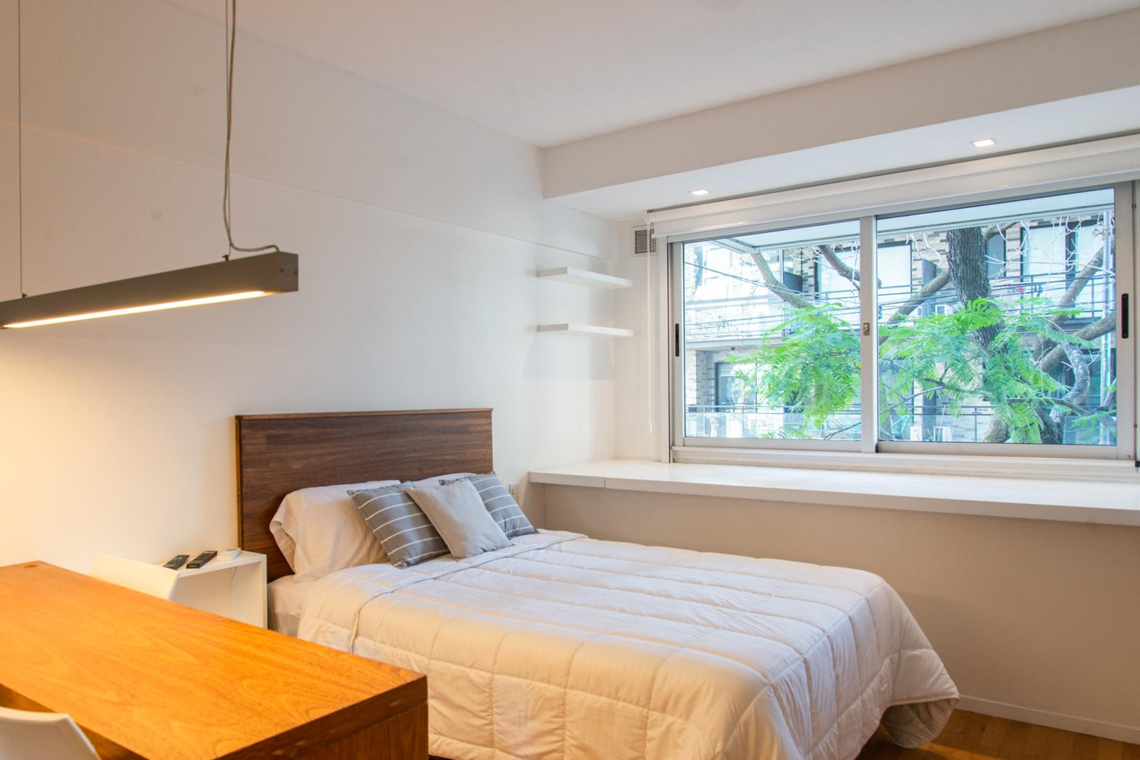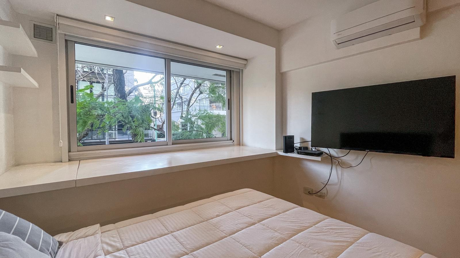 Studio apartment in the Suites & Studios building in Palermo’s Las Cañitas area. The unit has double-glazed windows? (not stated), wood floors in the living area and bedroom, porcelain tile in the bathroom and a Silestone countertop, with an electric oven and a heating/cooling air-conditioning unit (F/C). The building has security cameras, a laundry area, a communal room (SUM), two grills on a rooftop terrace for outdoor meals, a pool and a solarium. Rent excludes building fees and utilities; th