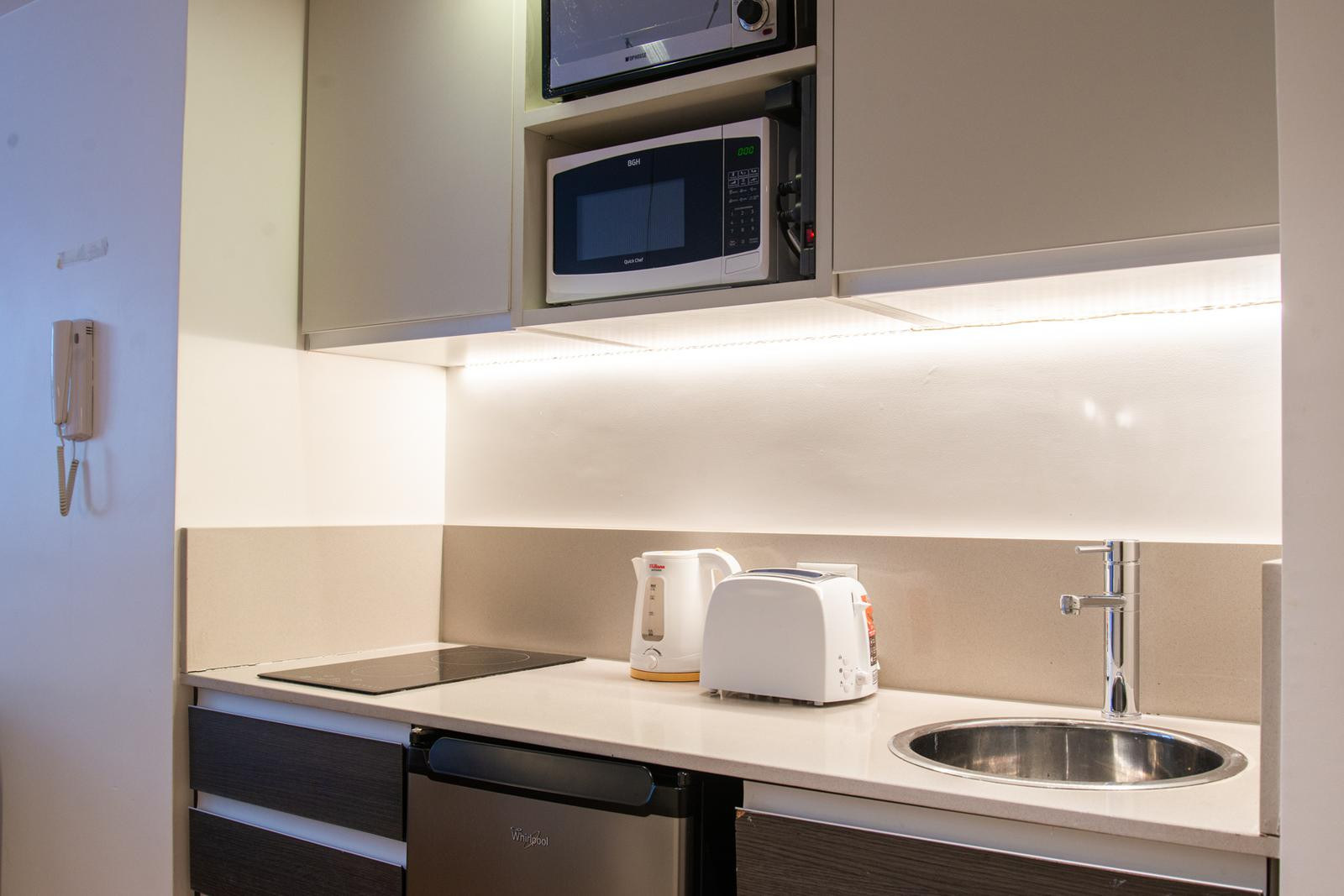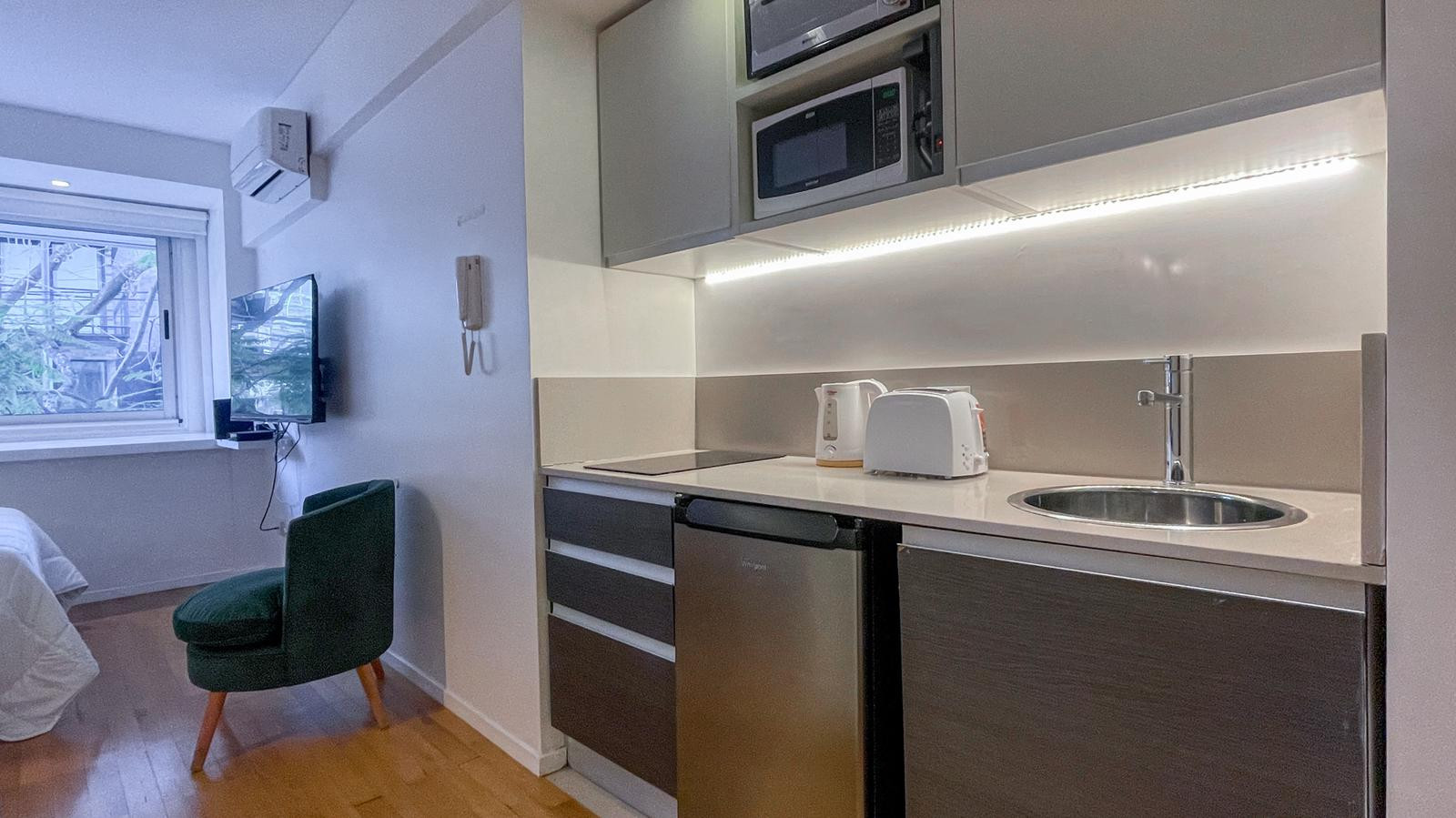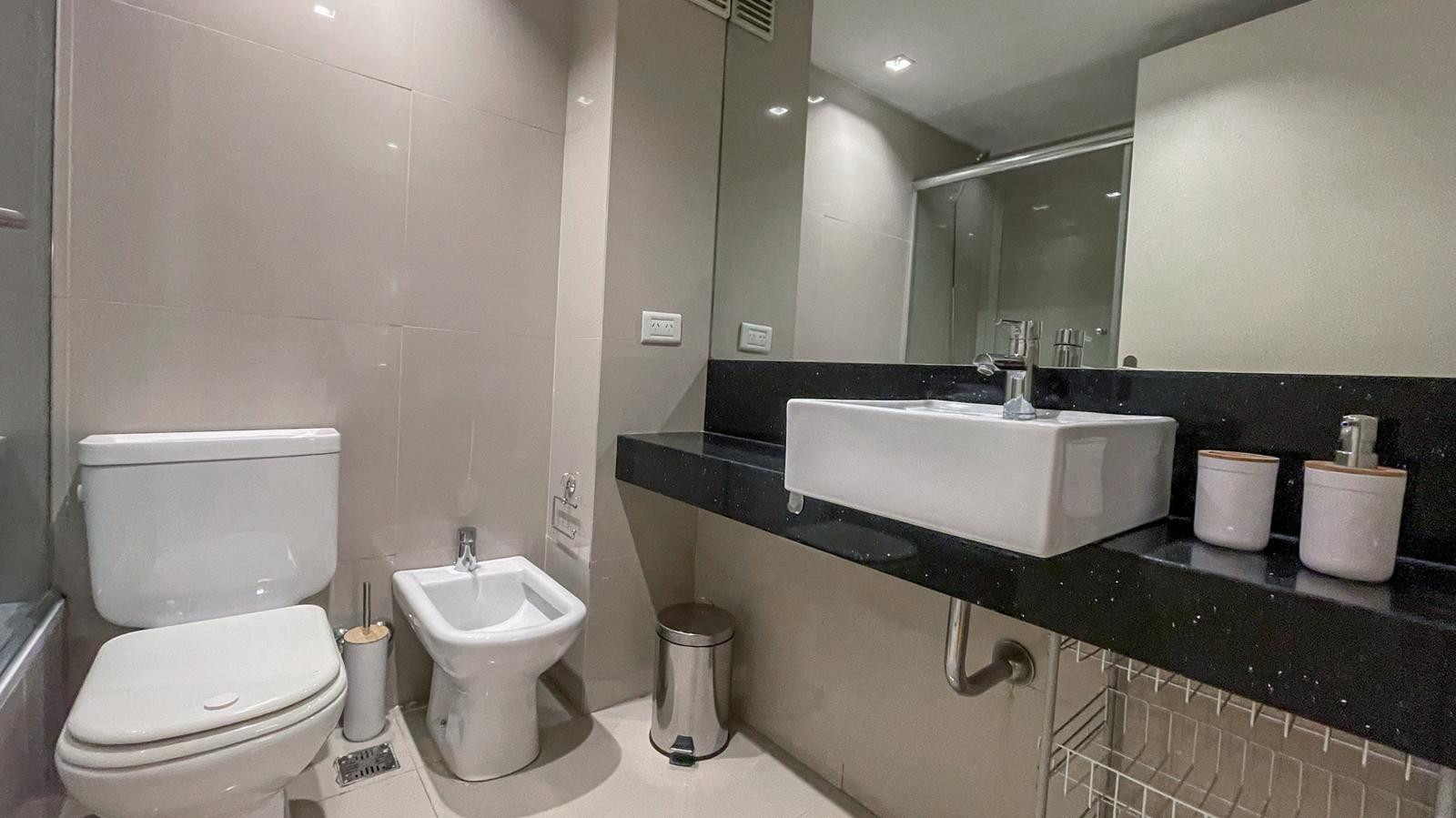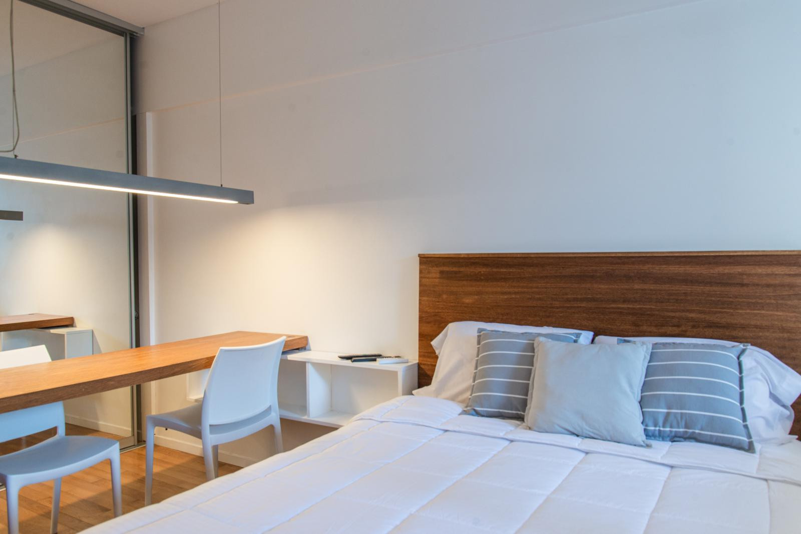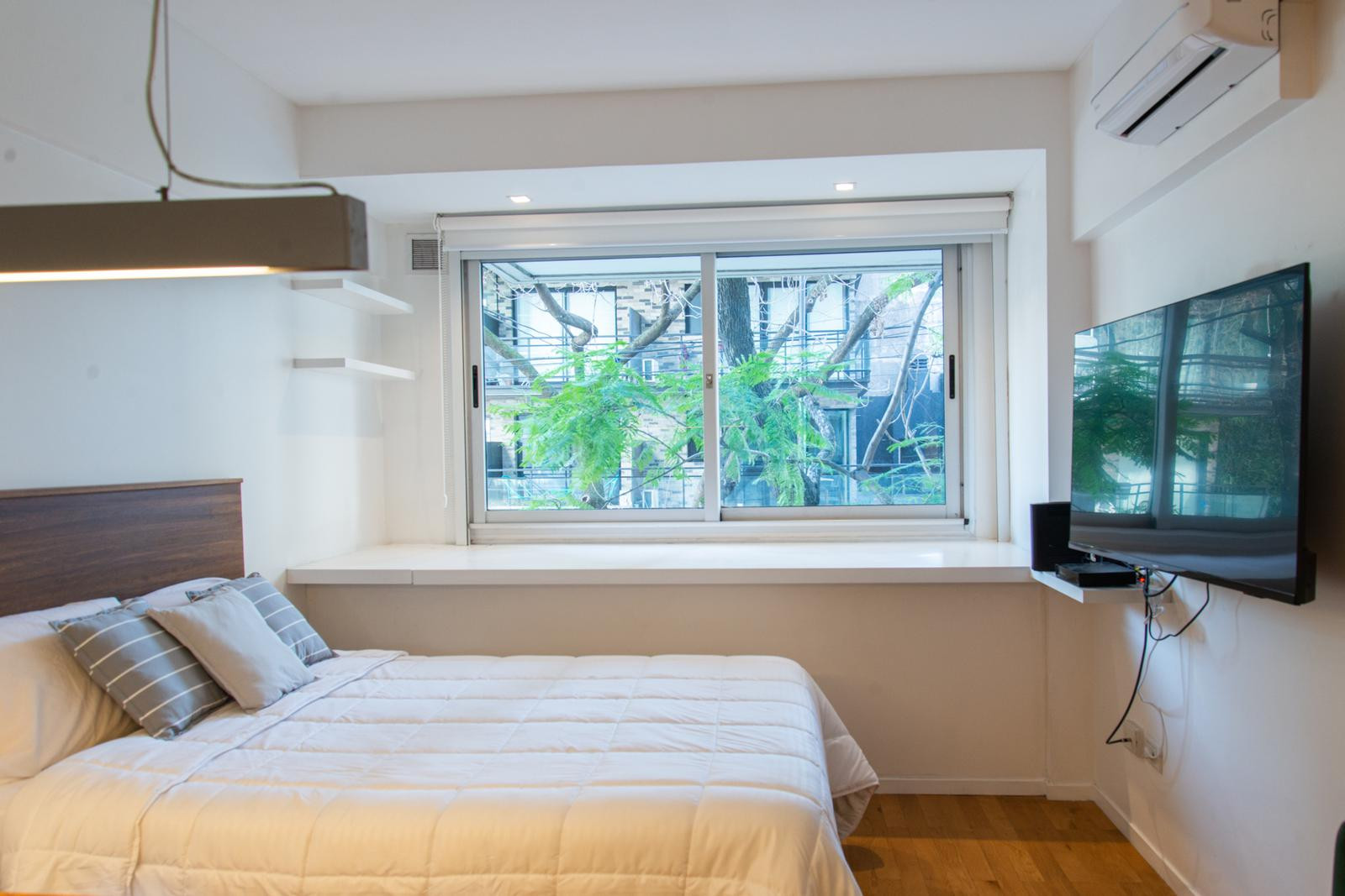 Studio apartment in the Suites & Studios building in Palermo’s Las Cañitas area. The unit has double-glazed windows? (not stated), wood floors in the living area and bedroom, porcelain tile in the bathroom and a Silestone countertop, with an electric oven and a heating/cooling air-conditioning unit (F/C). The building has security cameras, a laundry area, a communal room (SUM), two grills on a rooftop terrace for outdoor meals, a pool and a solarium. Rent excludes building fees and utilities; th