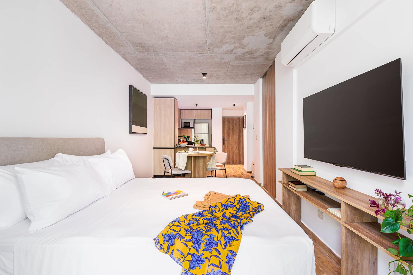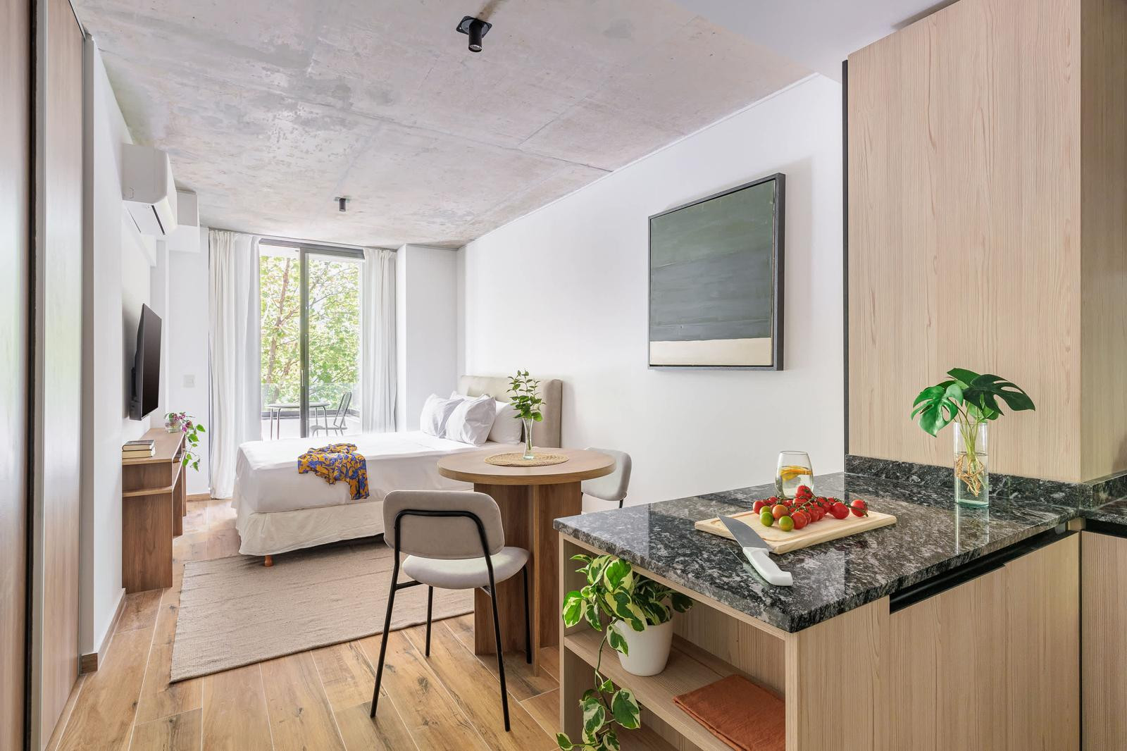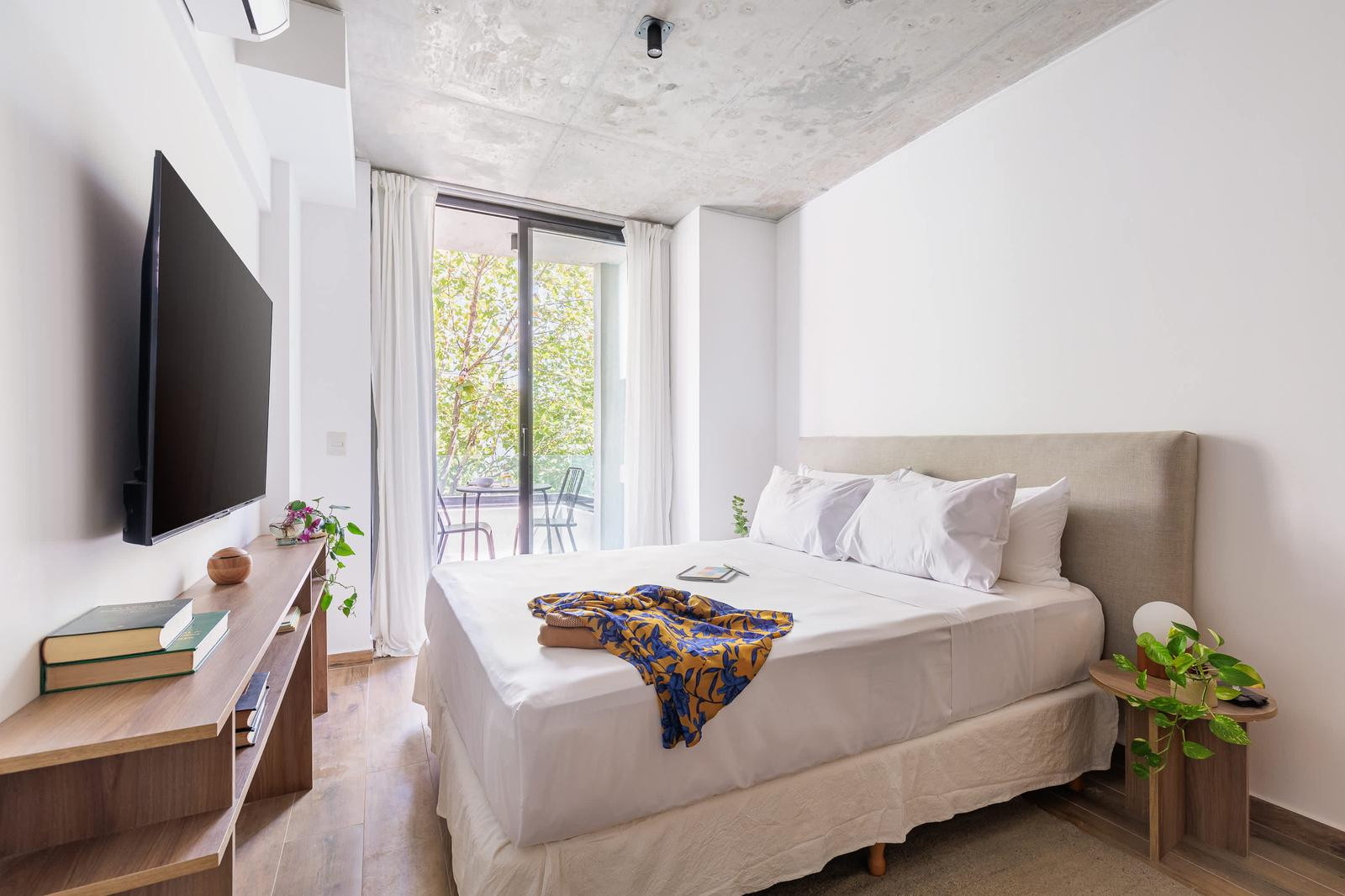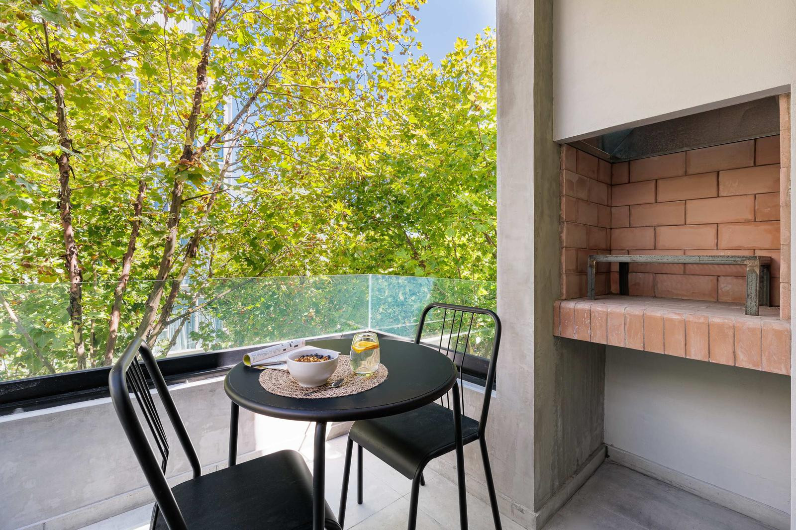 Studio apartment in Palermo with a double bed, equipped kitchen, full bathroom with shower, and a balcony. Services include maintenance, 24-hour assistance, and cleaning. Rent includes gas, ABL, electricity, water, and WiFi, and does not include building fees.