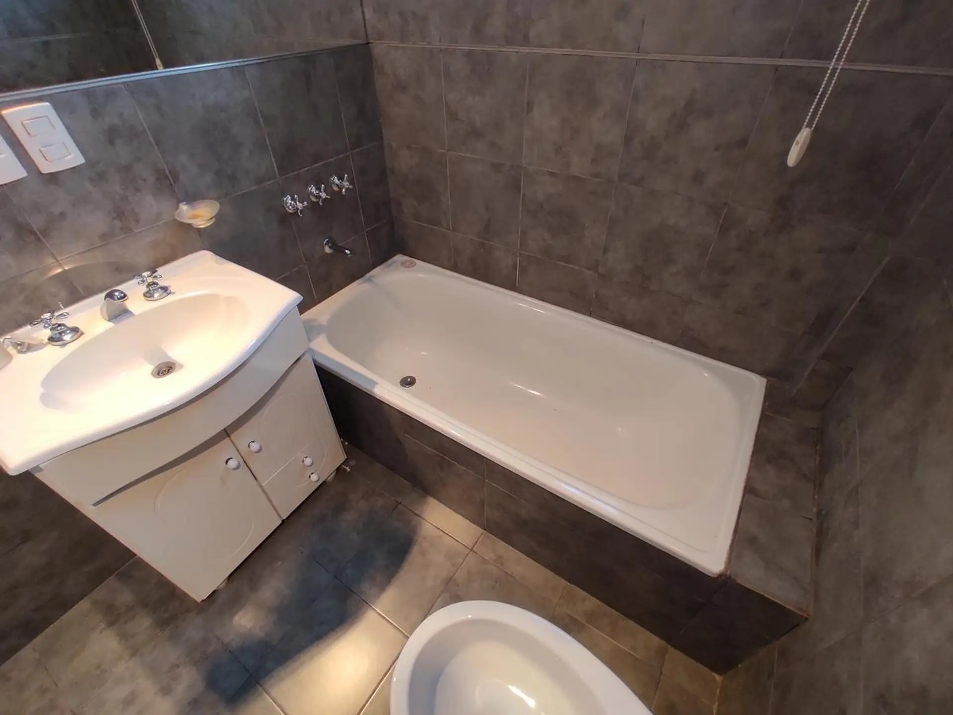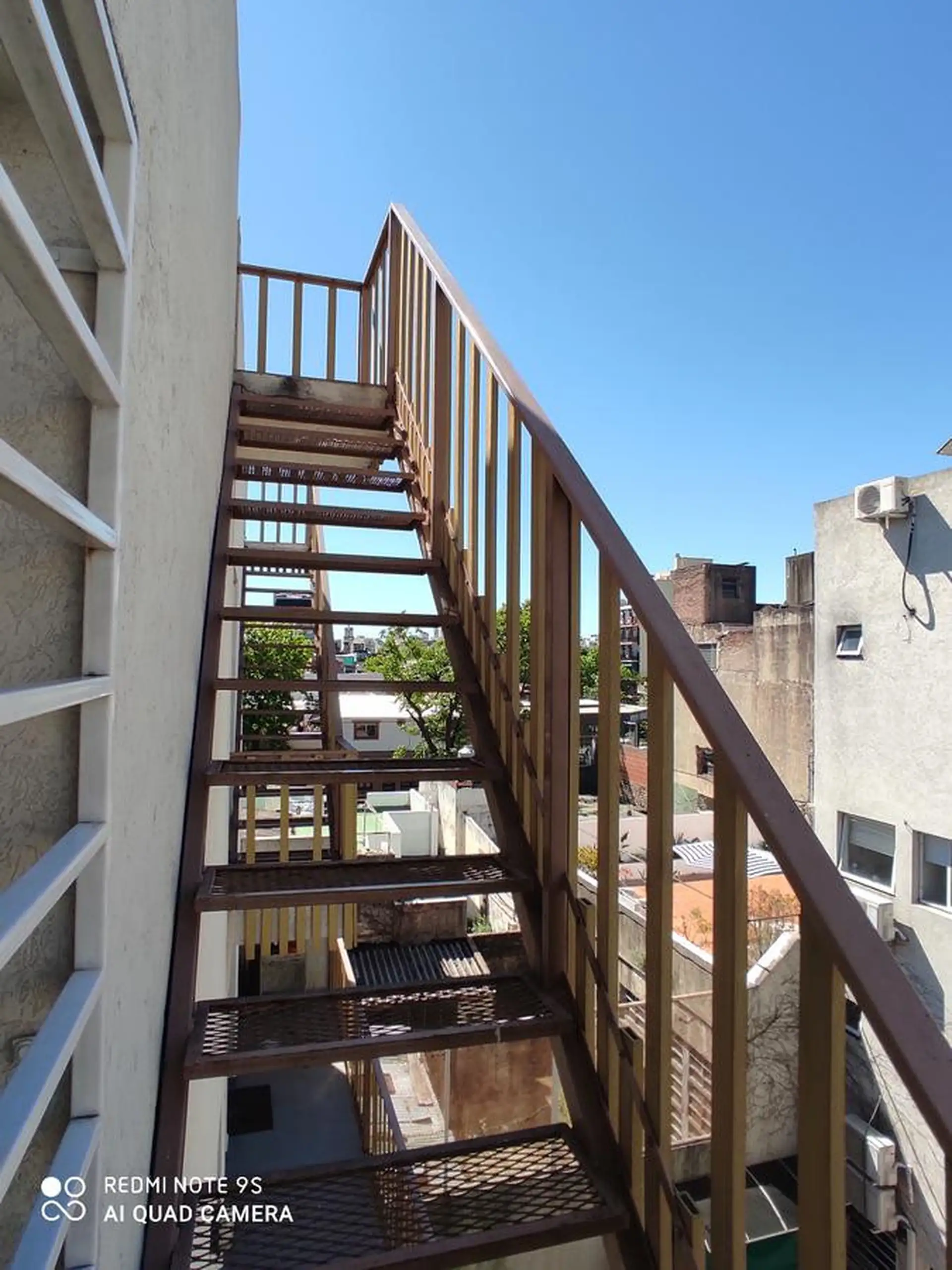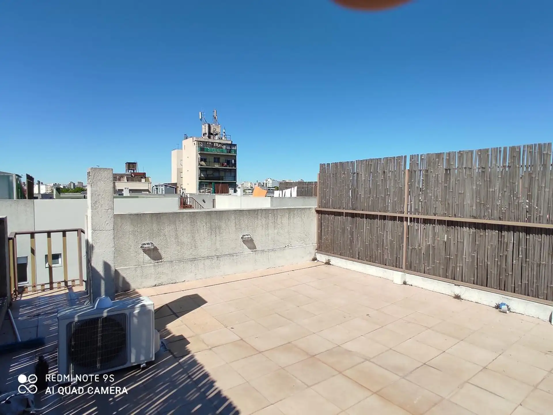 Furnished duplex apartment in Parque Chas, available from 1 June 2026. Two-room layout with 1 bedroom, arranged over three levels: a living-dining room with air conditioning and TV, semi-integrated electric kitchen with fridge with freezer, electric hob and oven, and space for a washing machine; a guest toilet on the first level; a bedroom with air conditioning and storage space, plus a full bathroom and a small balcony with stairs to the third level. The third level has a private uncovered terr