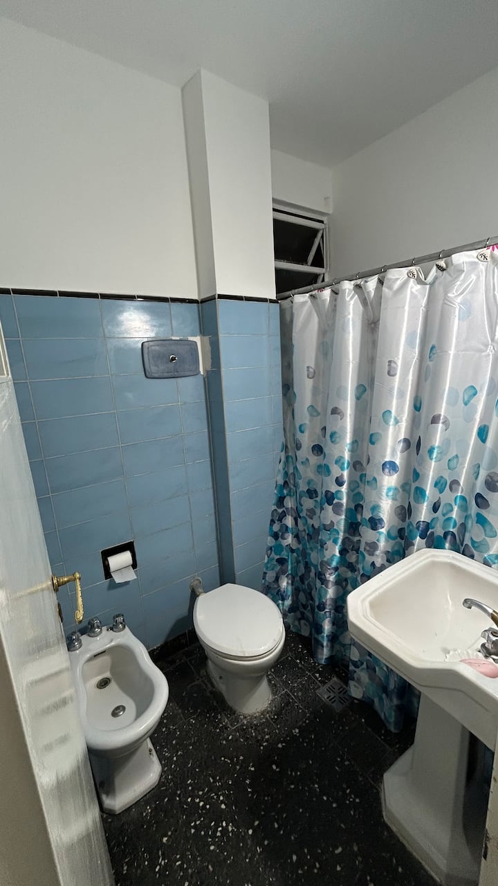 Apartment in Parque Chas with 1 bedroom, a living room, a full kitchen and 1 bathroom. It is on the second floor accessed by stairs. A crib and a baby bath are available if required. The listing places it a few metres from the subway, bus routes and the railway, with access to public transport across Buenos Aires.