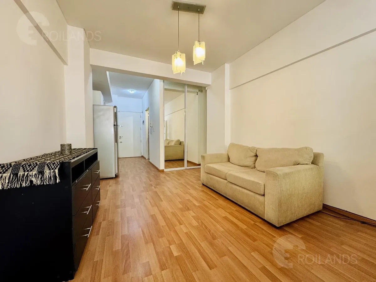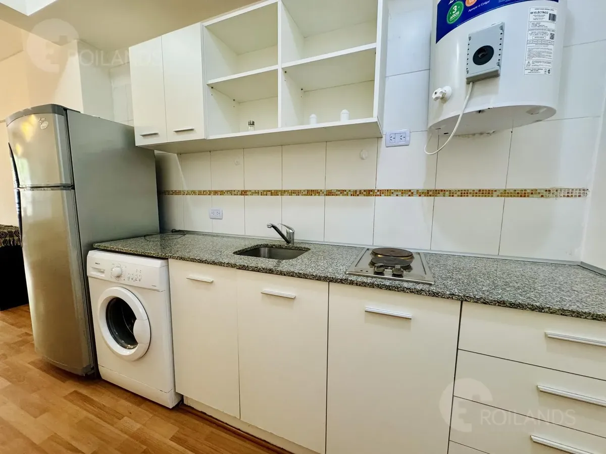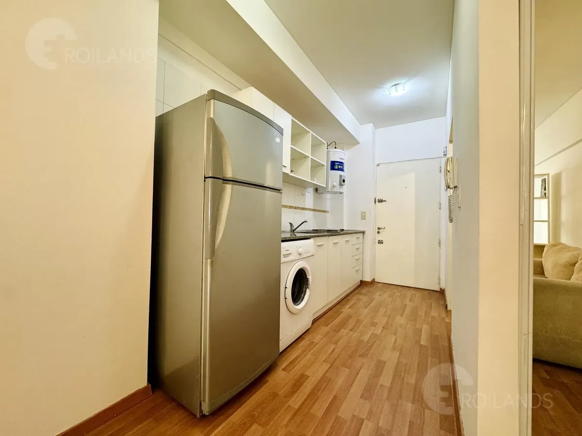 Studio apartment with an internal division for a living-dining area and a separate sleeping area, with a balcony facing the street. Fully furnished. The kitchen includes a fridge, electric water heater, and a two-burner electric cooktop, plus an upper cabinet, base cabinets and a washer. The unit has a wardrobe with mirrored doors, a two-seat sofa and a dresser. Lighting is installed in all areas, with roller blackout curtains. The sleeping area includes a queen-size bed and a cold/hot air-condi
