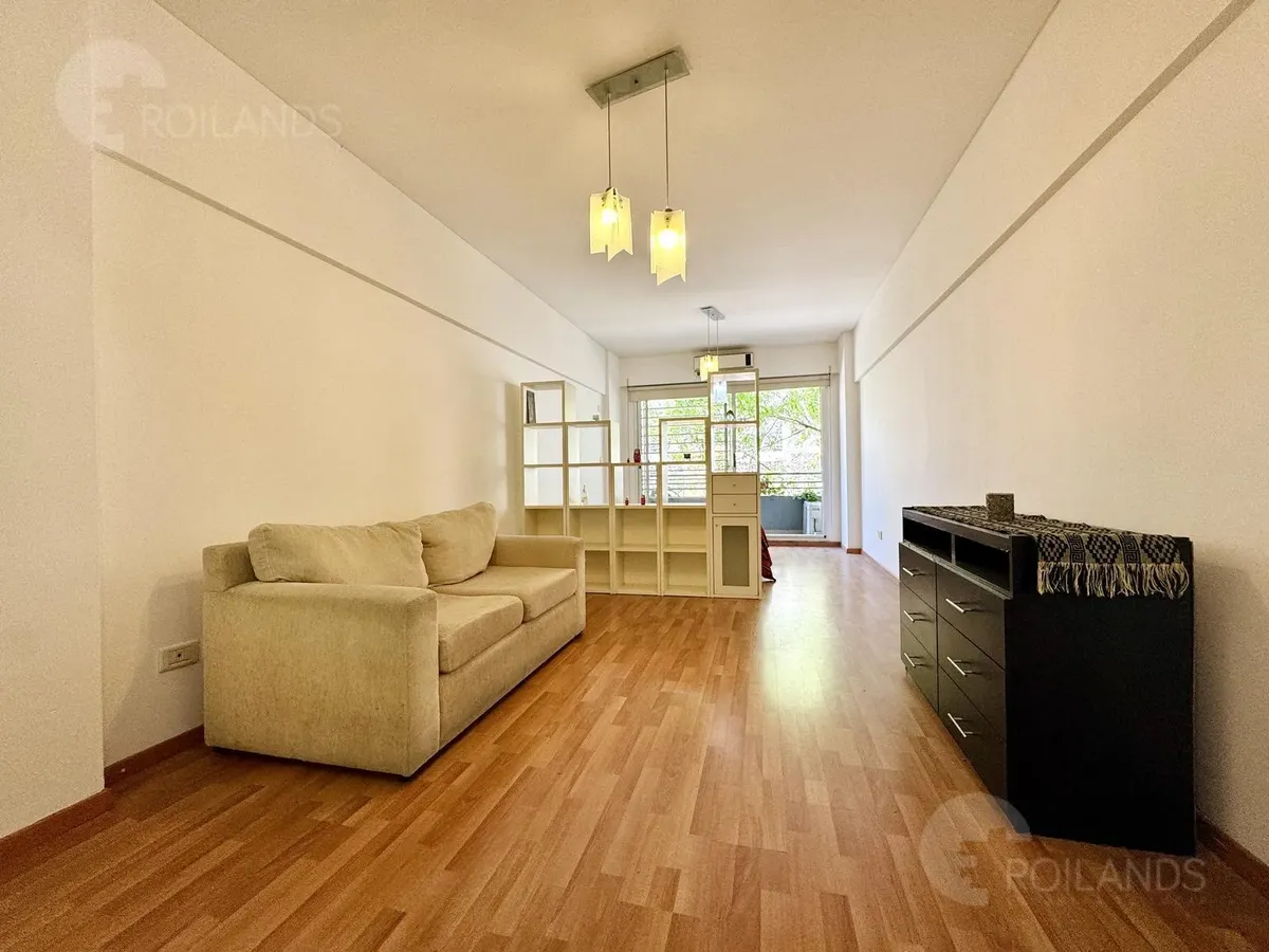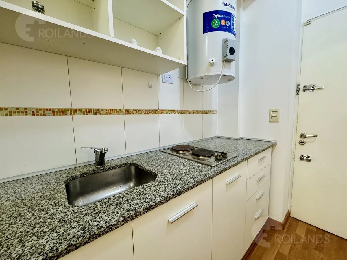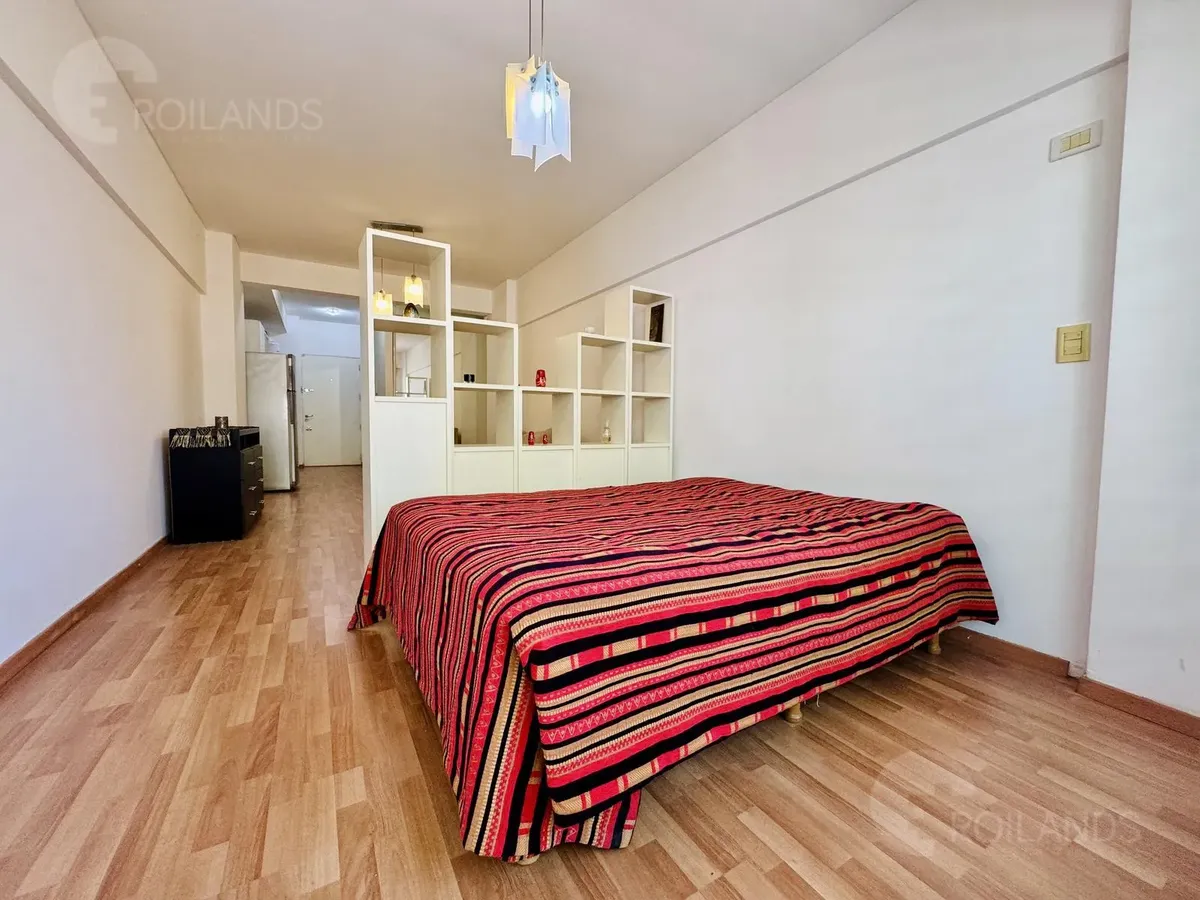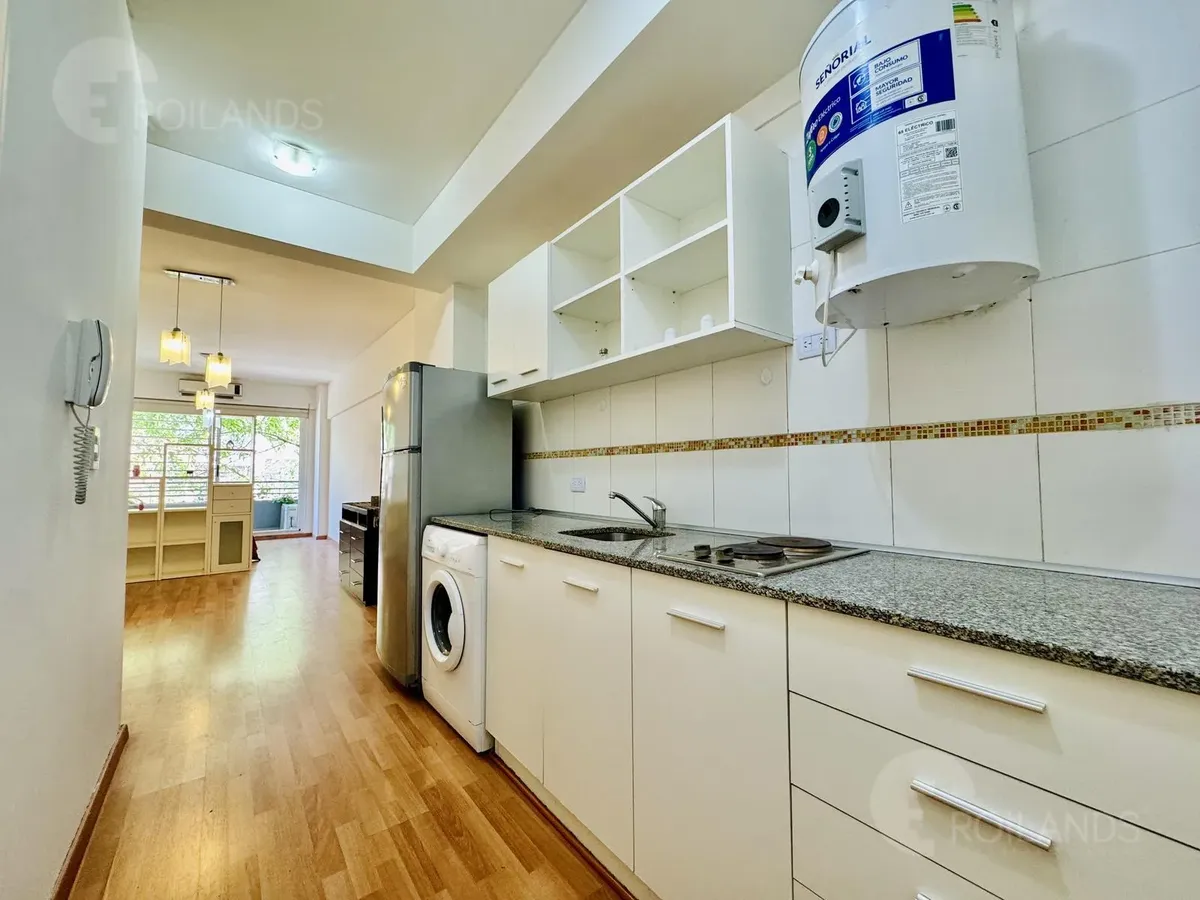 Studio apartment with an internal division for a living-dining area and a separate sleeping area, with a balcony facing the street. Fully furnished. The kitchen includes a fridge, electric water heater, and a two-burner electric cooktop, plus an upper cabinet, base cabinets and a washer. The unit has a wardrobe with mirrored doors, a two-seat sofa and a dresser. Lighting is installed in all areas, with roller blackout curtains. The sleeping area includes a queen-size bed and a cold/hot air-condi