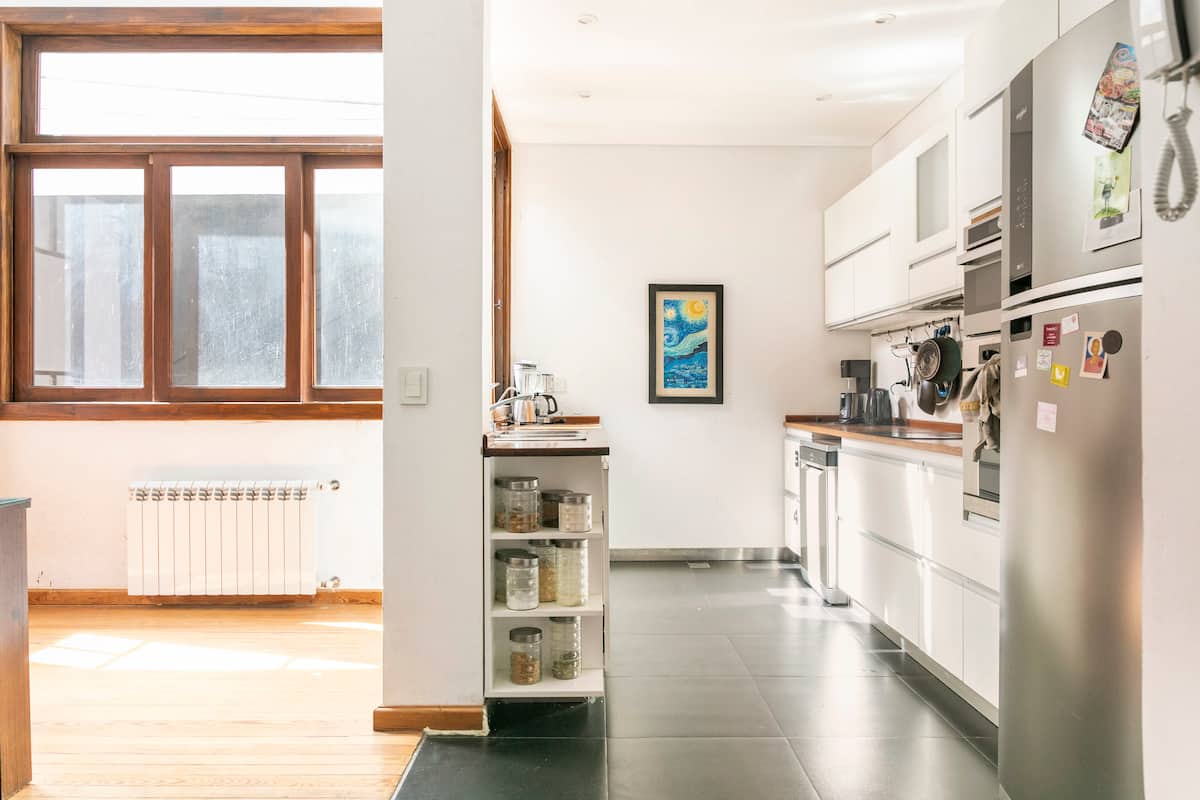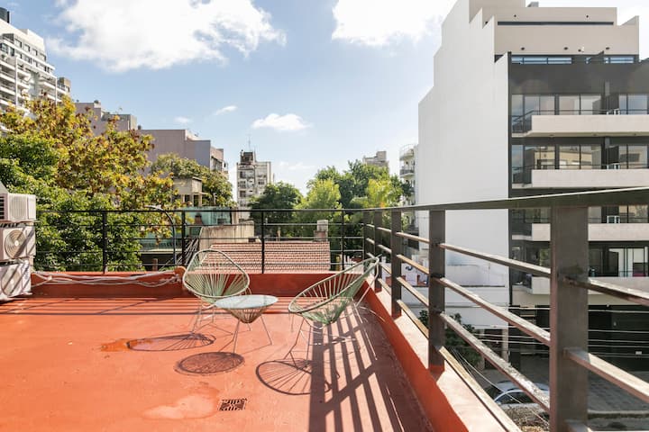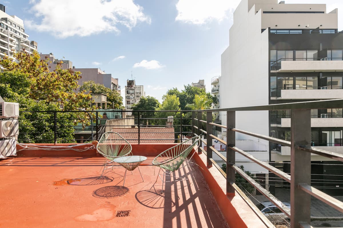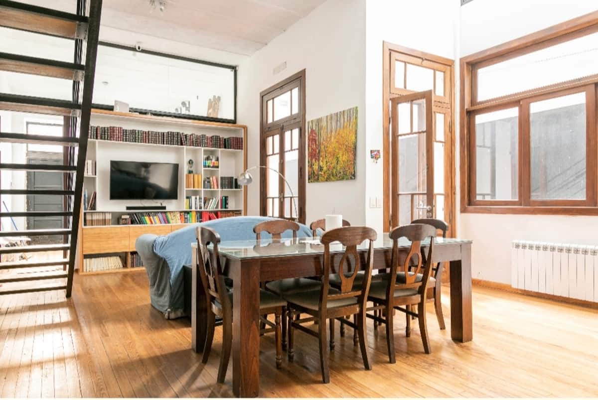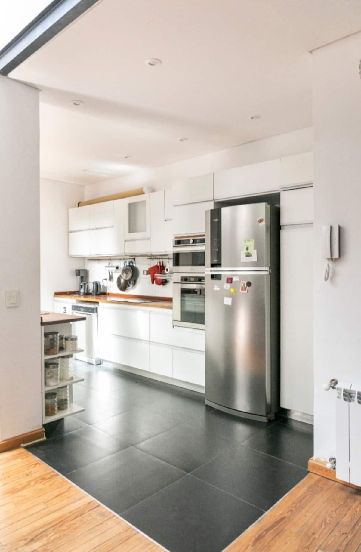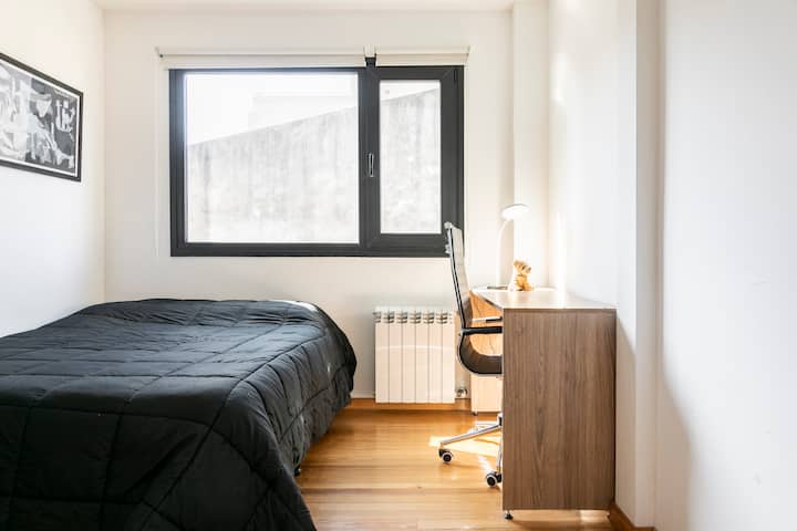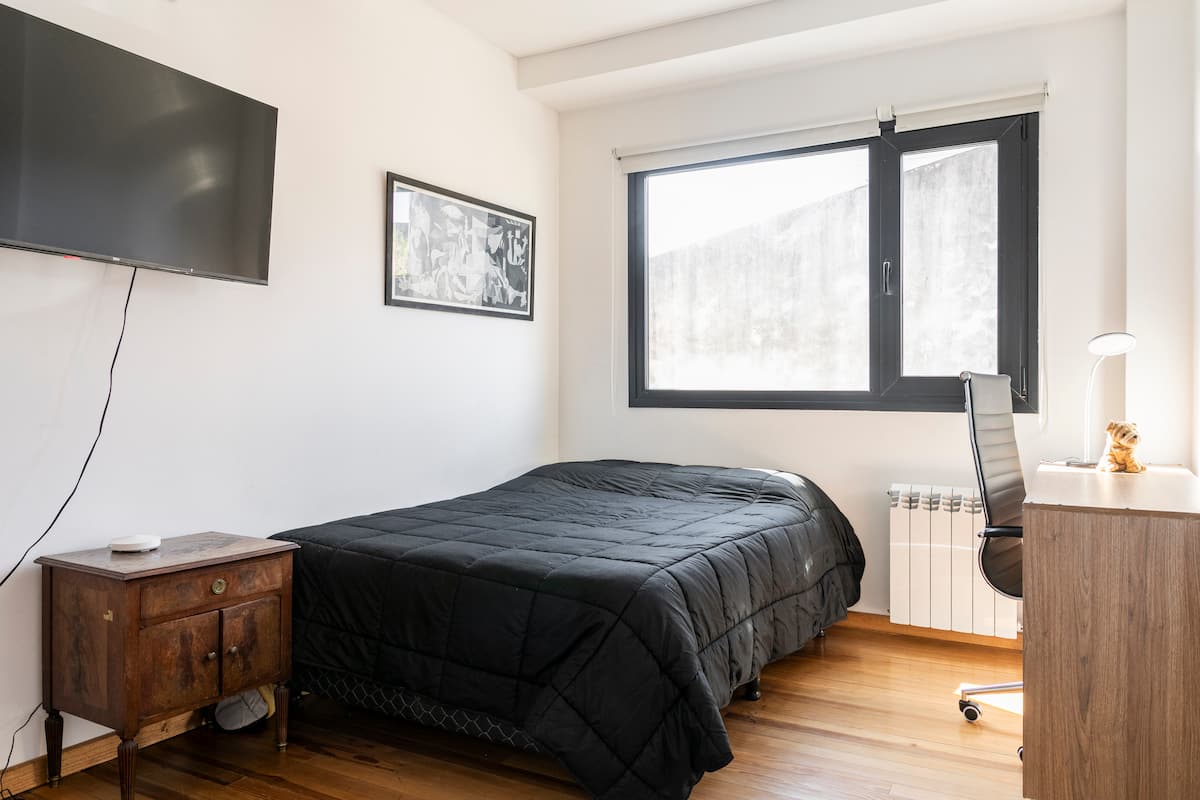 Double room in a shared house in Parque Chas. The property has 4 rooms in total across more than 200 m², with furnished rooms including a double bed, desk, wardrobe and a 42-inch TV, plus air conditioning. Shared areas include a kitchen-living-dining room with table for 6, electric and induction stove, microwave, kettle and blender, as well as a garage, garden terrace, and a laundry area with washing machine and ironing facilities.