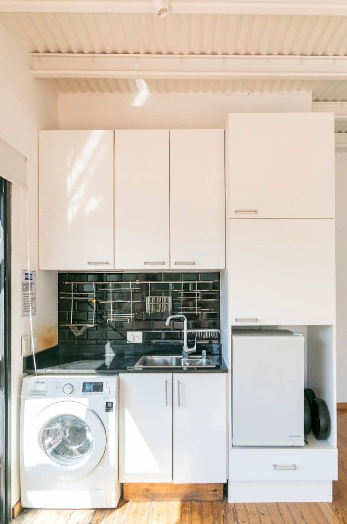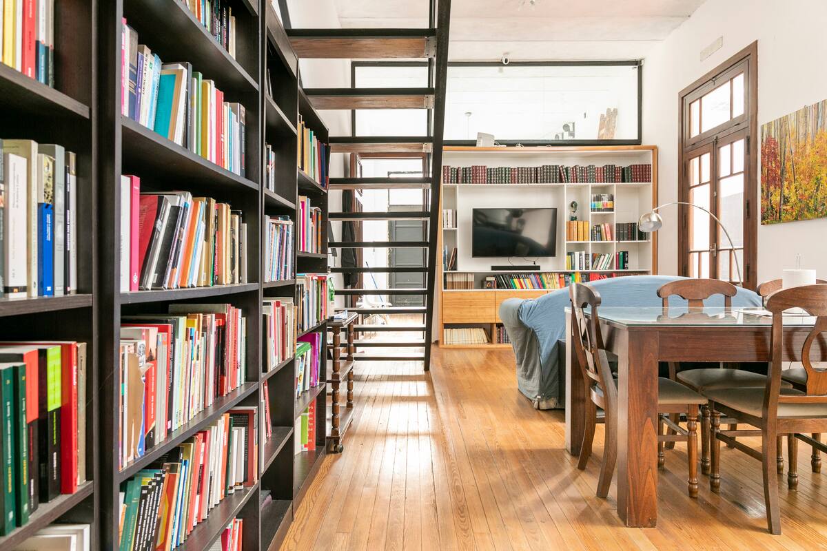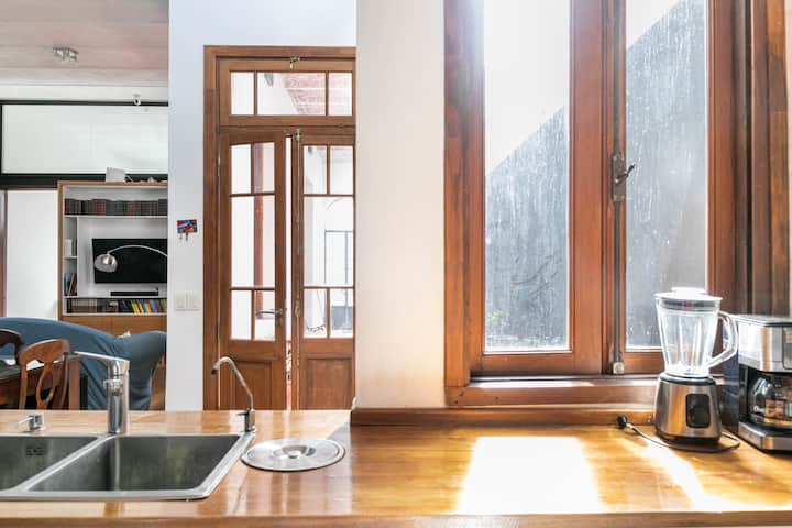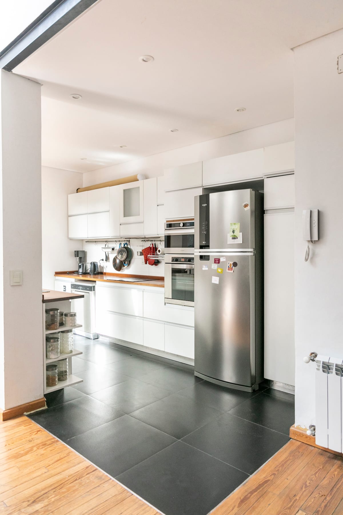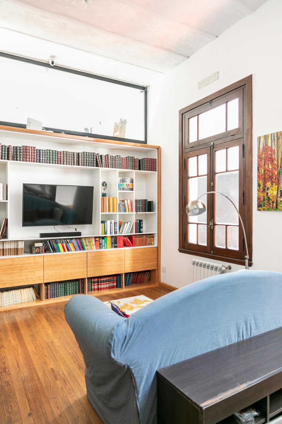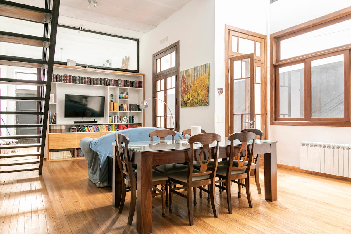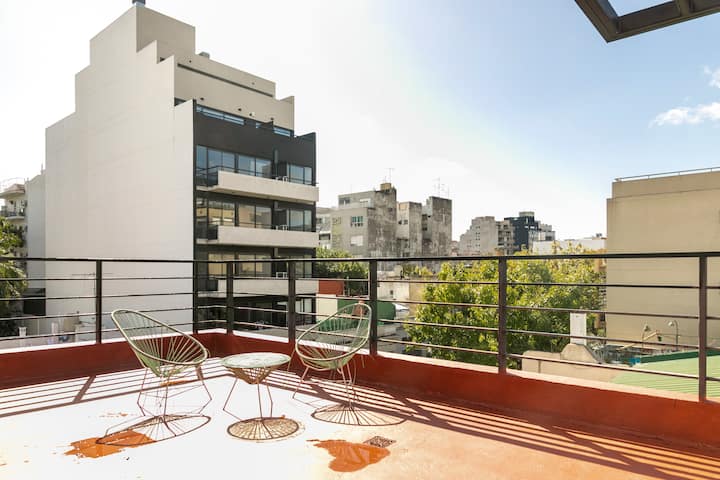 Double room in a shared house in Parque Chas. The property has 4 rooms in total across more than 200 m², with furnished rooms including a double bed, desk, wardrobe and a 42-inch TV, plus air conditioning. Shared areas include a kitchen-living-dining room with table for 6, electric and induction stove, microwave, kettle and blender, as well as a garage, garden terrace, and a laundry area with washing machine and ironing facilities.