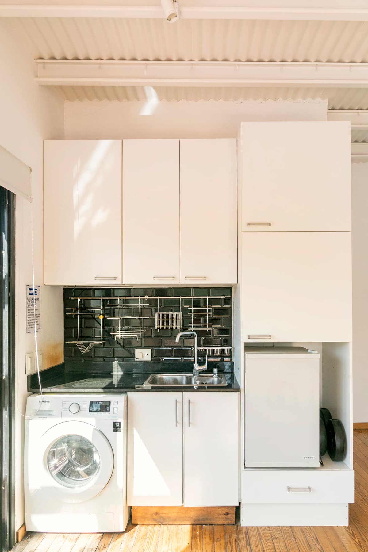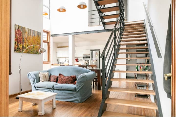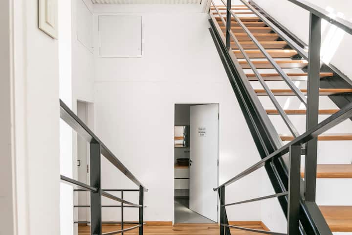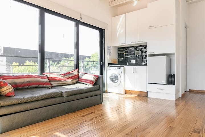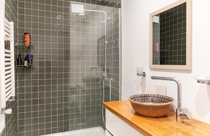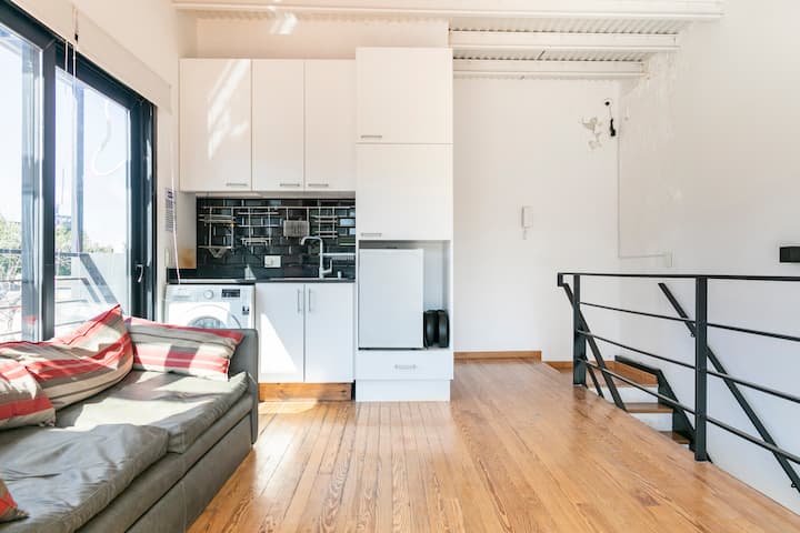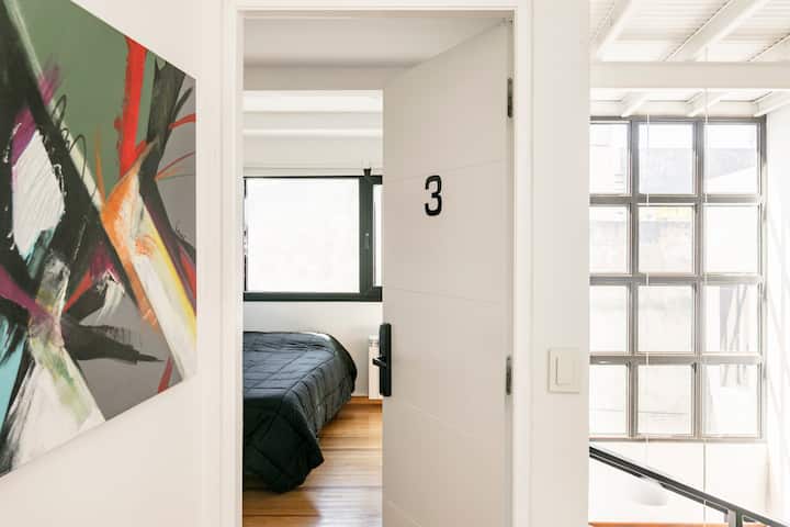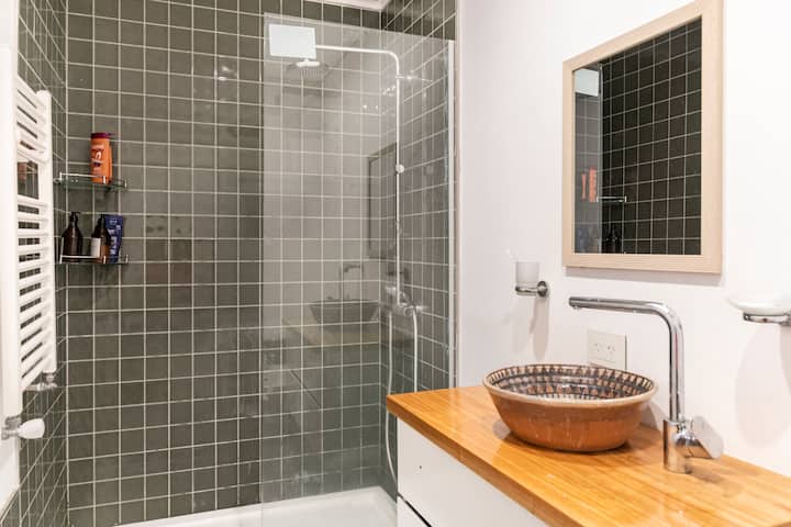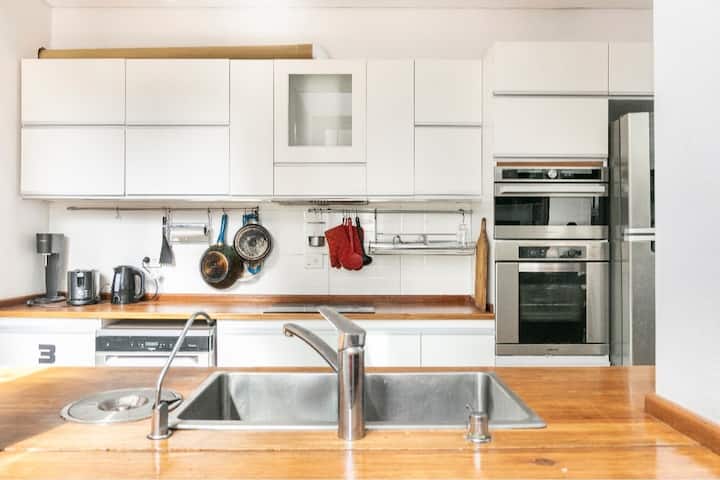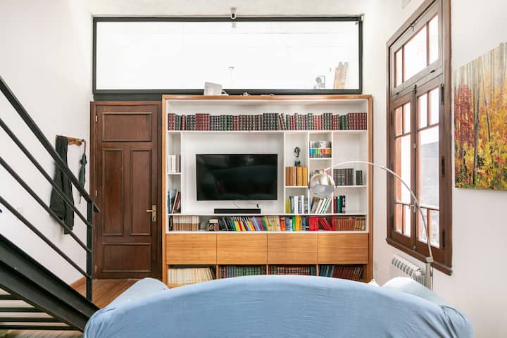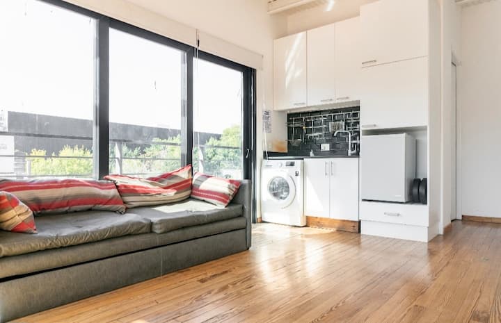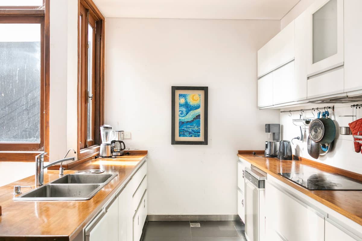 Double room in a shared house in Parque Chas. The property has 4 rooms in total across more than 200 m², with furnished rooms including a double bed, desk, wardrobe and a 42-inch TV, plus air conditioning. Shared areas include a kitchen-living-dining room with table for 6, electric and induction stove, microwave, kettle and blender, as well as a garage, garden terrace, and a laundry area with washing machine and ironing facilities.
