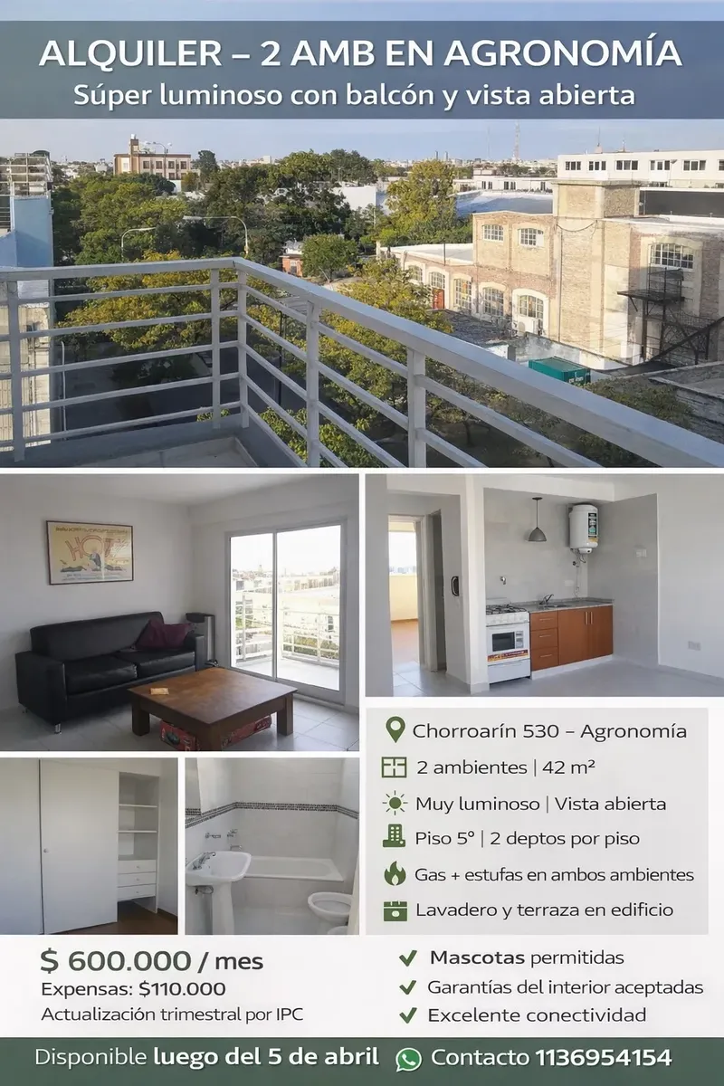 Two-room apartment of 42 m² on the 5th floor in Parque Chas, street-facing with a balcony and open view. The living-dining area has an integrated kitchen with natural gas and an electric water heater; natural ventilation is provided by a skylight in the bathroom. The bedroom is at the back (courtyard-facing), with a full built-in wardrobe, shutters, and floating floors; terraced laundry use includes a free-use washing machine and an accessible roof terrace. Pets are allowed, and the rental accep