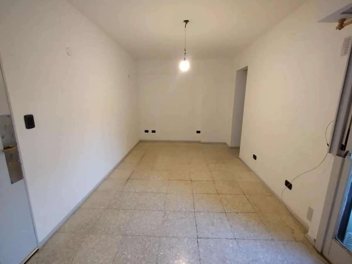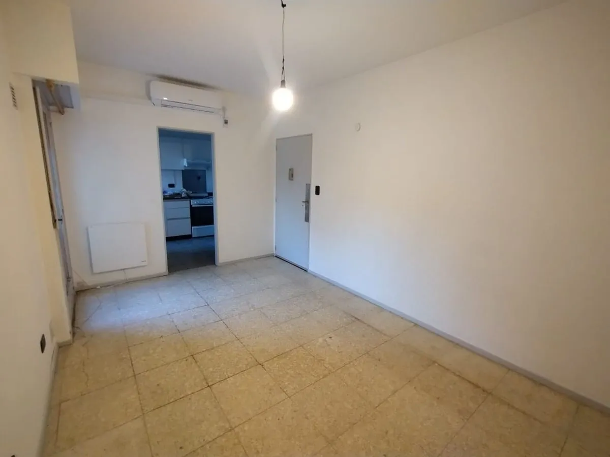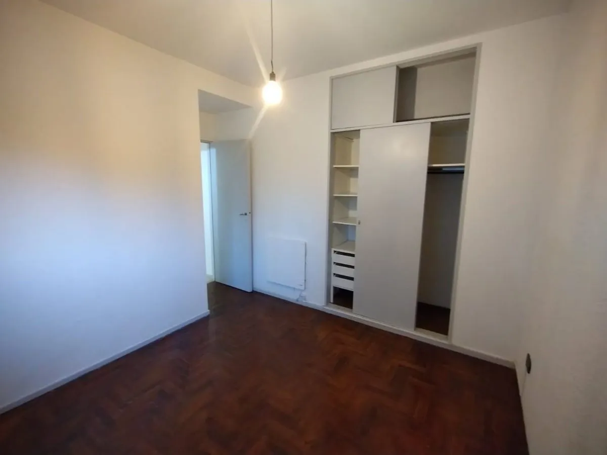 Two-room apartment in Parque Chas, on the 5th floor in a side-facing position. Kitchen-dining area with gas stove and water heater (new), separate laundry area, living room with split air-conditioning and electric panel heater, and a bathroom with natural ventilation. Bedroom with built-in wardrobe and wooden floors, plus storage space. Building has a caretaker; building fees are described as low. Rental requires an advance month and a deposit of USD 600, with a 24-month contract and quarterly u