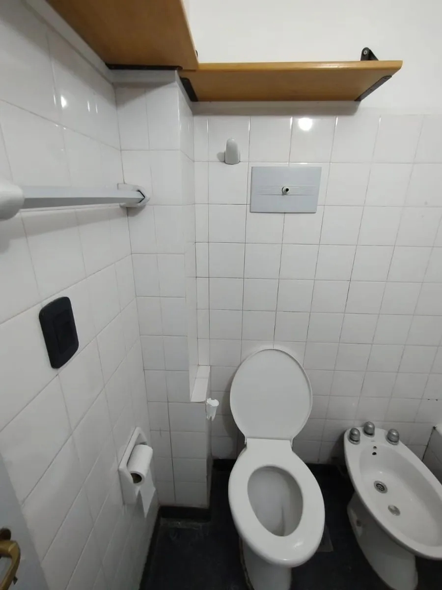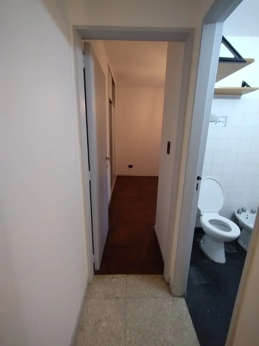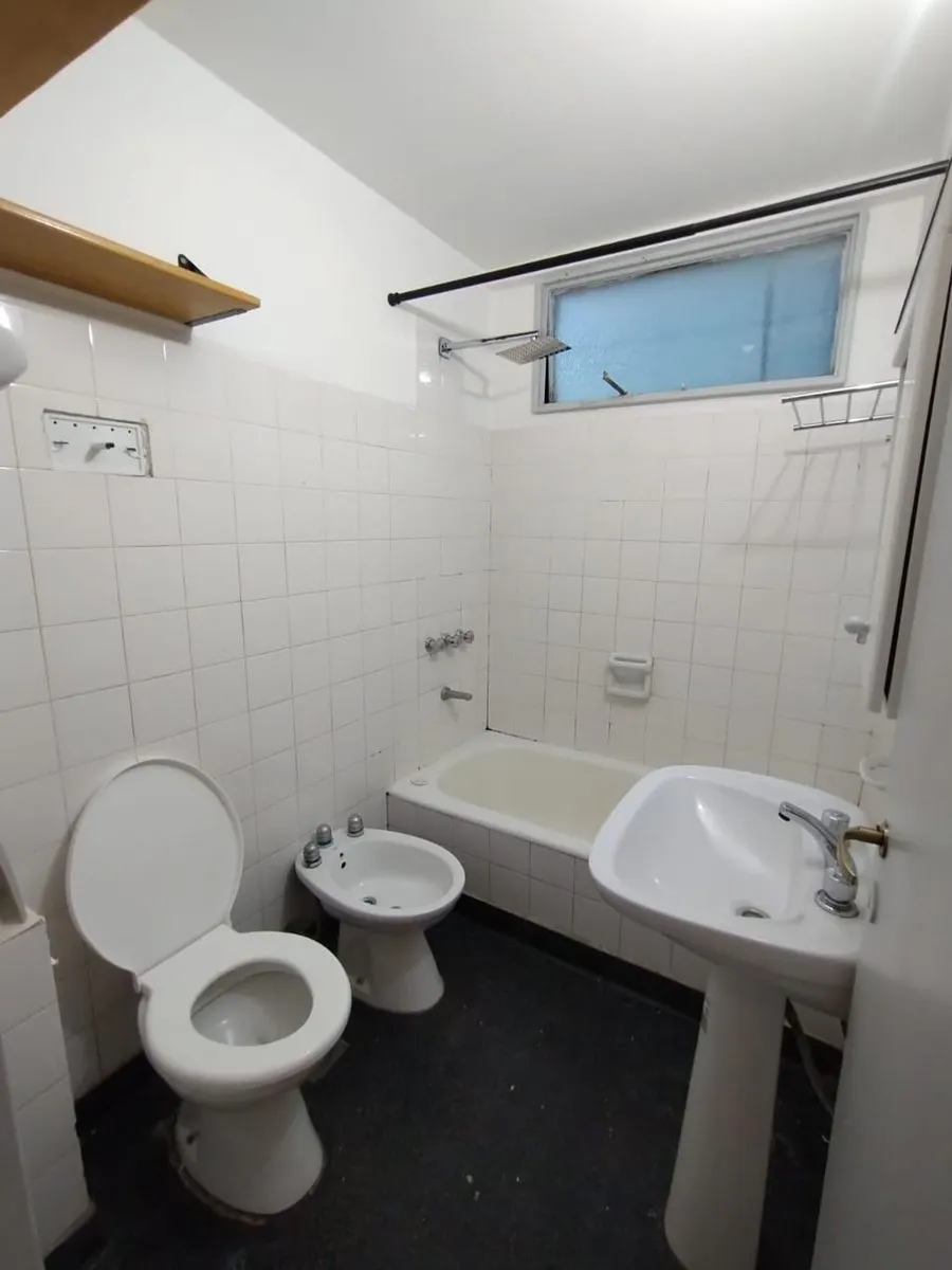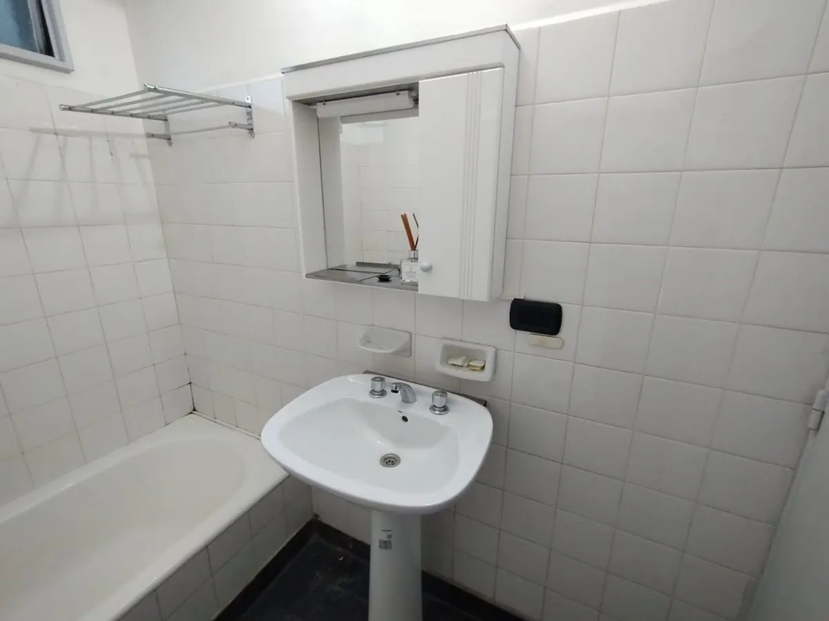 Two-room apartment in Parque Chas, on the 5th floor in a side-facing position. Kitchen-dining area with gas stove and water heater (new), separate laundry area, living room with split air-conditioning and electric panel heater, and a bathroom with natural ventilation. Bedroom with built-in wardrobe and wooden floors, plus storage space. Building has a caretaker; building fees are described as low. Rental requires an advance month and a deposit of USD 600, with a 24-month contract and quarterly u