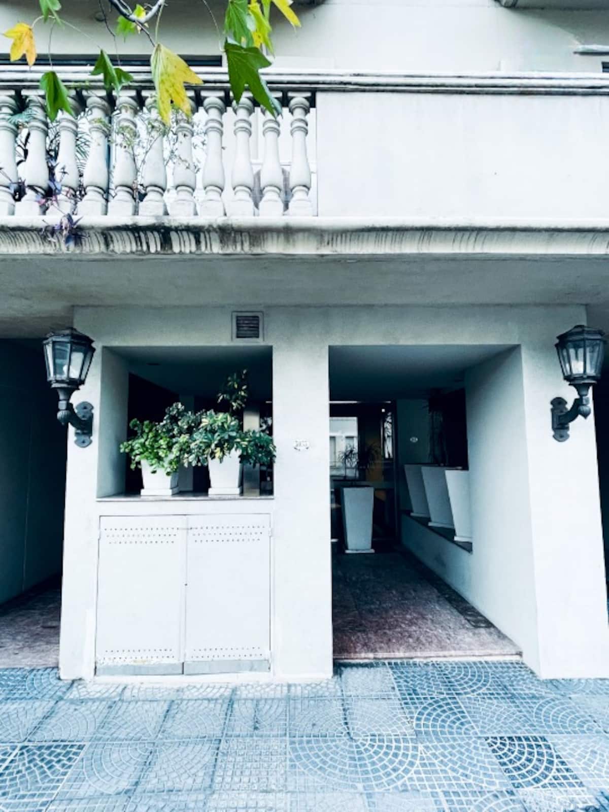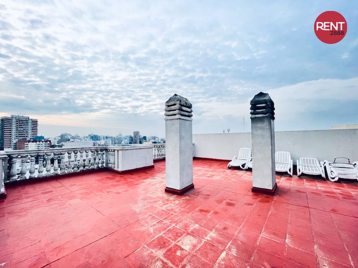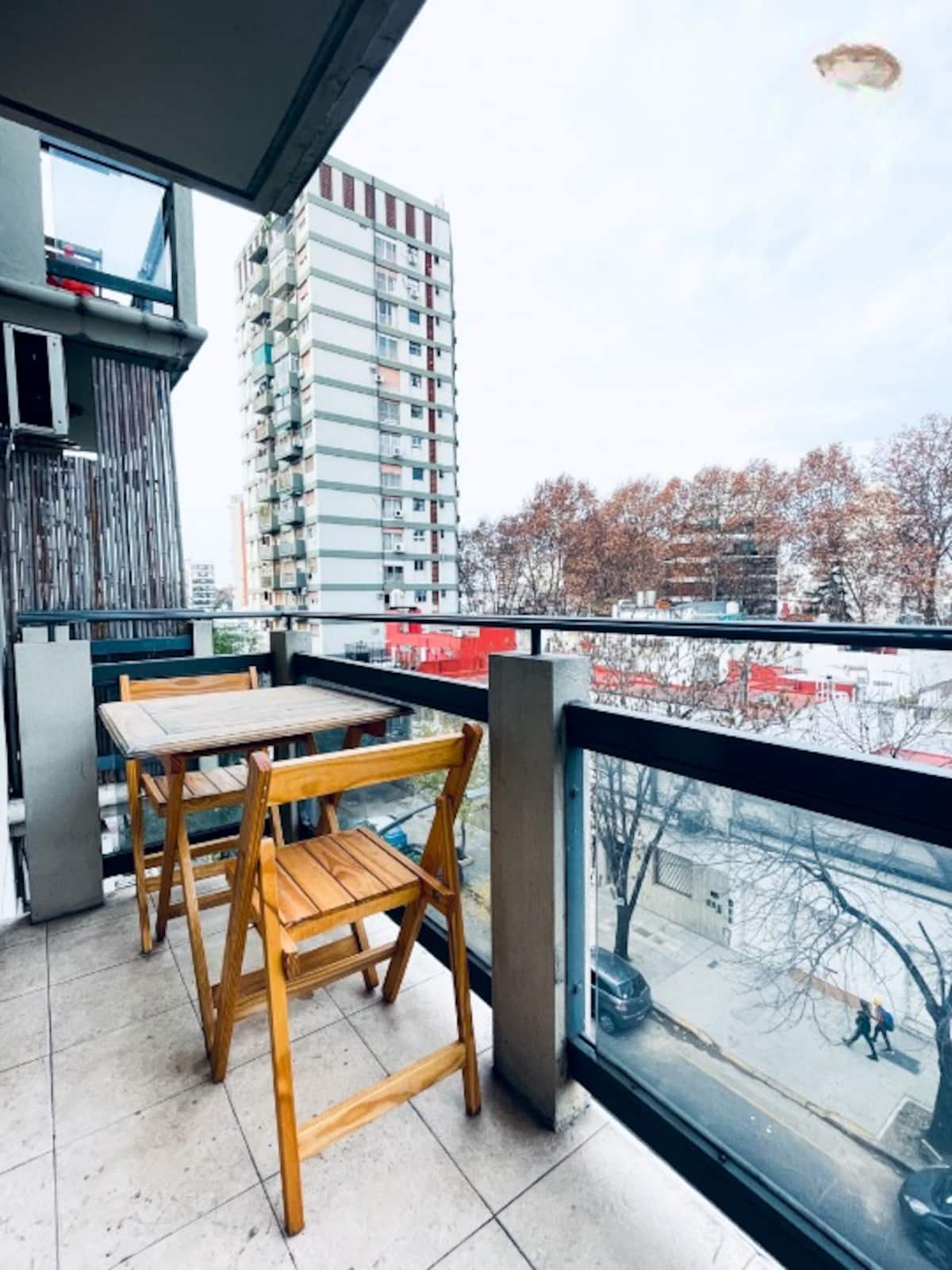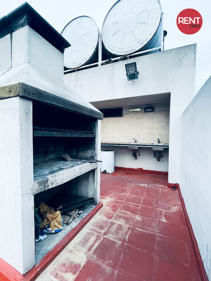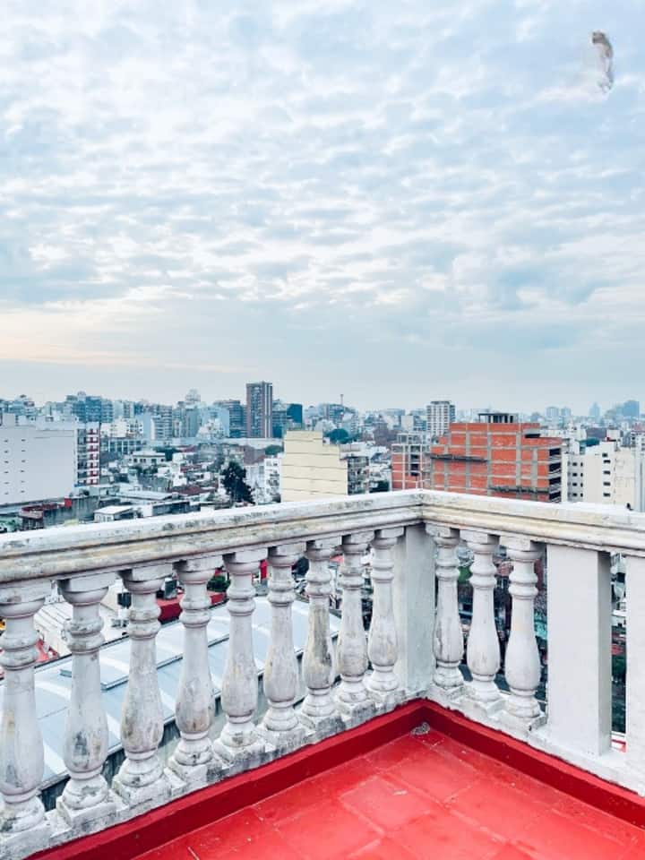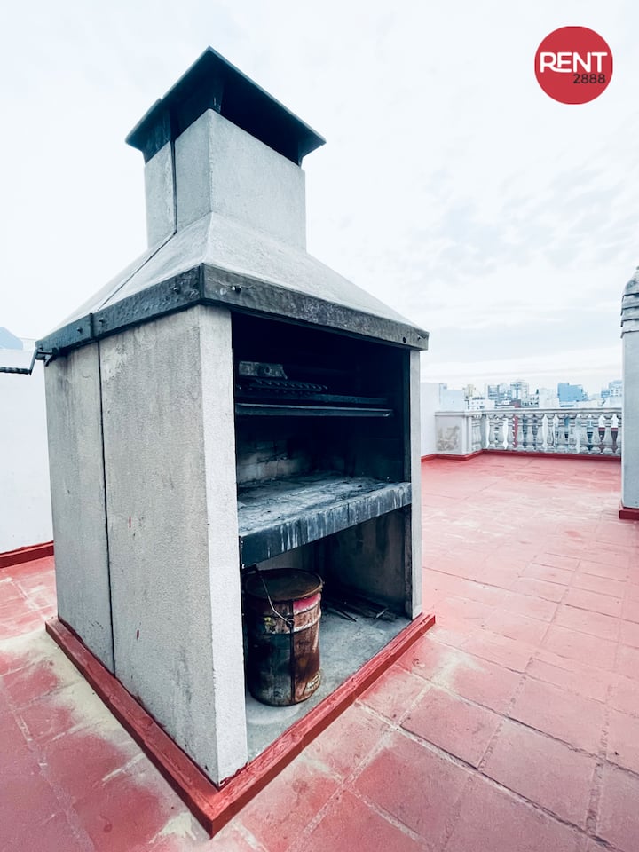 Two-room apartment with 1 bedroom on the 4th floor, street-facing and corner position, with a private balcony. Fully equipped for a short stay. There is a laundry room on the 10th floor and a large terrace; use of the grills is available for an extra cost with prior reservation. The property is about 100 metres from Subte Line B, station Echeverría.