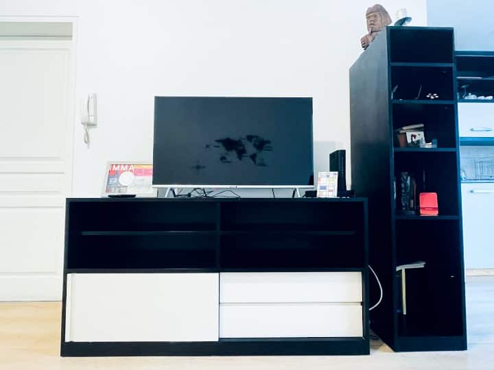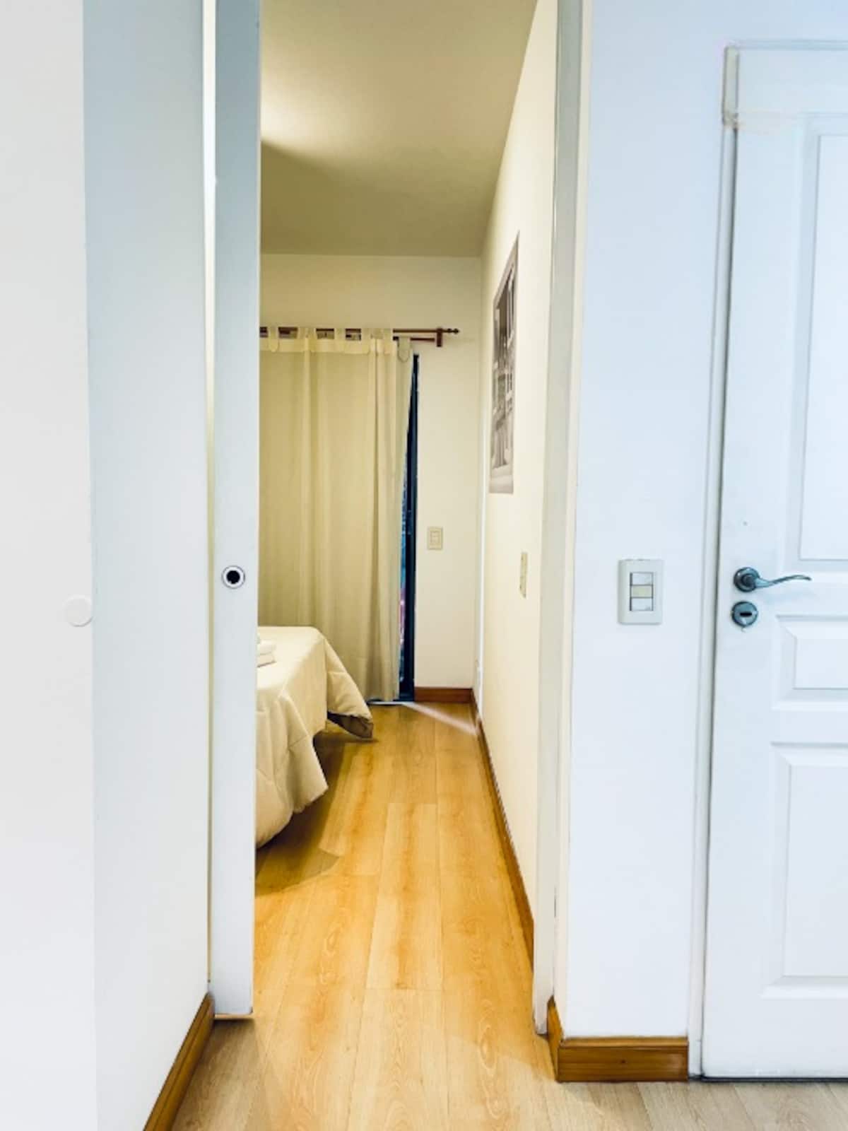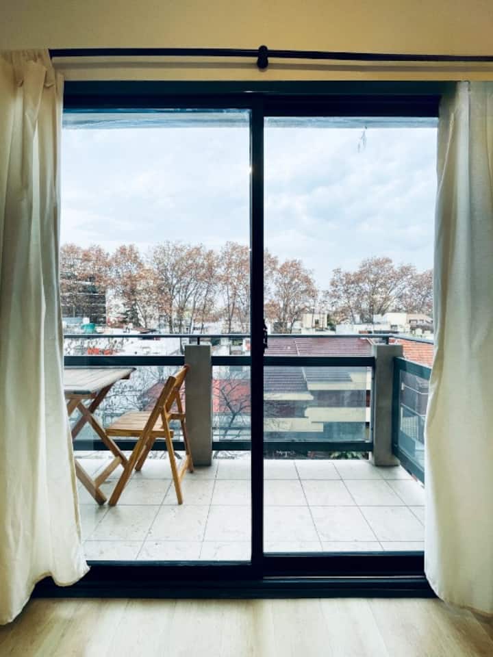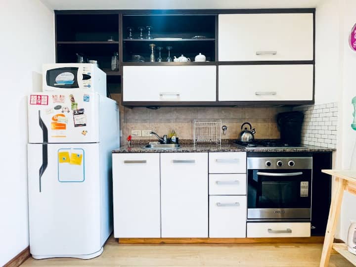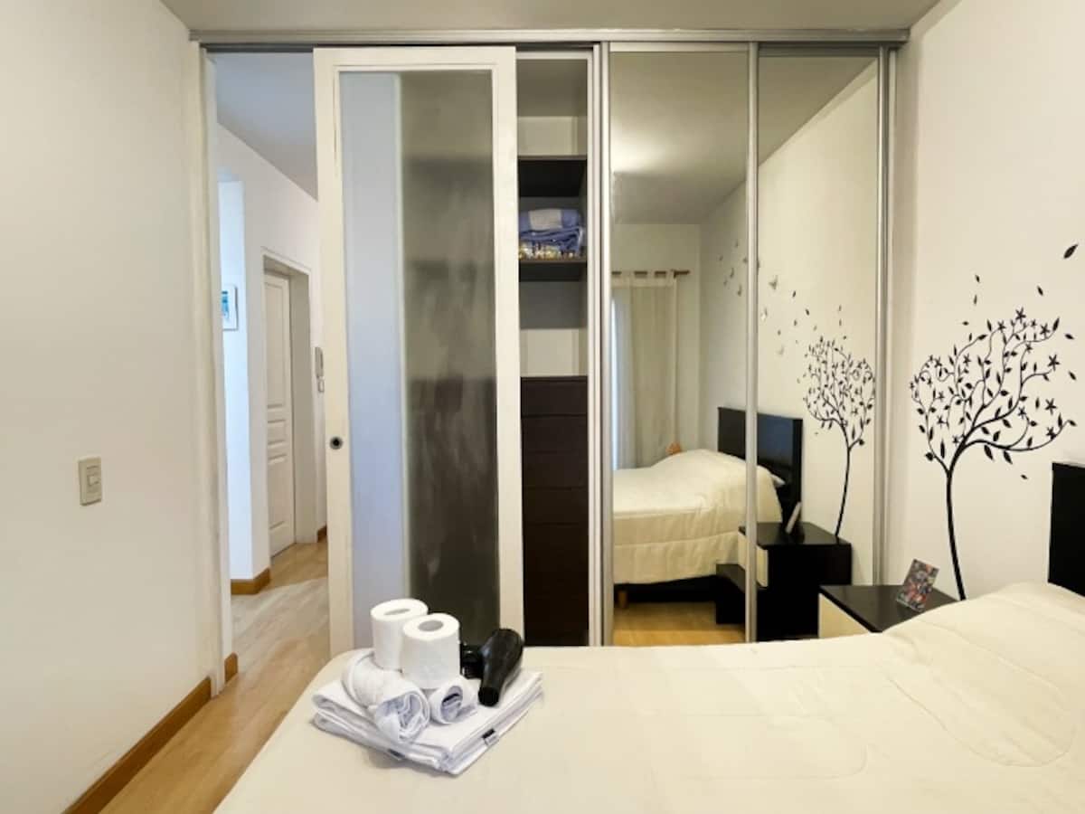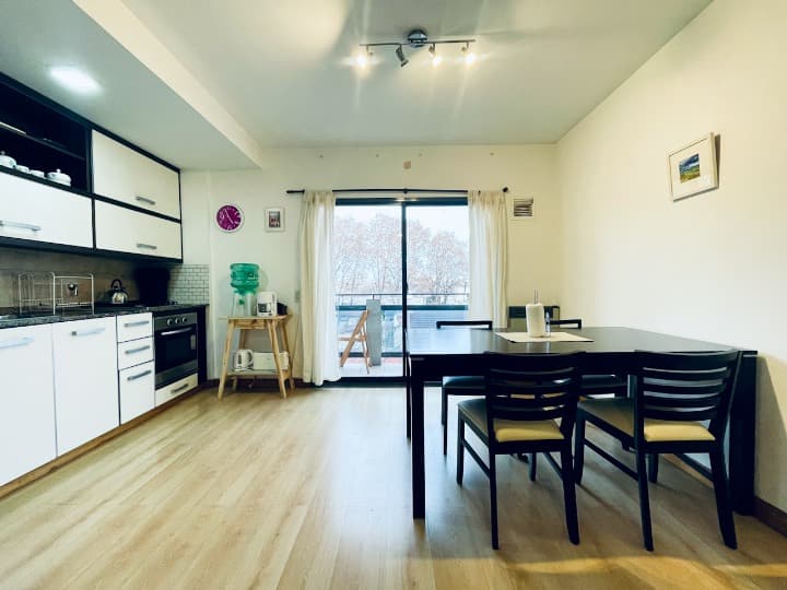 Two-room apartment with 1 bedroom on the 4th floor, street-facing and corner position, with a private balcony. Fully equipped for a short stay. There is a laundry room on the 10th floor and a large terrace; use of the grills is available for an extra cost with prior reservation. The property is about 100 metres from Subte Line B, station Echeverría.