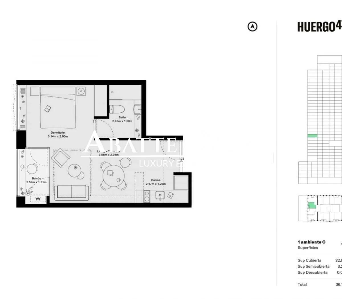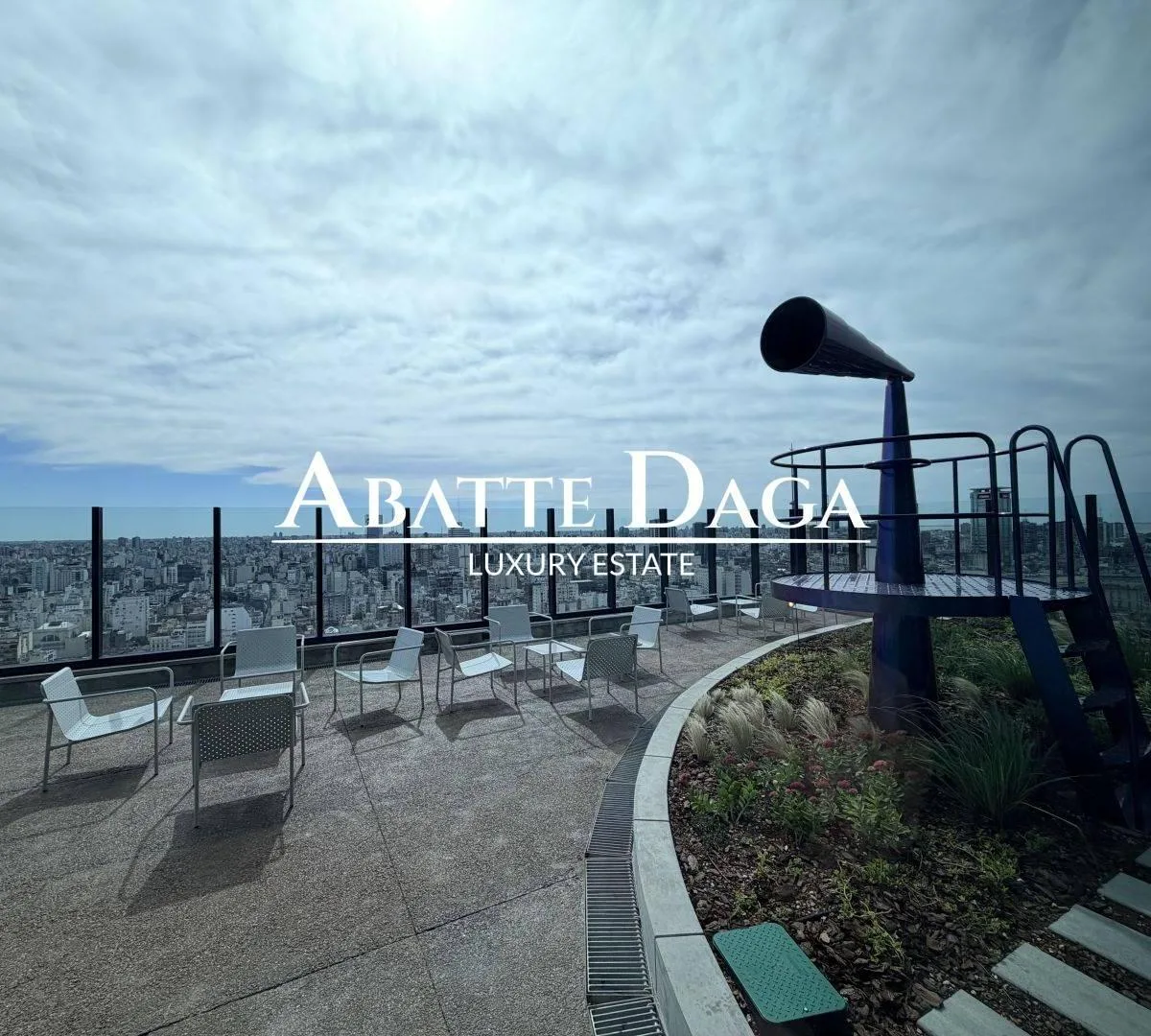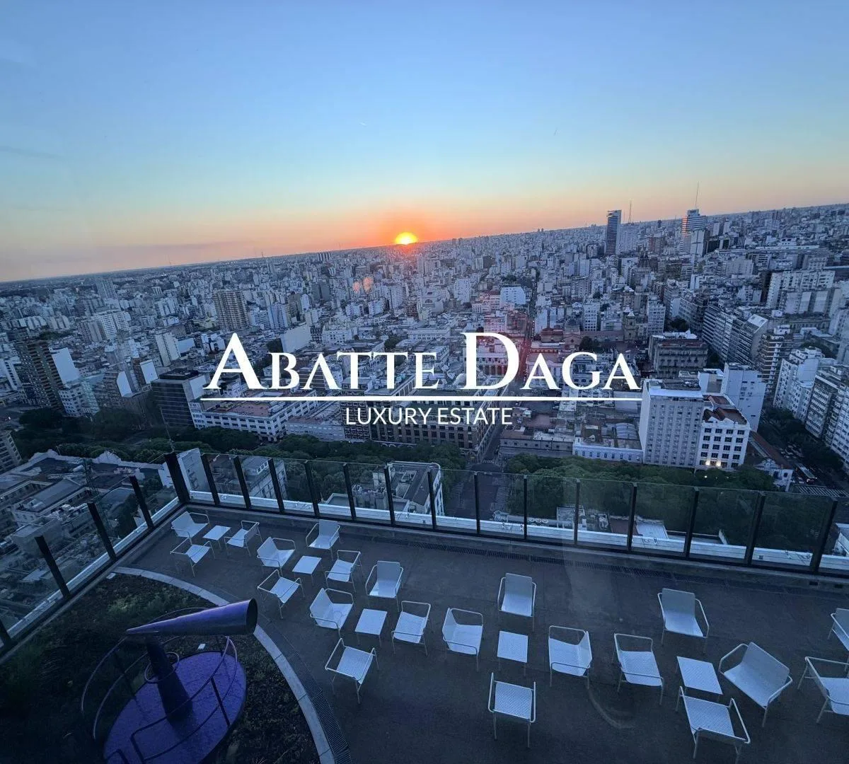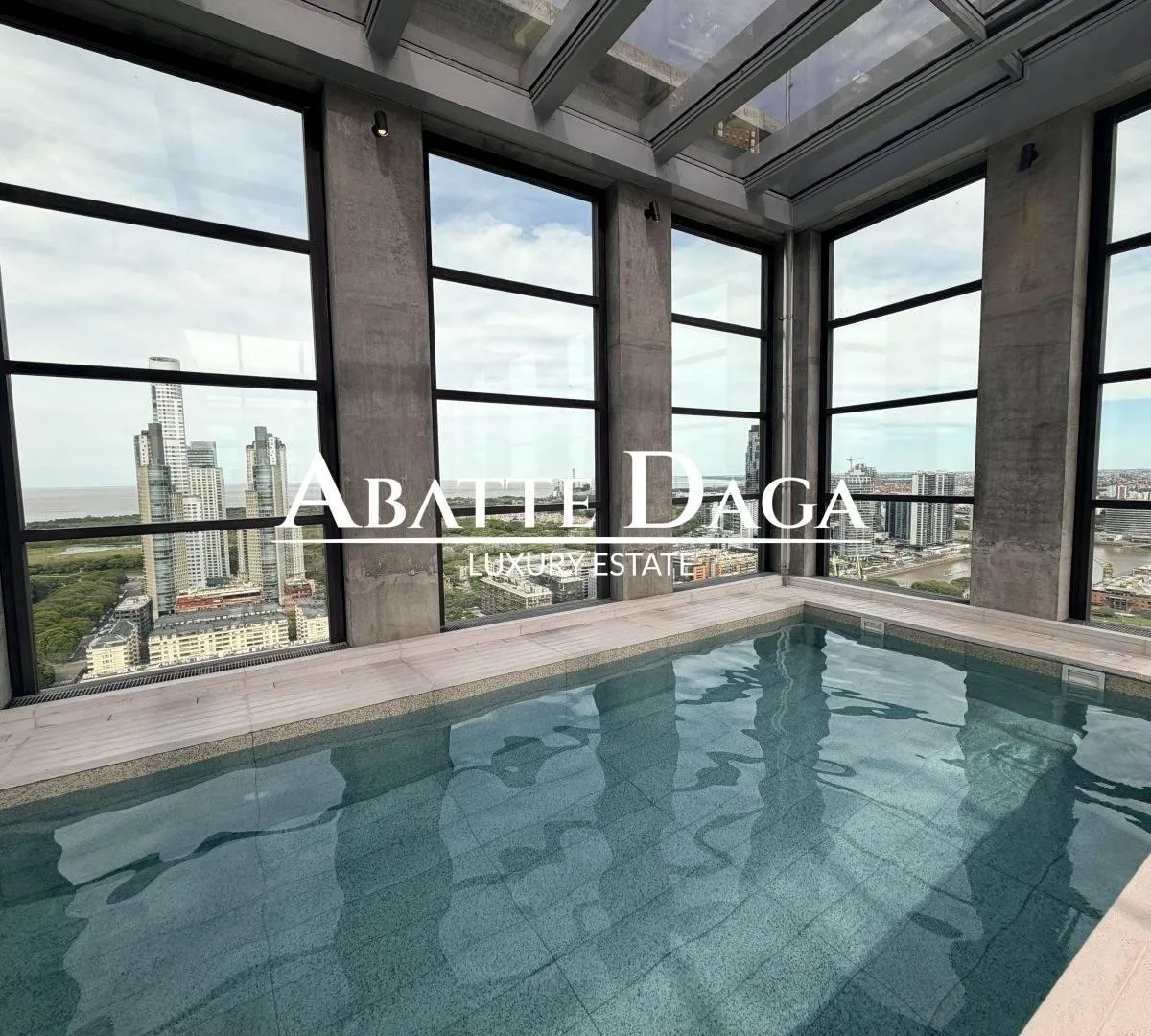 Studio apartment on a high floor in Huergo 475, Puerto Madero. 38 m² total, west-facing. Includes fitted kitchen with lacquered cabinets, electric hotplate and oven, touch screen display with security connection, heating and cooling air conditioning, PVC windows with double-glazed windows, and bathroom with shower screen and single-lever fittings. Building amenities include 24-hour security, coworking and study rooms, laundry, gym, residents' lounge (SUM), a 38th-floor pool with views of Puerto
