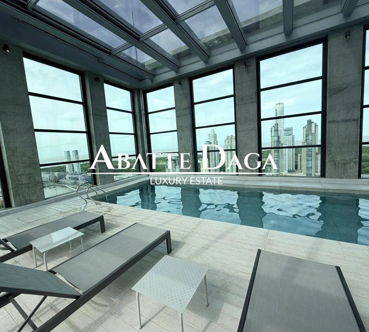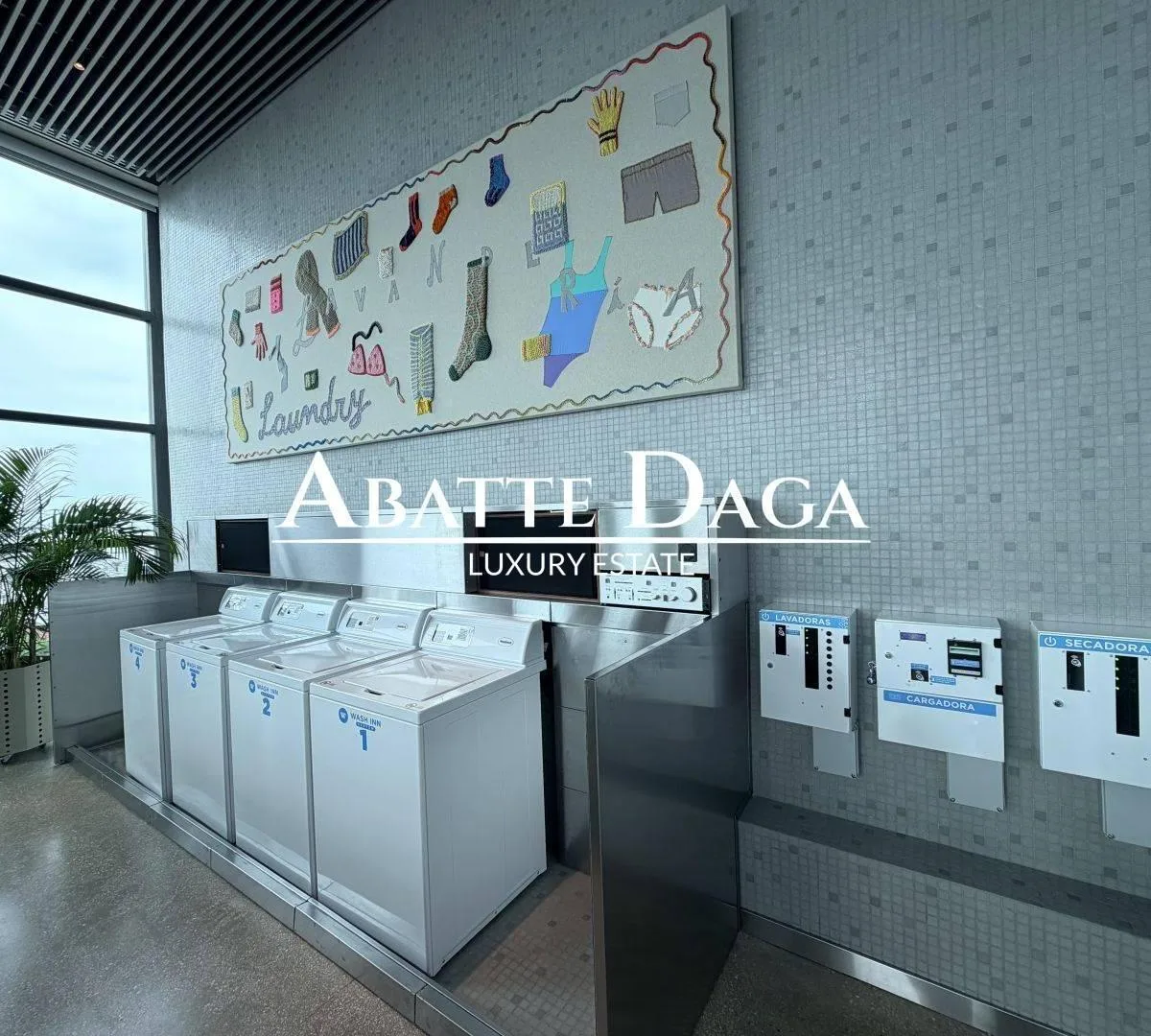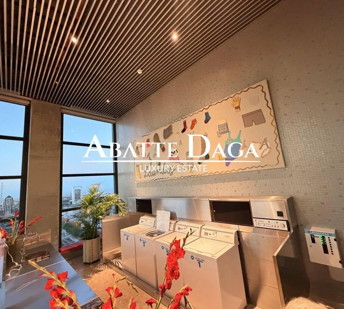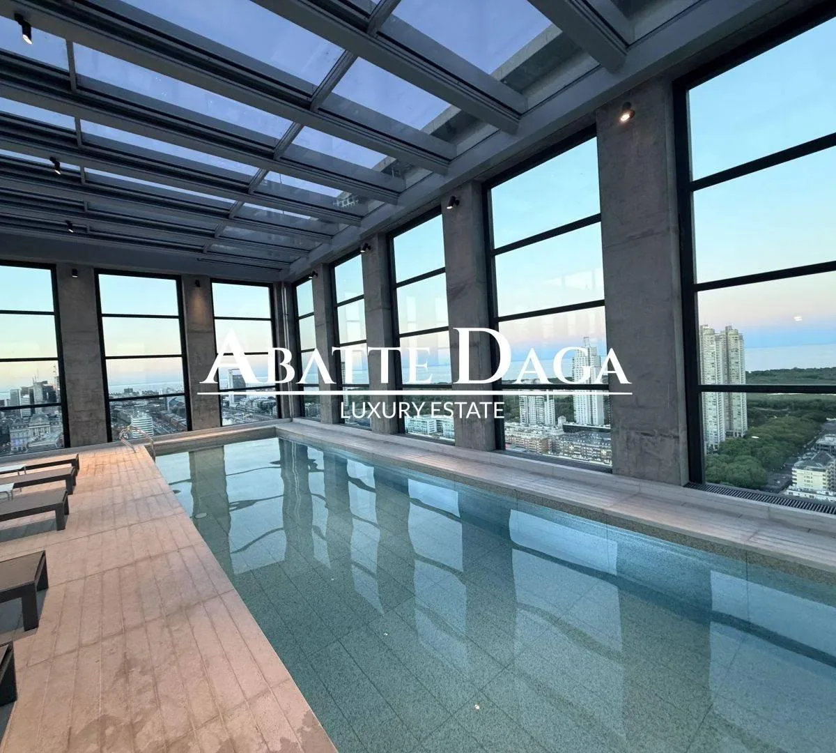 Studio apartment on a high floor in Huergo 475, Puerto Madero. 38 m² total, west-facing. Includes fitted kitchen with lacquered cabinets, electric hotplate and oven, touch screen display with security connection, heating and cooling air conditioning, PVC windows with double-glazed windows, and bathroom with shower screen and single-lever fittings. Building amenities include 24-hour security, coworking and study rooms, laundry, gym, residents' lounge (SUM), a 38th-floor pool with views of Puerto