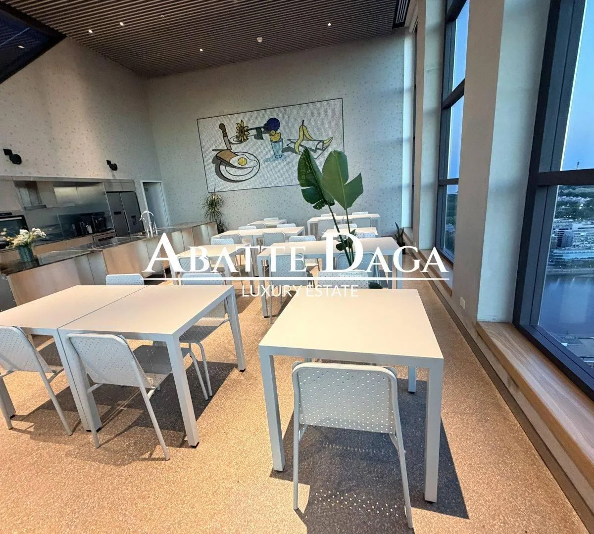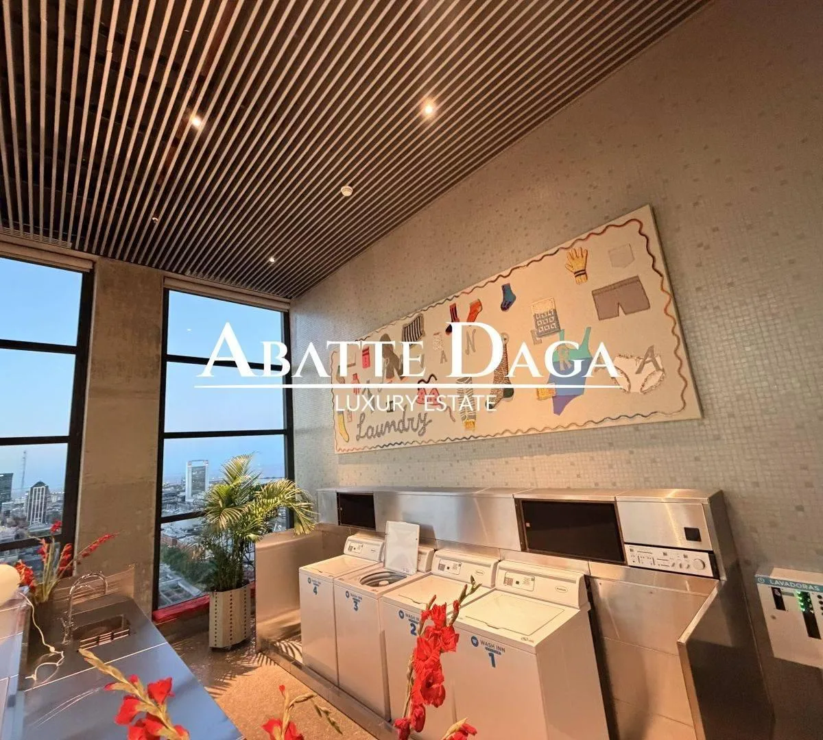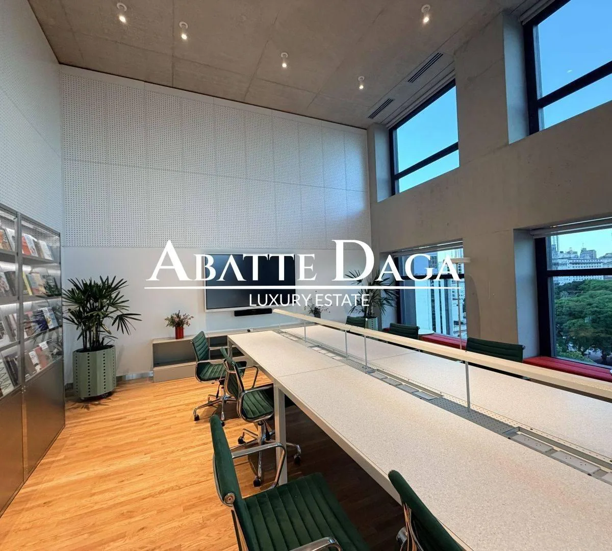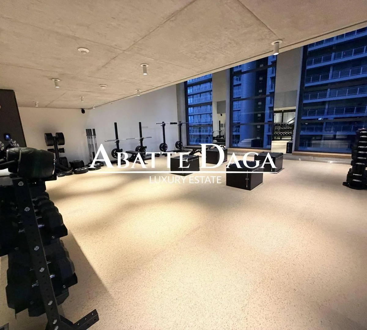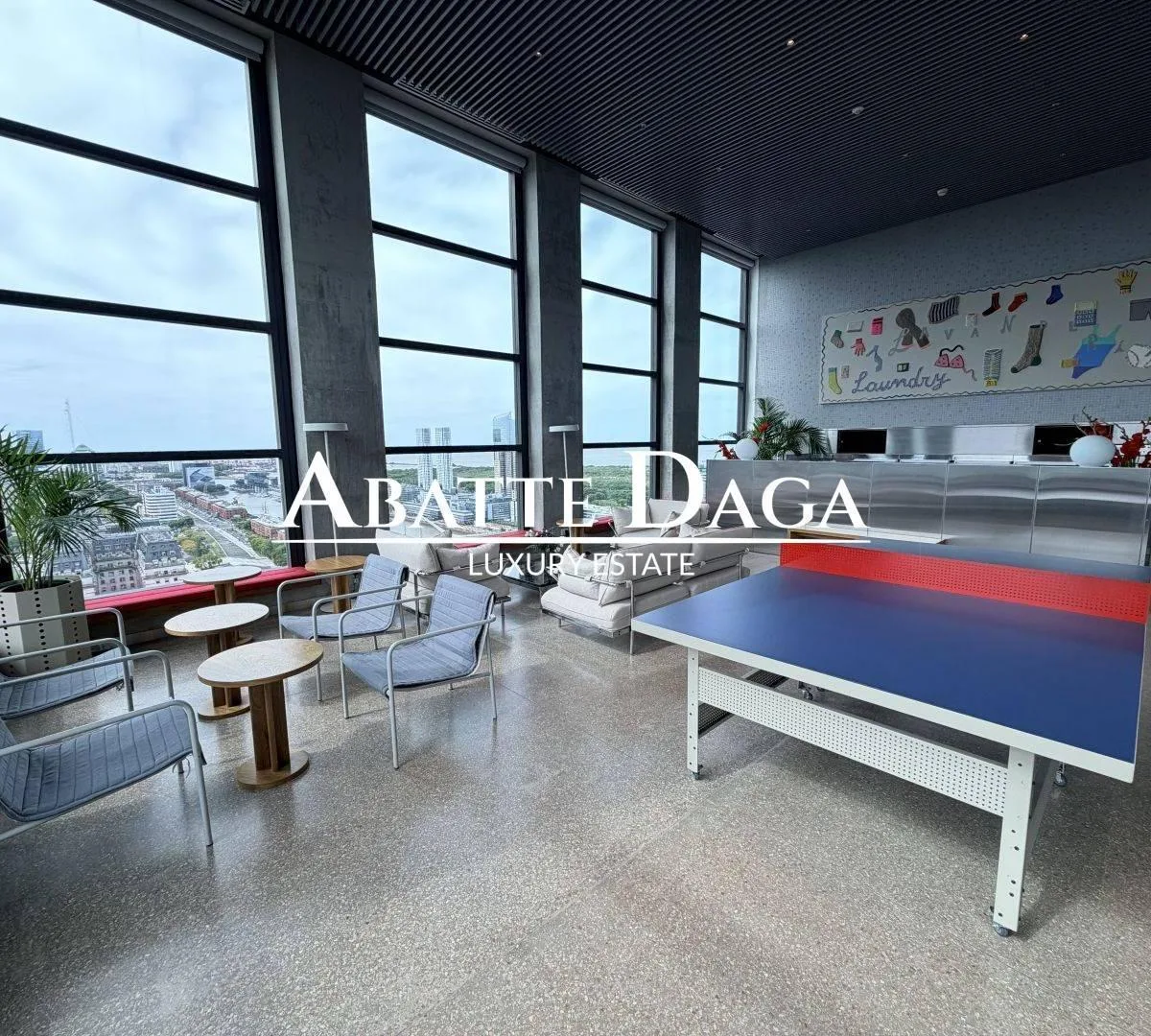 Studio apartment on a high floor in Huergo 475, Puerto Madero. 38 m² total, west-facing. Includes fitted kitchen with lacquered cabinets, electric hotplate and oven, touch screen display with security connection, heating and cooling air conditioning, PVC windows with double-glazed windows, and bathroom with shower screen and single-lever fittings. Building amenities include 24-hour security, coworking and study rooms, laundry, gym, residents' lounge (SUM), a 38th-floor pool with views of Puerto
