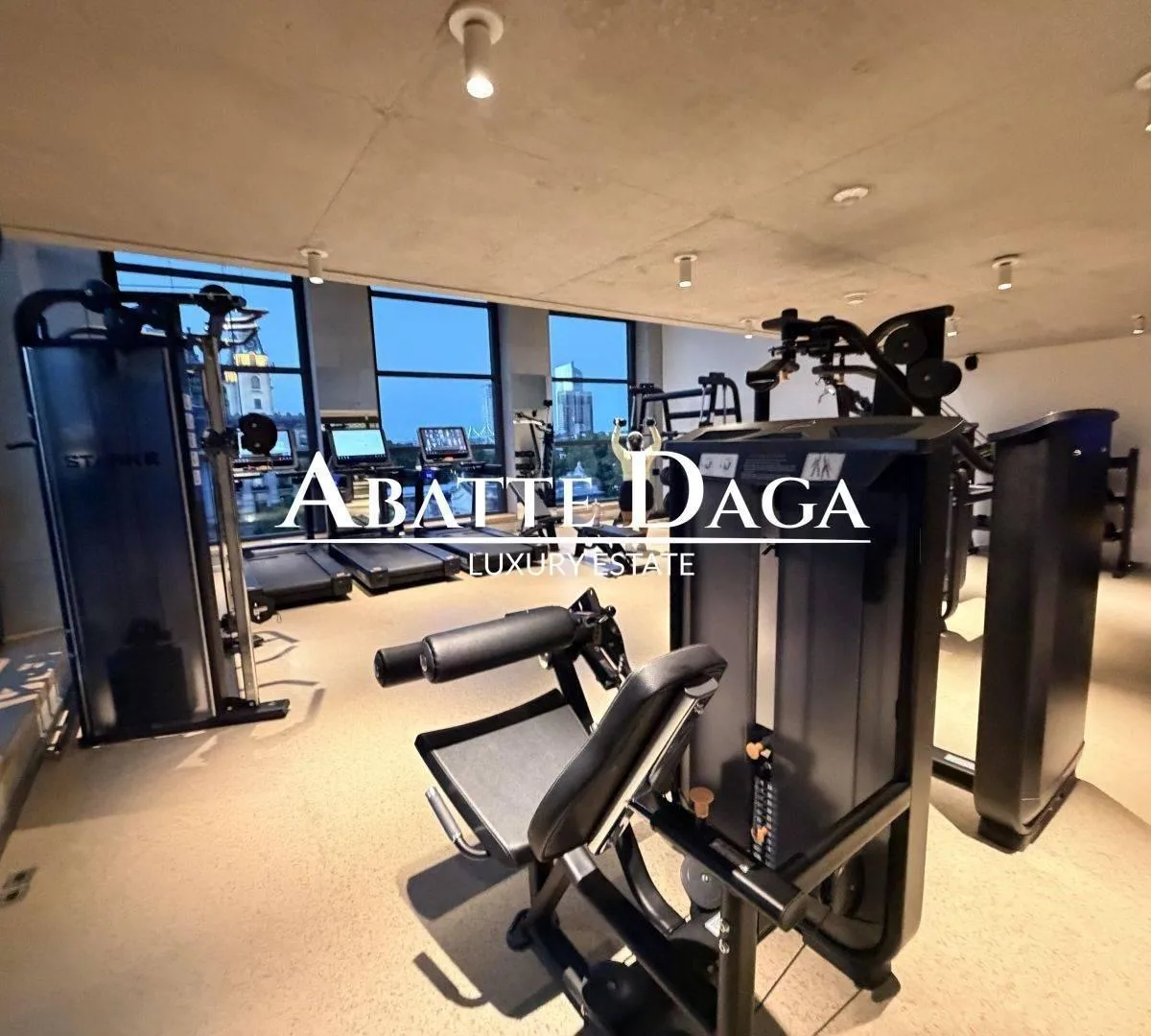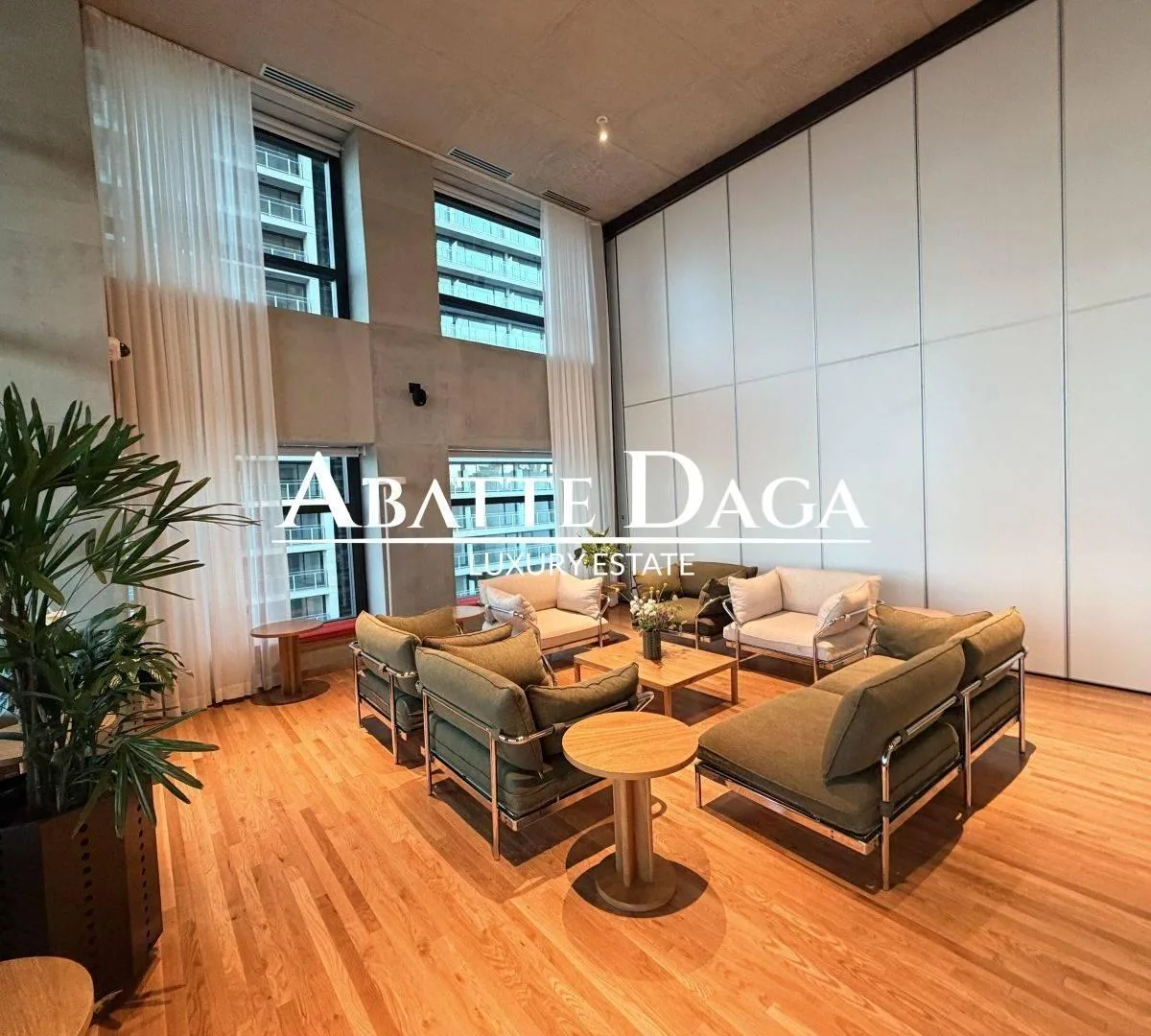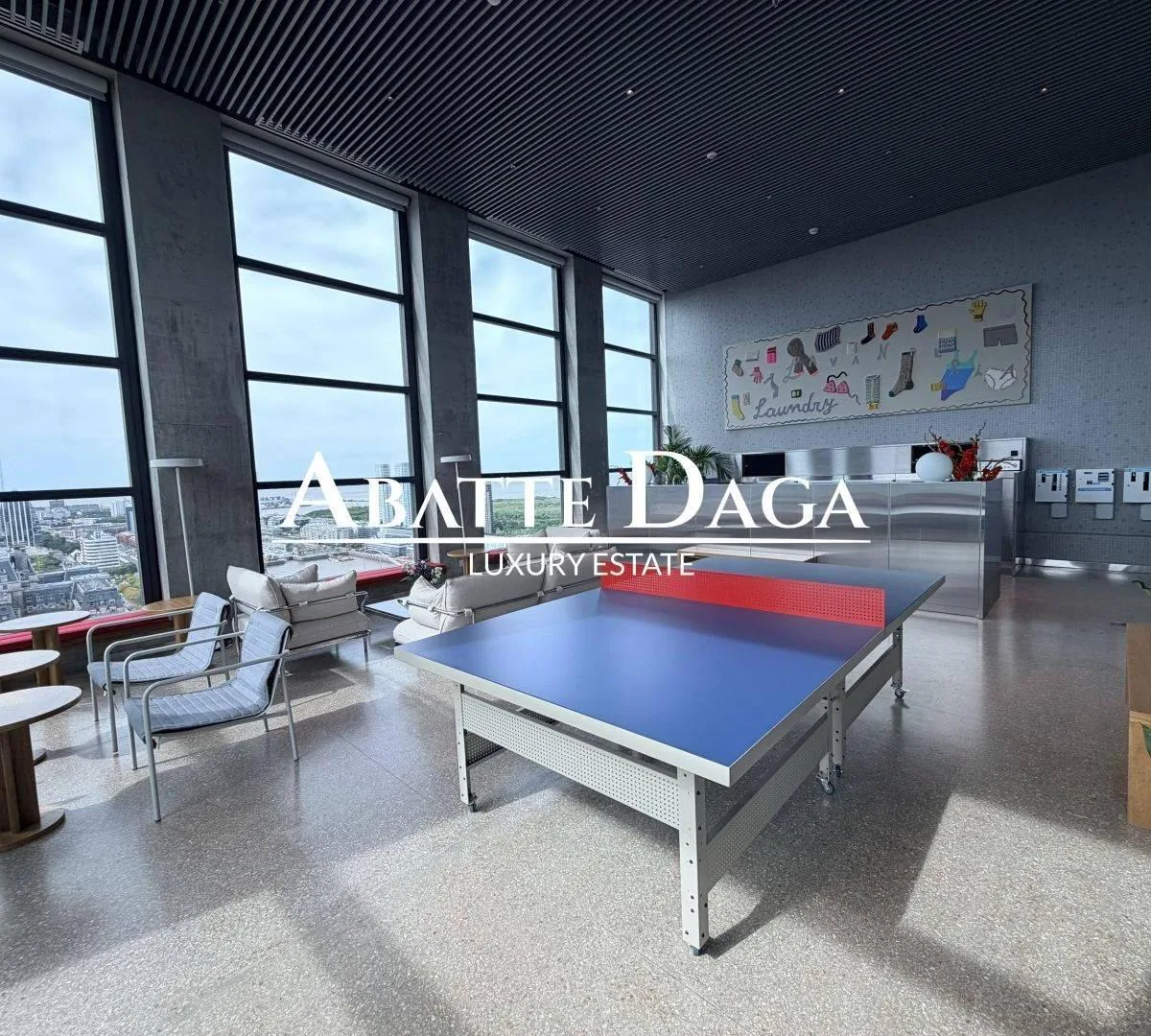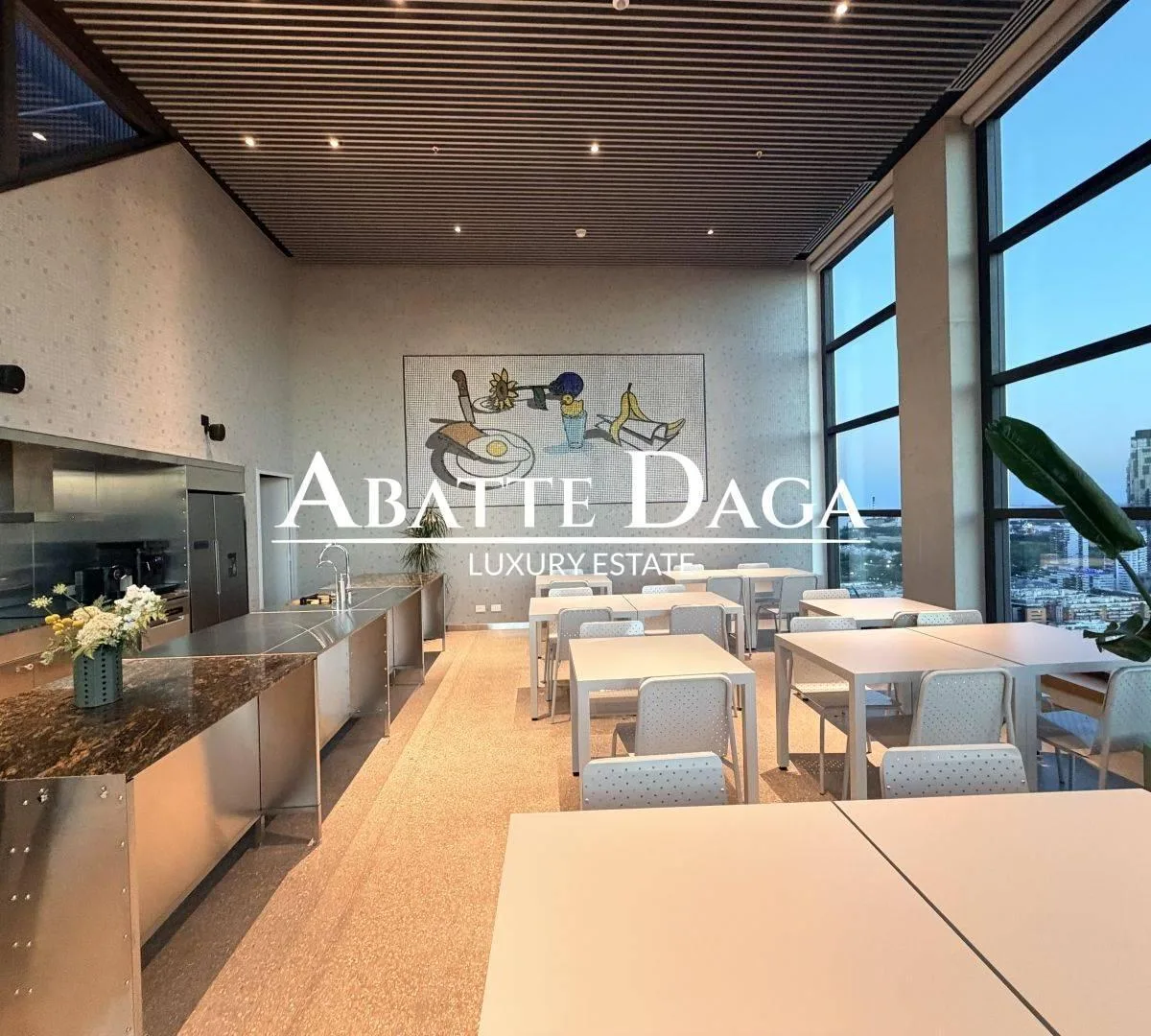 Studio apartment on a high floor in Huergo 475, Puerto Madero. 38 m² total, west-facing. Includes fitted kitchen with lacquered cabinets, electric hotplate and oven, touch screen display with security connection, heating and cooling air conditioning, PVC windows with double-glazed windows, and bathroom with shower screen and single-lever fittings. Building amenities include 24-hour security, coworking and study rooms, laundry, gym, residents' lounge (SUM), a 38th-floor pool with views of Puerto