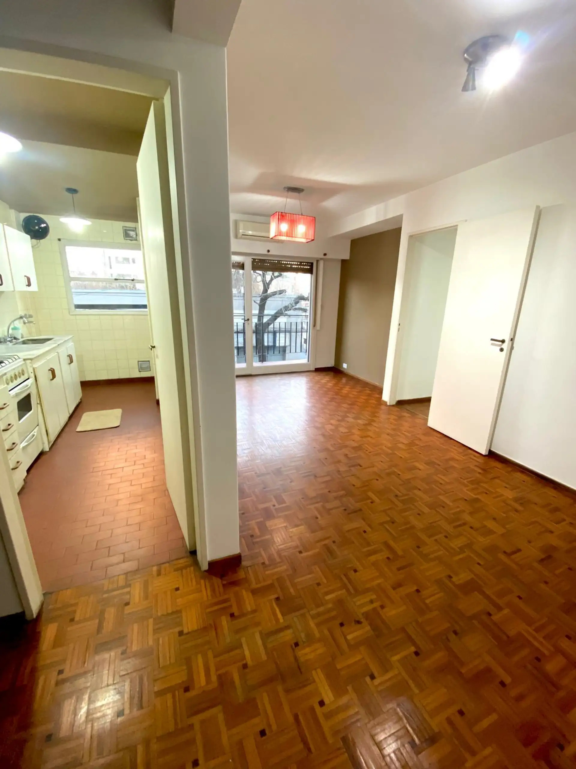 Two-room apartment for rent in Quilmes Centro on Calle Alvear between Humberto Primo and Garibaldi. Living-dining area with a front balcony, air conditioning and storage, plus a separate gas kitchen with upper and lower cabinets. Full bathroom with a bathtub and a bedroom with a fitted wardrobe and window; the unit has been freshly painted. The building has an elevator and the apartment is suitable for professional use or residence, with room for 1 pet.
