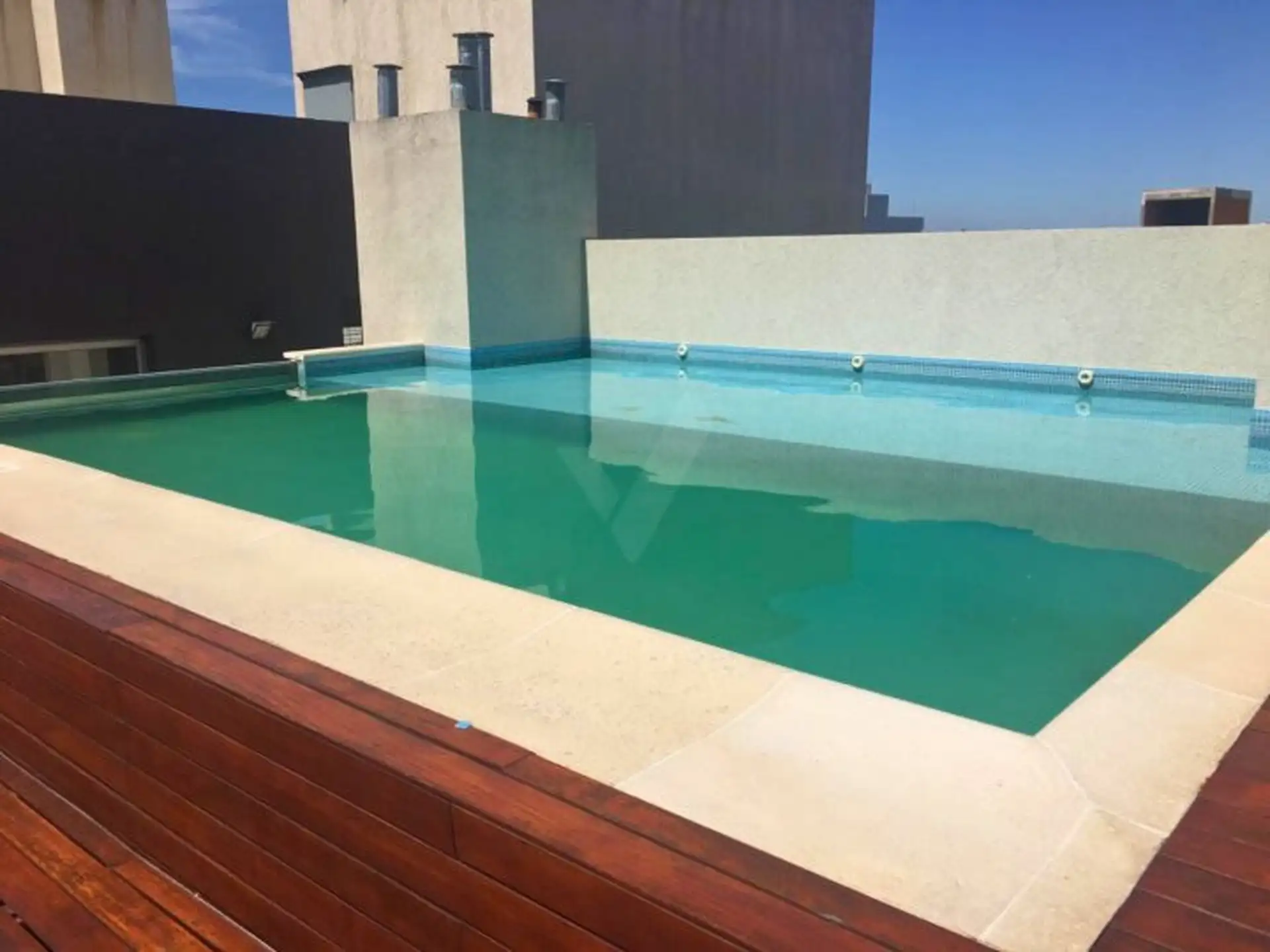 Two-room duplex apartment of 40 m² total area on the 3rd floor, courtyard-facing. The ground level has an integrated kitchen with the living-dining area. The upper level includes a bedroom with built-in wardrobe and a bathroom. The building has a pool and a communal SUM. Building fees are approximately 110,000 ARS.