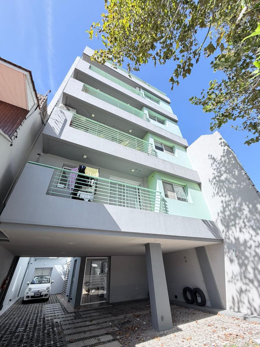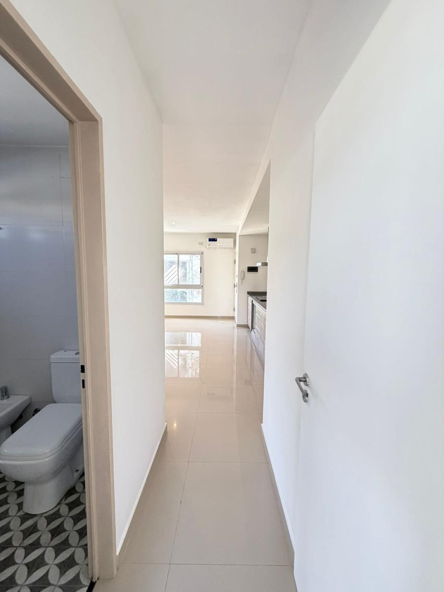 Apartment for rent in Quilmes. It has 2 rooms, 1 bedroom and 1 full bathroom, with an open-plan living and dining area with an integrated kitchen. The kitchen includes a built-in fitted unit, an electric oven and a glass-top cooktop. Flooring is porcelain tile, with a laundry area and a bedroom with a built-in wardrobe and access to a balcony at the back of the building (courtyard-facing). The building has a small terrace with a grill area and a communal room (SUM) with a toilet.