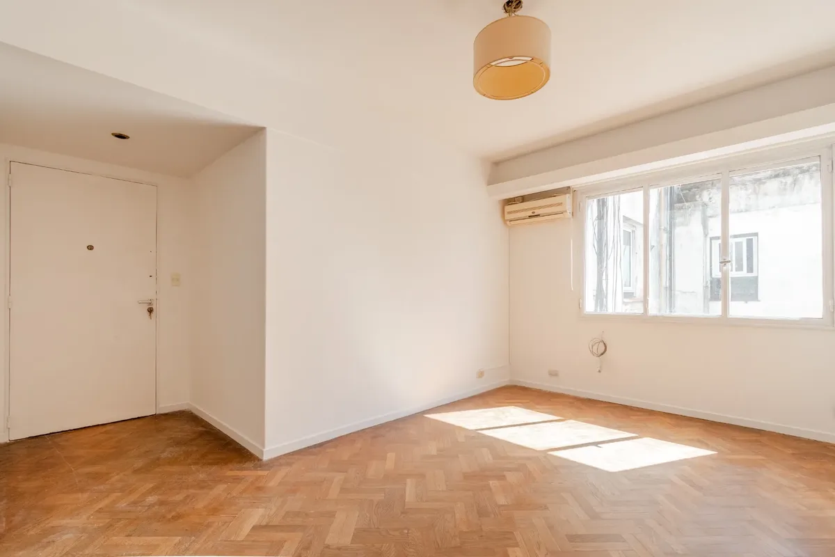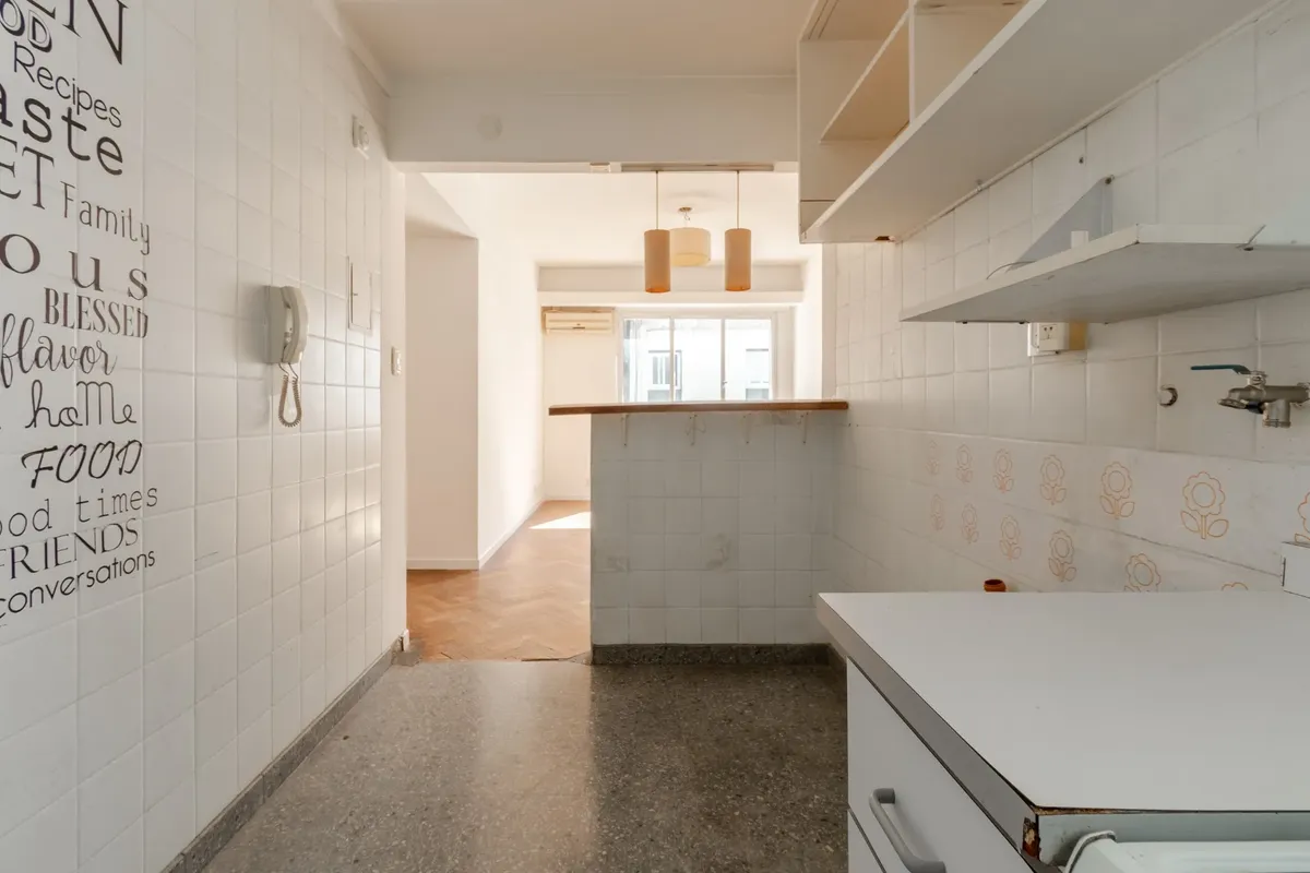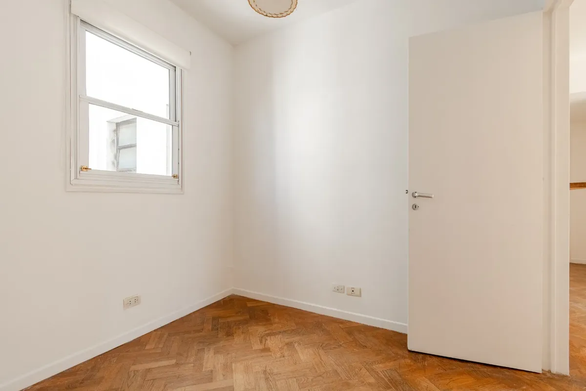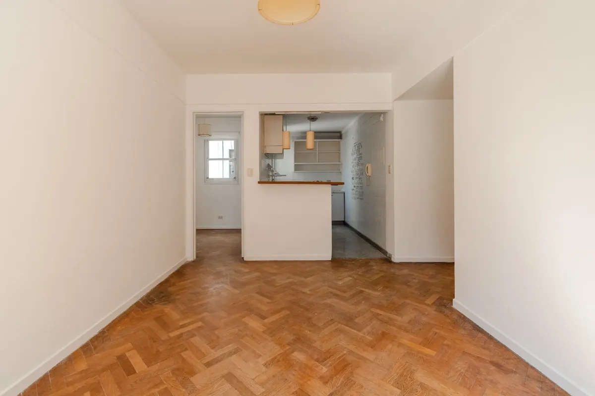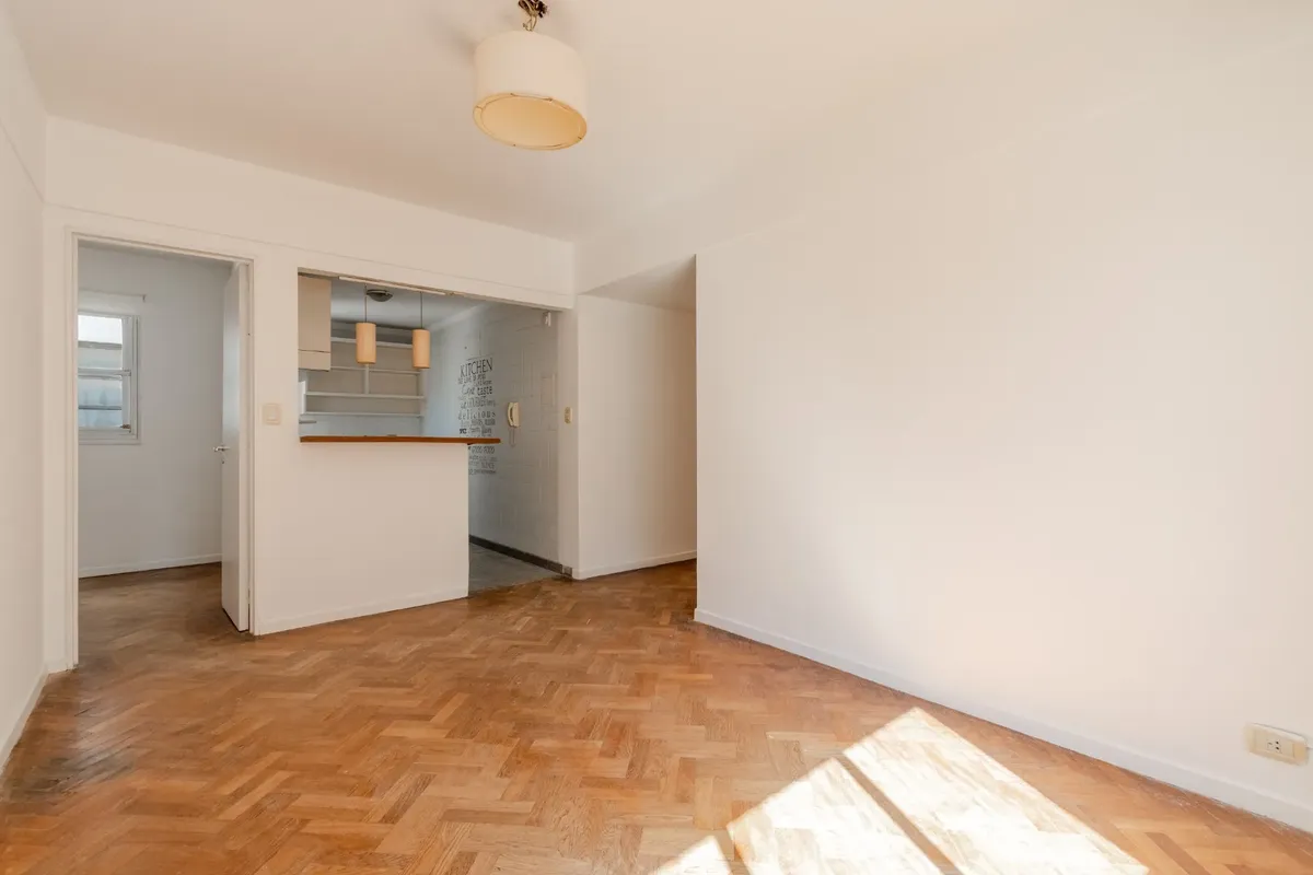 Half-floor apartment with 2.5 rooms and a high floor in Recoleta. Street-facing view over Calle Billinghurst despite being an interior unit. Hardwood parquet floors, a distributor room with a window, full bathroom with natural light and ventilation, and an open-plan kitchen to the living area with space for a washing machine. The building has 2 updated elevators.