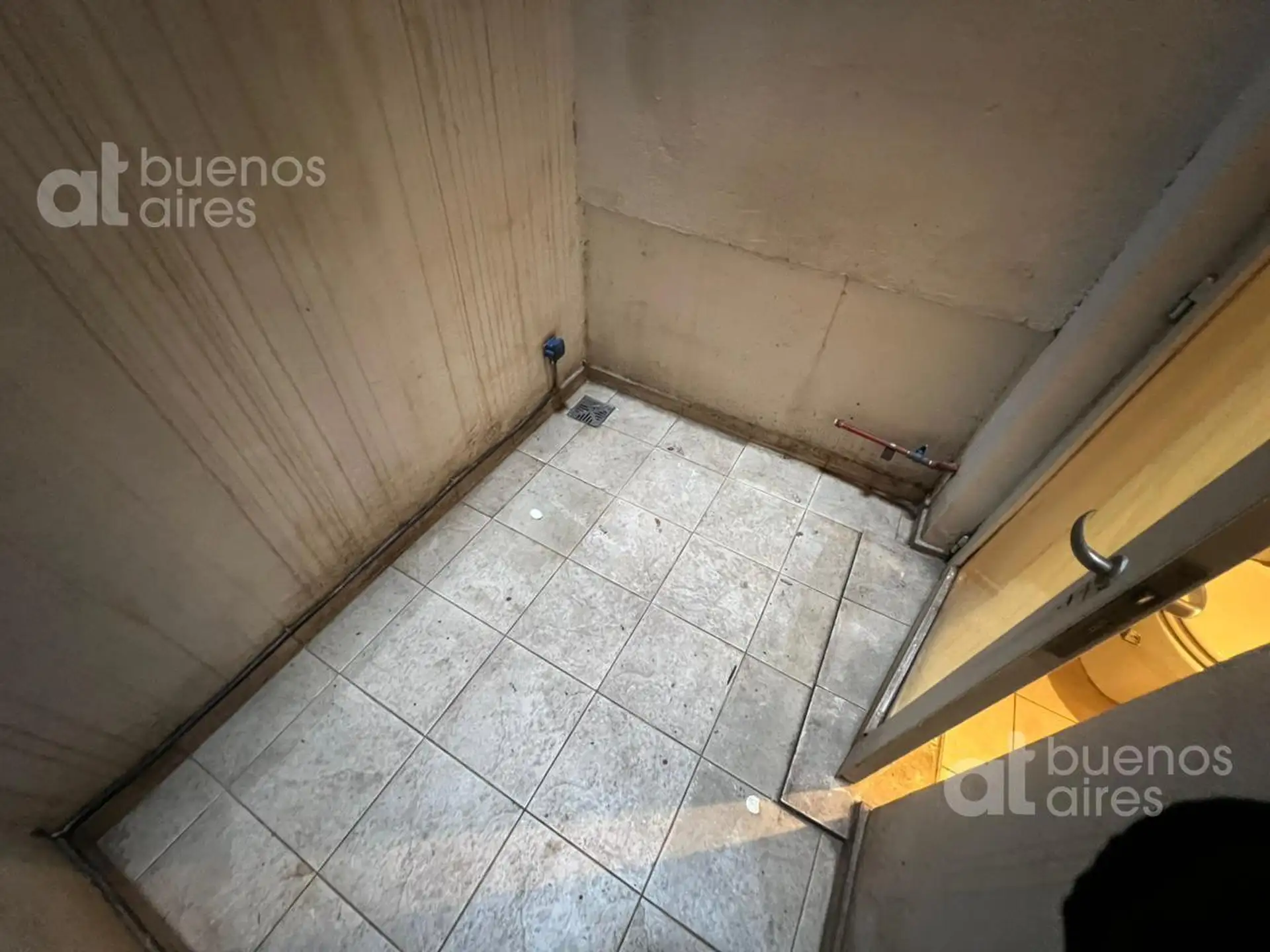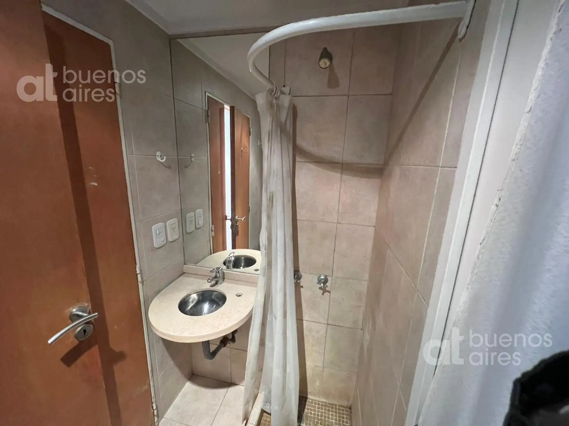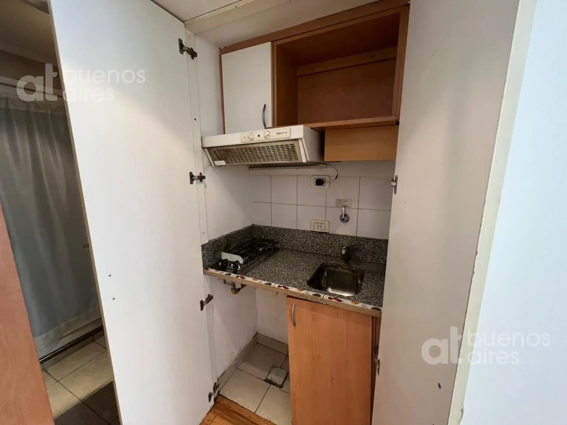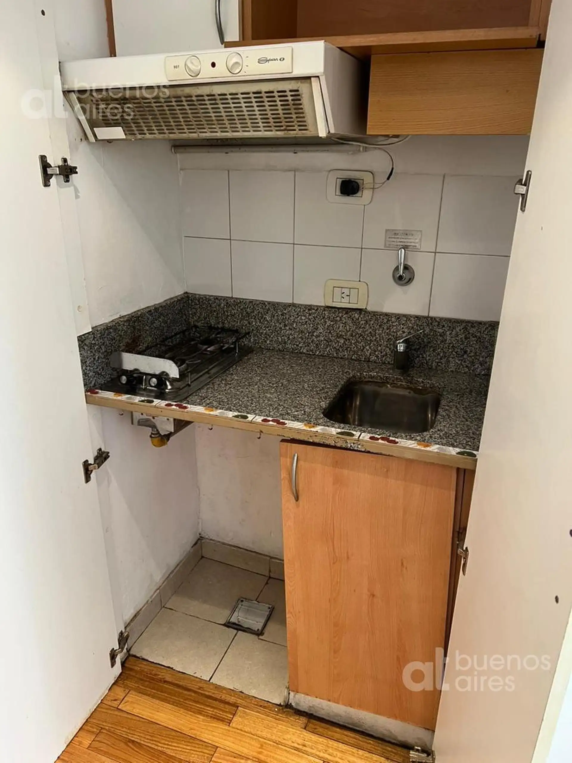 Studio apartment in Recoleta, available from 01/04/2026. Street-facing unit with a front balcony, kitchenette with gas cooktop, and a shower bathroom with access to the interior courtyard. Includes hot-water radiant flooring and split air conditioning (hot/cold). Rent is listed as the posted value plus building fees and utilities, with water included in the building fees. Entry requires 1 month advance, 1 month deposit, and 1 property guarantor in Buenos Aires or rental guarantee insurance, plus