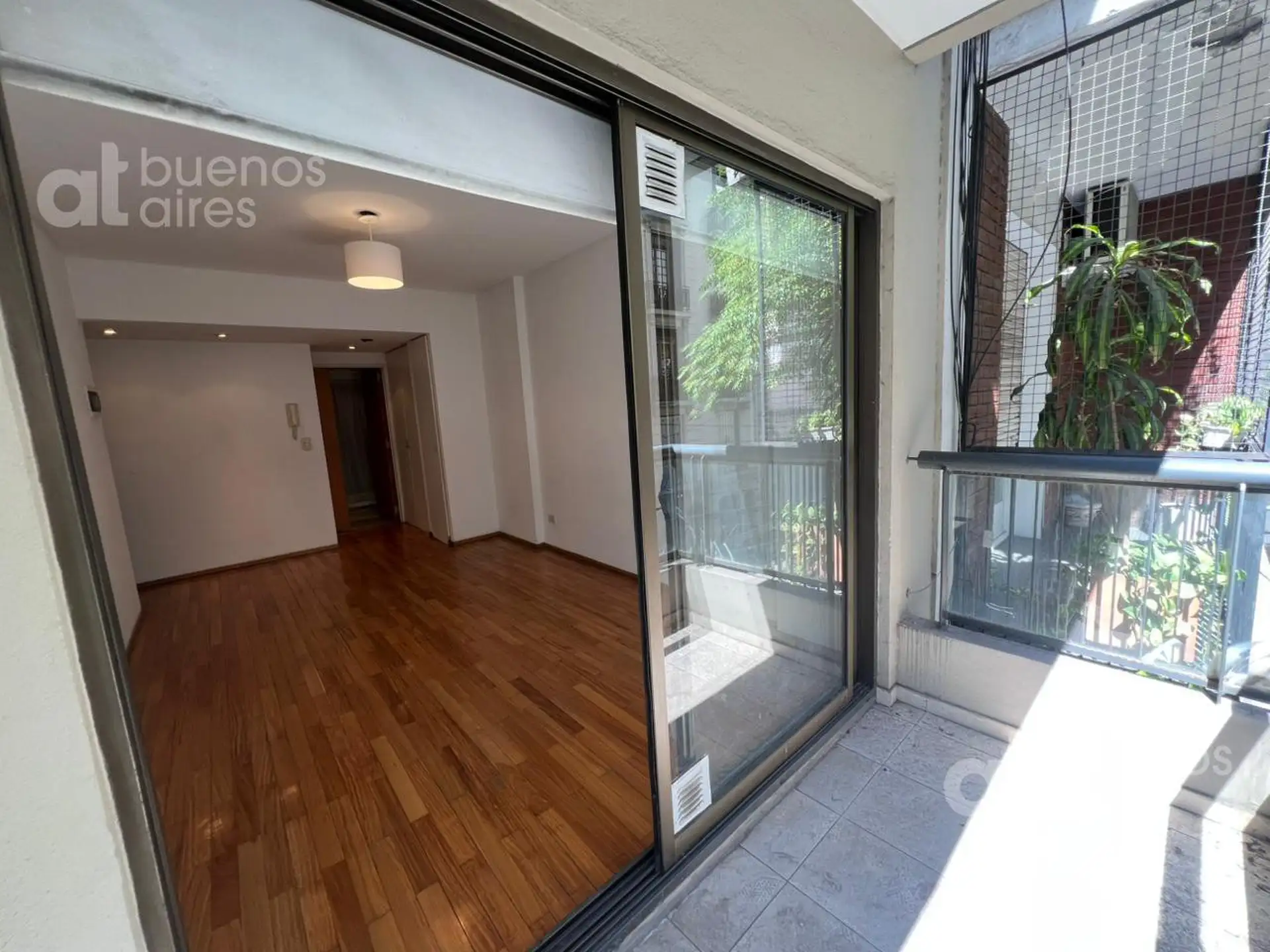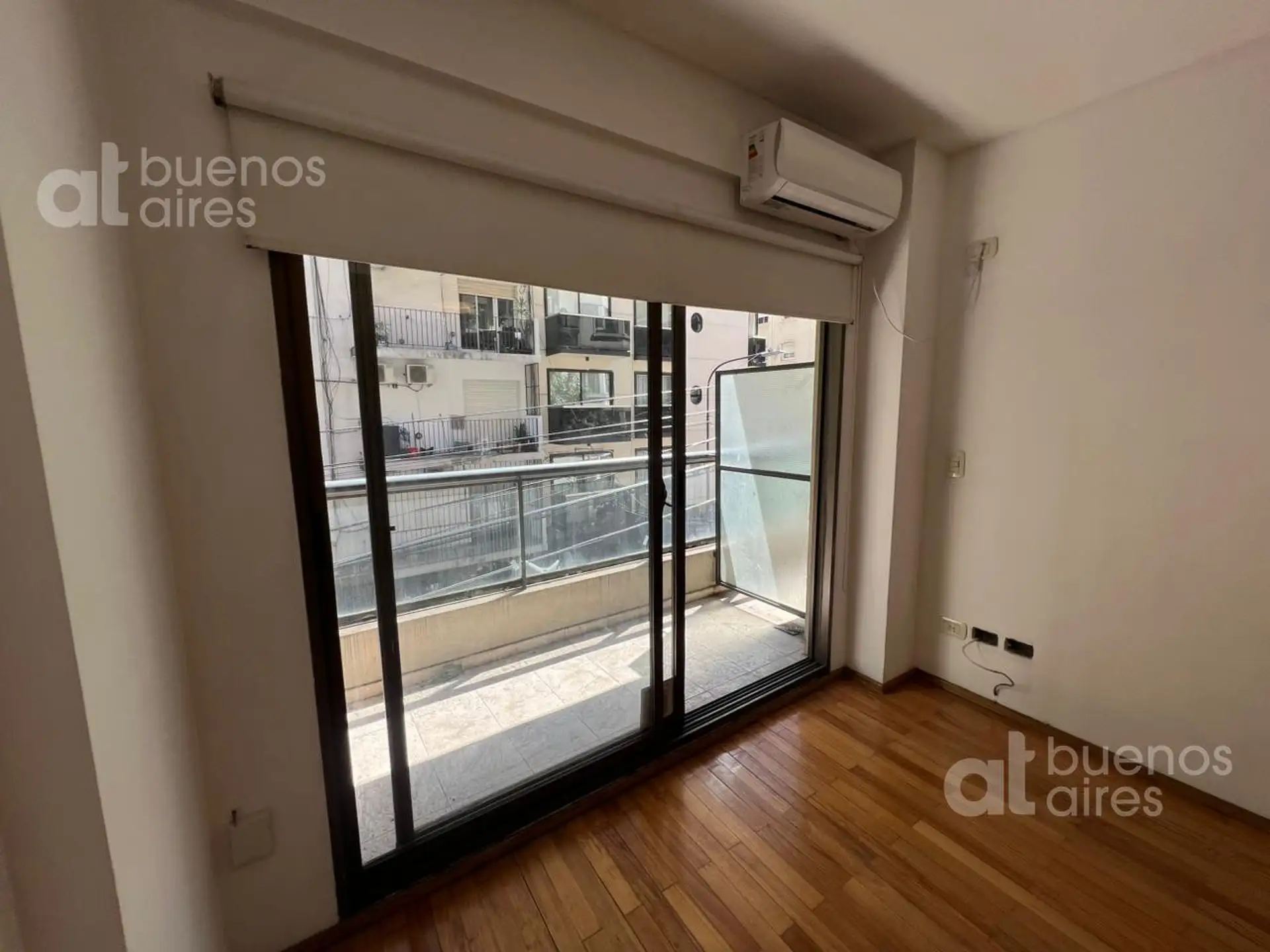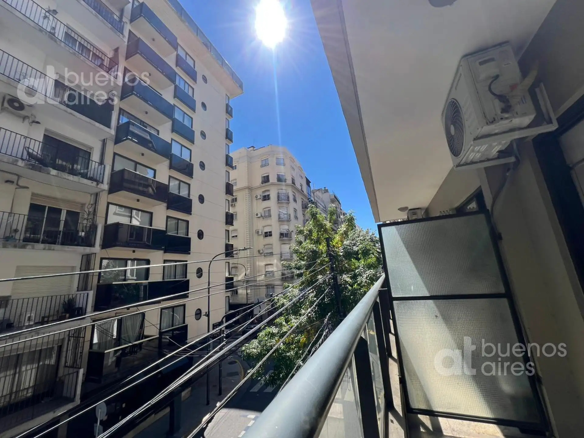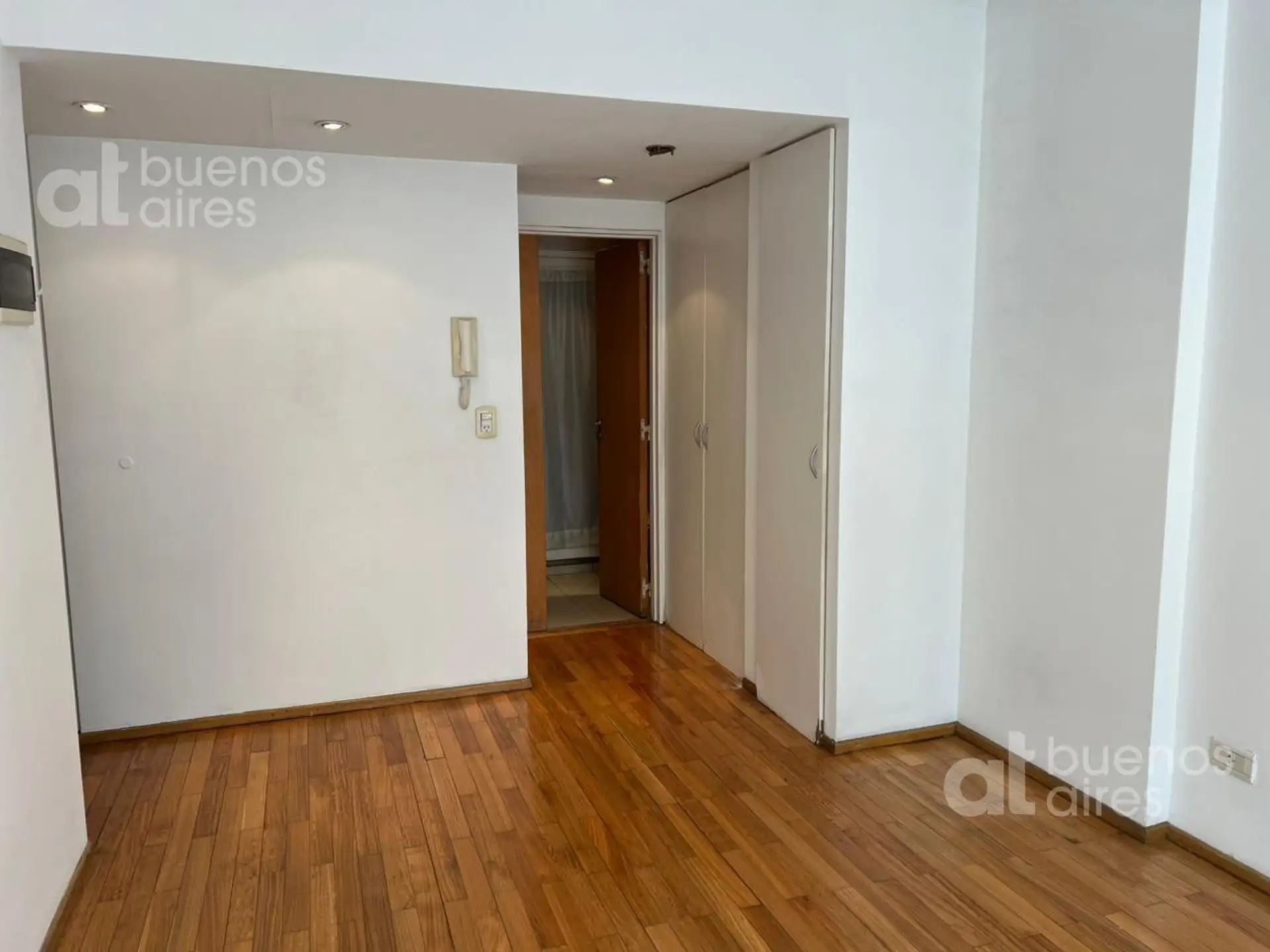 Studio apartment in Recoleta, available from 01/04/2026. Street-facing unit with a front balcony, kitchenette with gas cooktop, and a shower bathroom with access to the interior courtyard. Includes hot-water radiant flooring and split air conditioning (hot/cold). Rent is listed as the posted value plus building fees and utilities, with water included in the building fees. Entry requires 1 month advance, 1 month deposit, and 1 property guarantor in Buenos Aires or rental guarantee insurance, plus