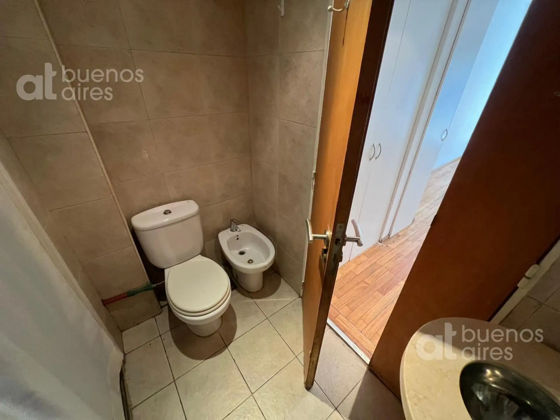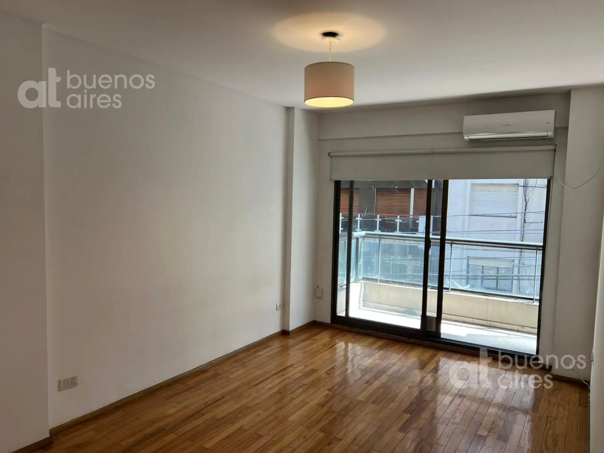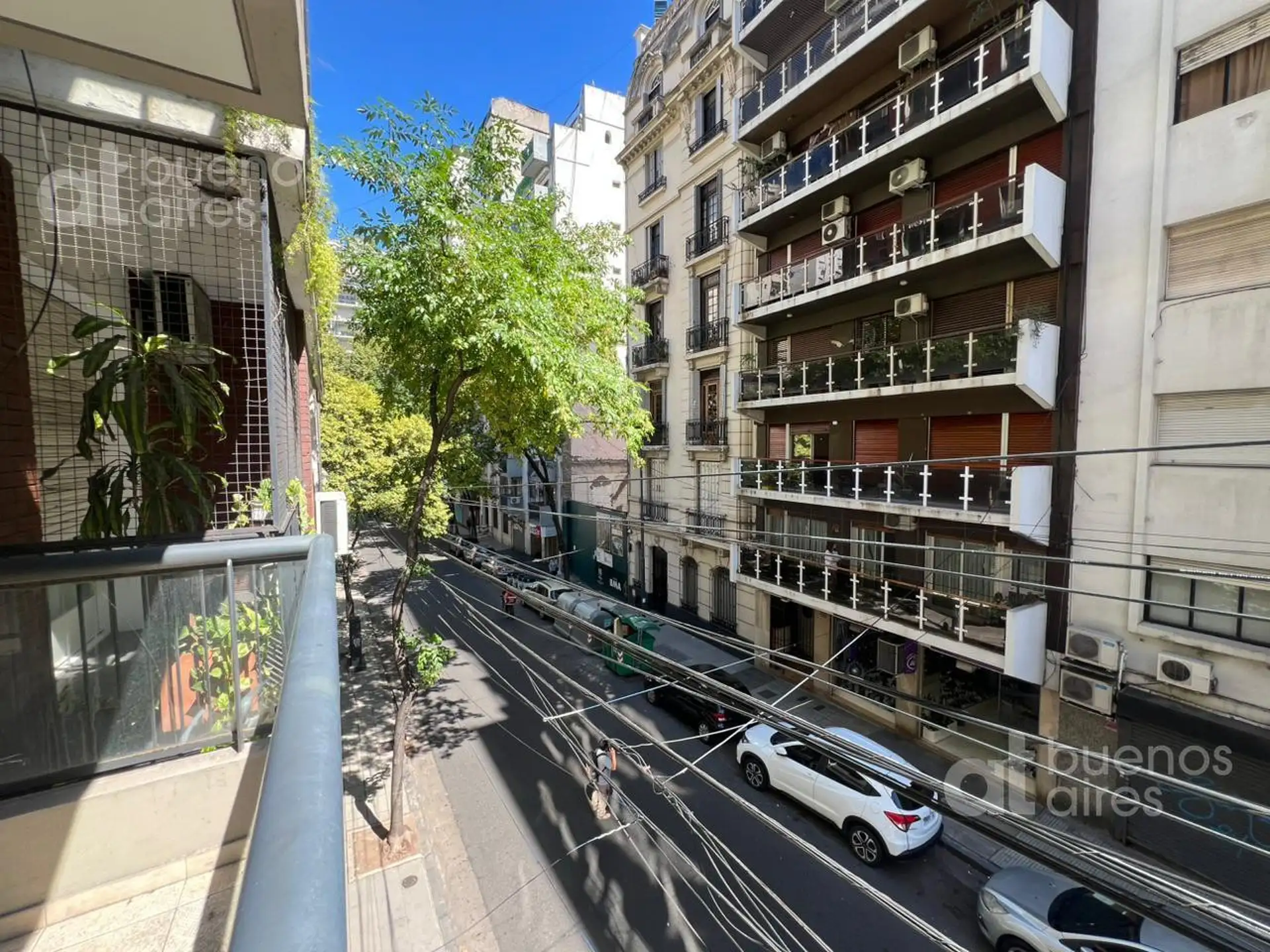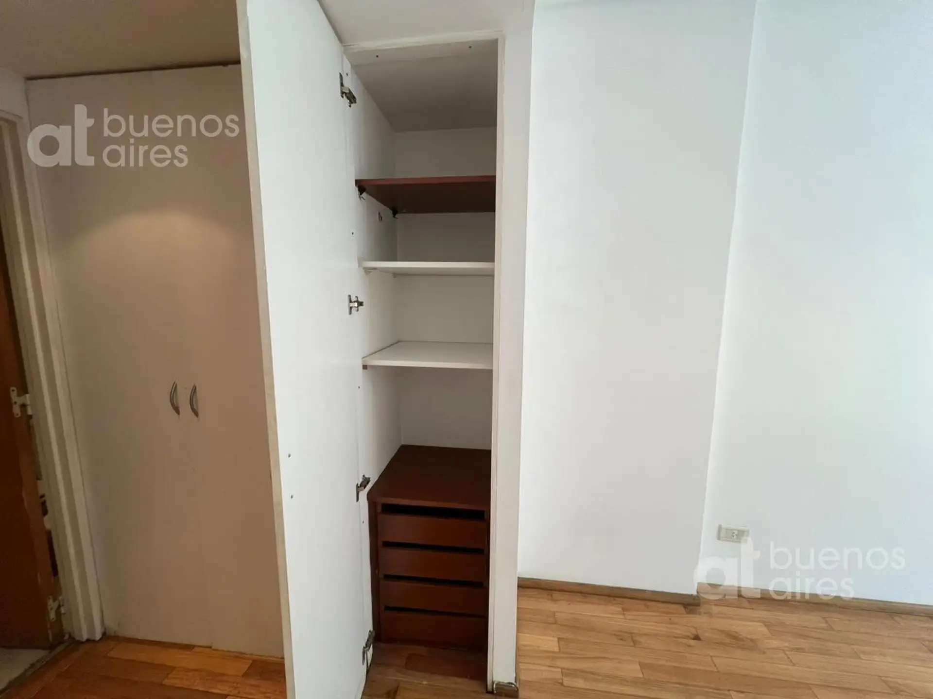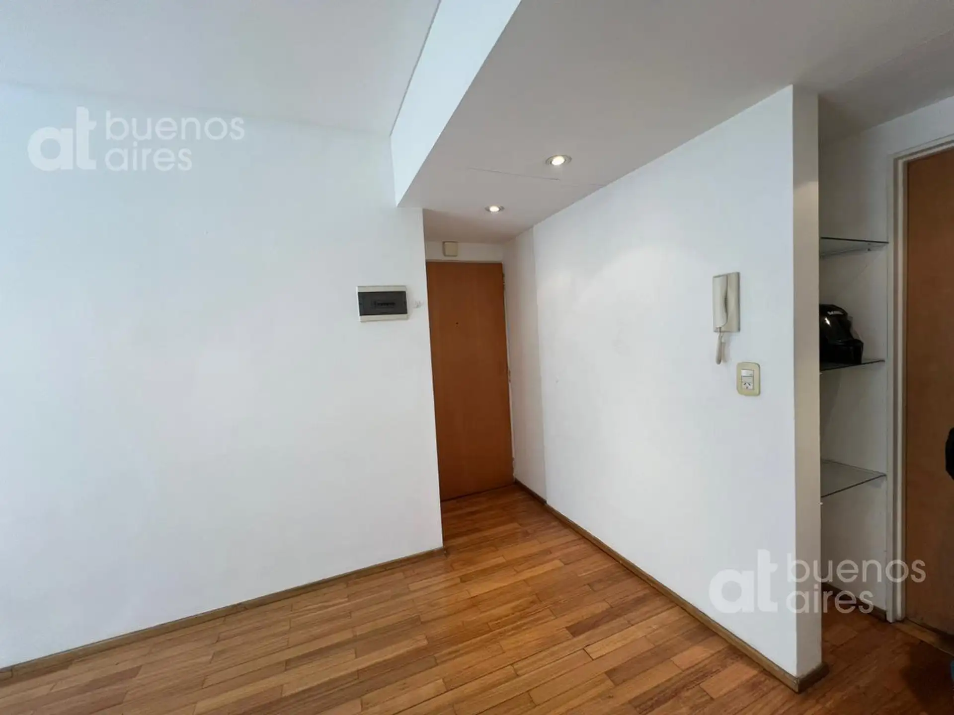 Studio apartment in Recoleta, available from 01/04/2026. Street-facing unit with a front balcony, kitchenette with gas cooktop, and a shower bathroom with access to the interior courtyard. Includes hot-water radiant flooring and split air conditioning (hot/cold). Rent is listed as the posted value plus building fees and utilities, with water included in the building fees. Entry requires 1 month advance, 1 month deposit, and 1 property guarantor in Buenos Aires or rental guarantee insurance, plus