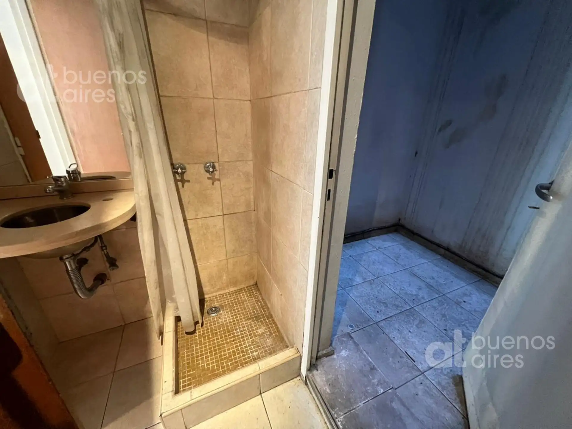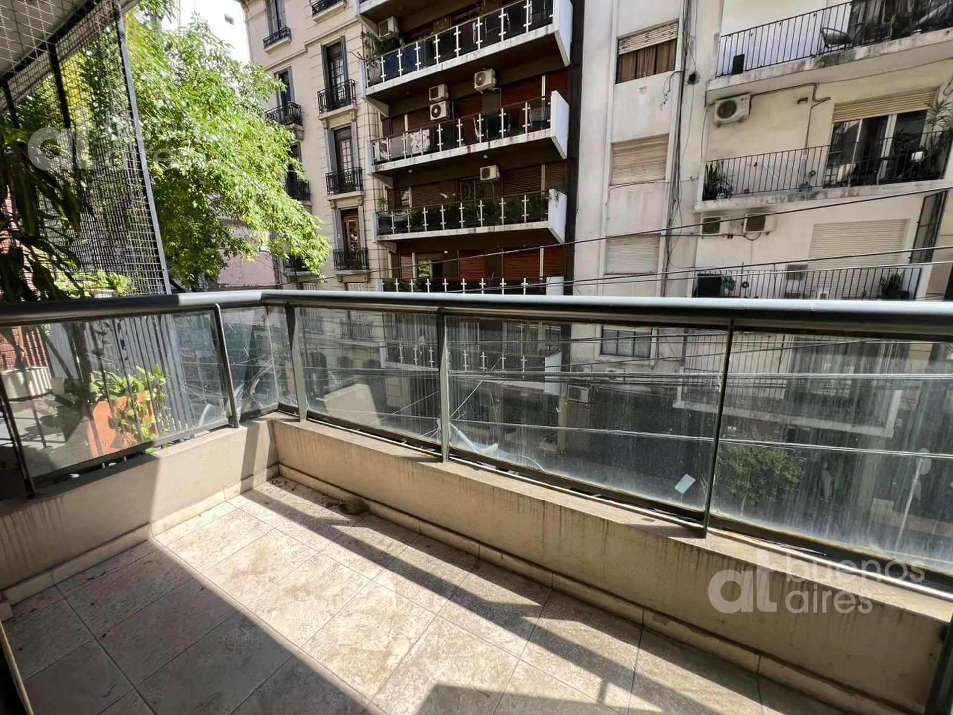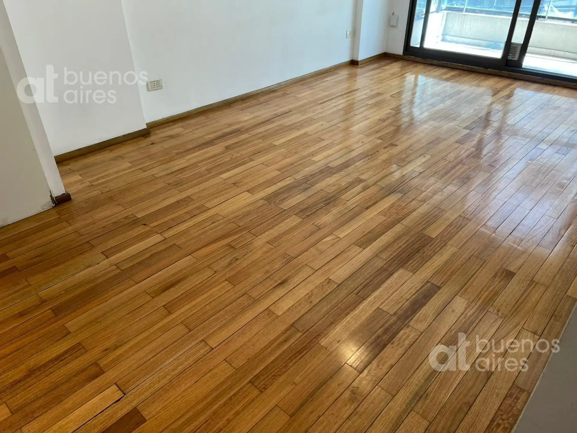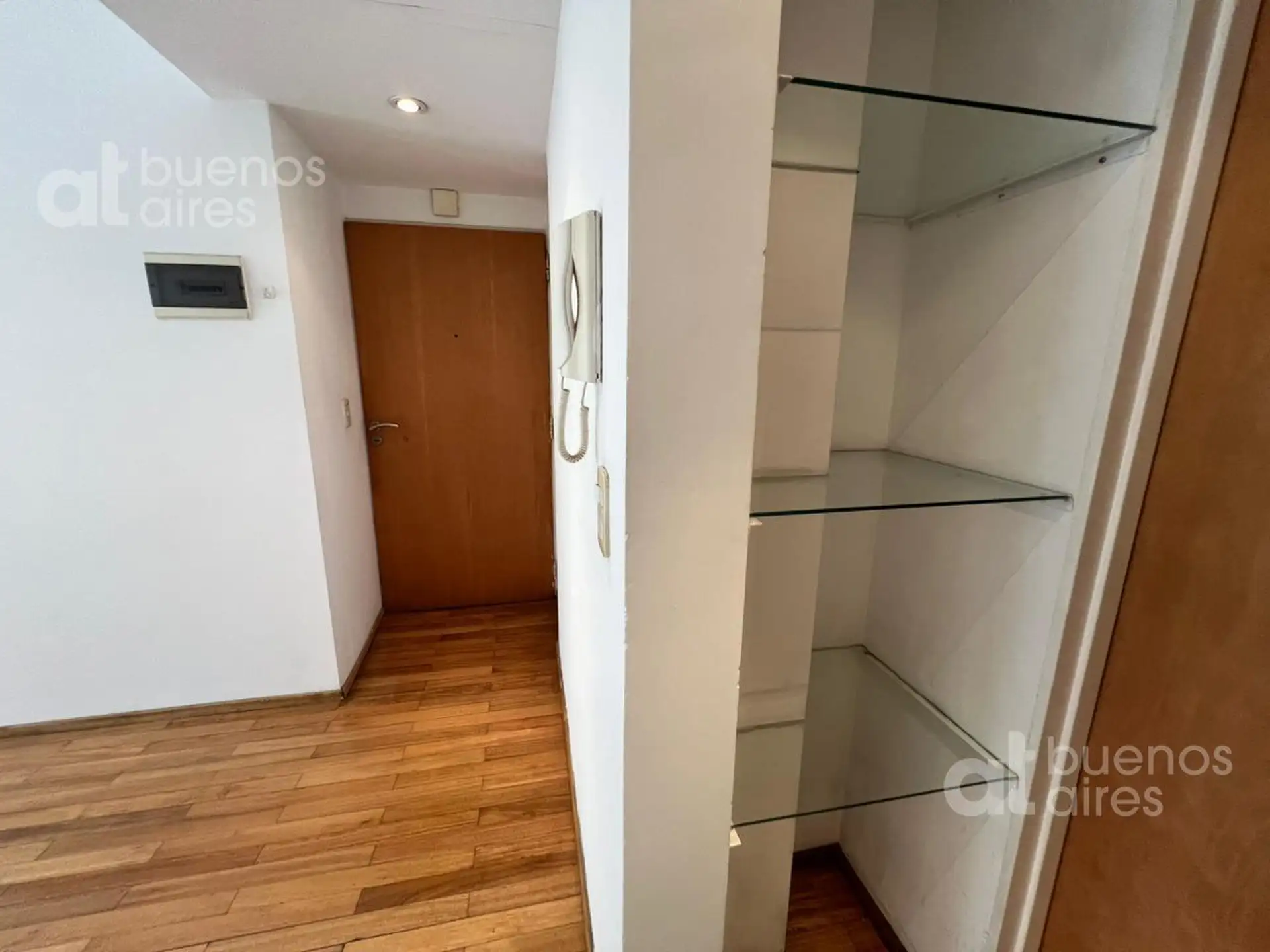 Studio apartment in Recoleta, available from 01/04/2026. Street-facing unit with a front balcony, kitchenette with gas cooktop, and a shower bathroom with access to the interior courtyard. Includes hot-water radiant flooring and split air conditioning (hot/cold). Rent is listed as the posted value plus building fees and utilities, with water included in the building fees. Entry requires 1 month advance, 1 month deposit, and 1 property guarantor in Buenos Aires or rental guarantee insurance, plus