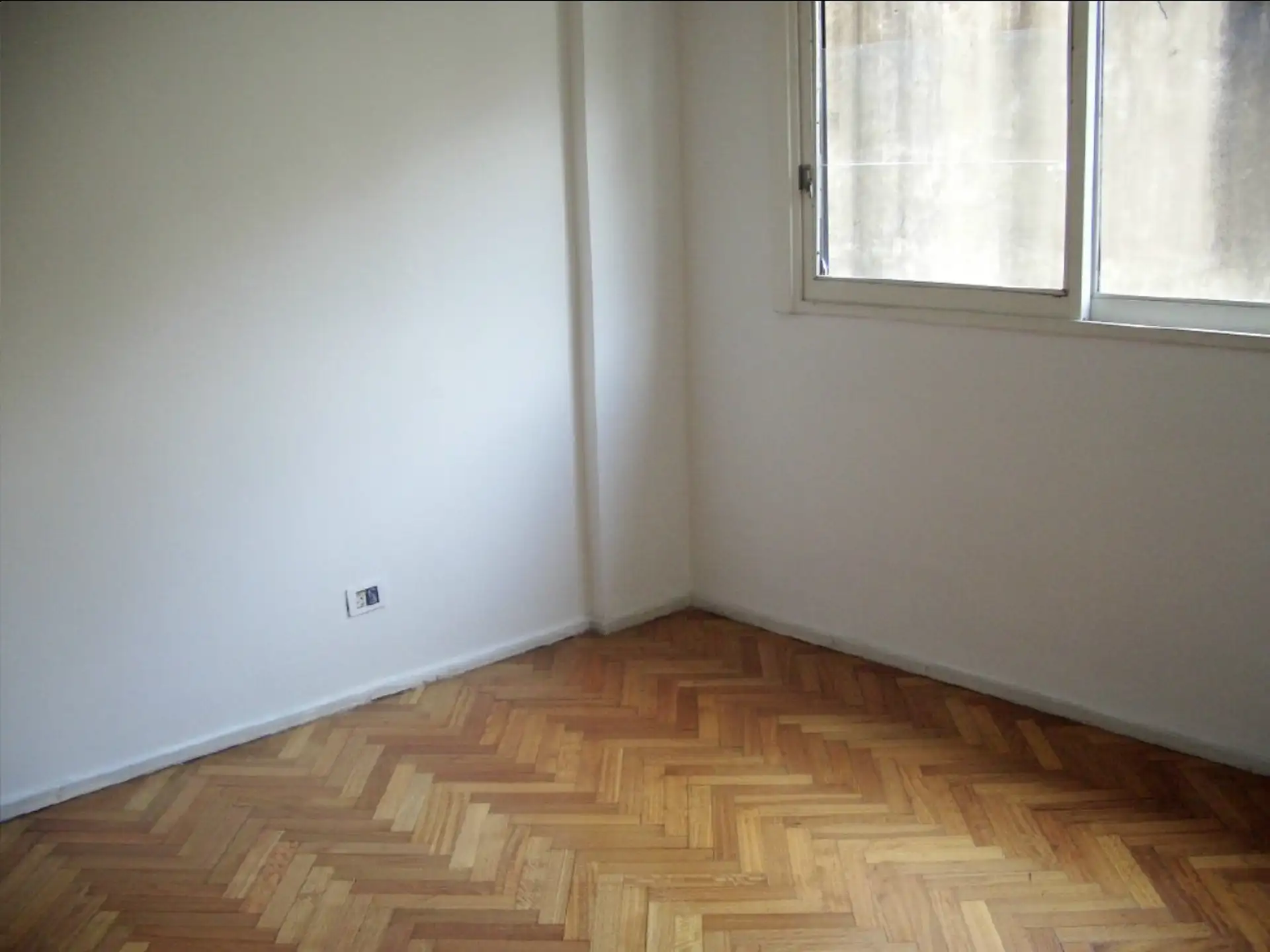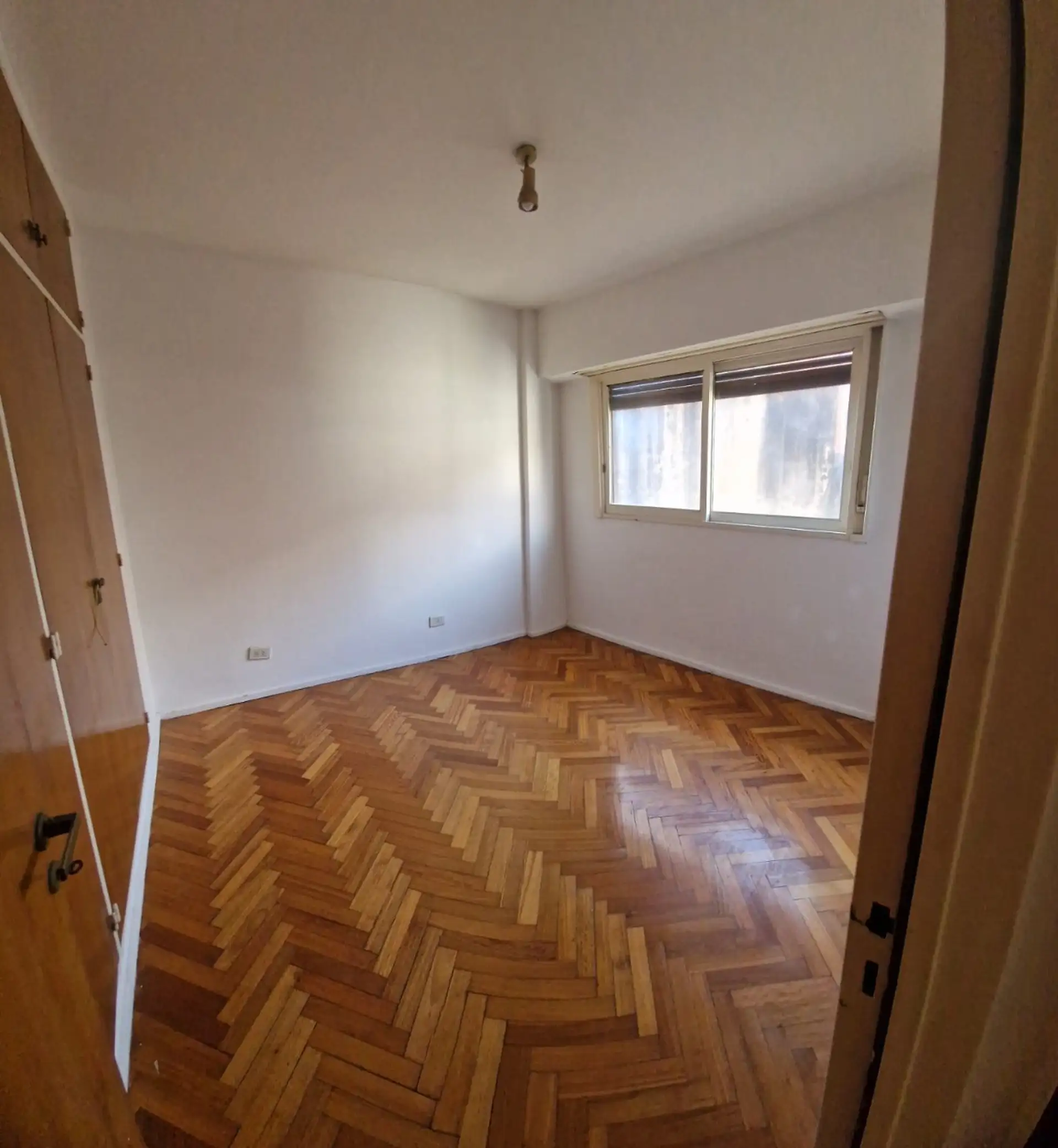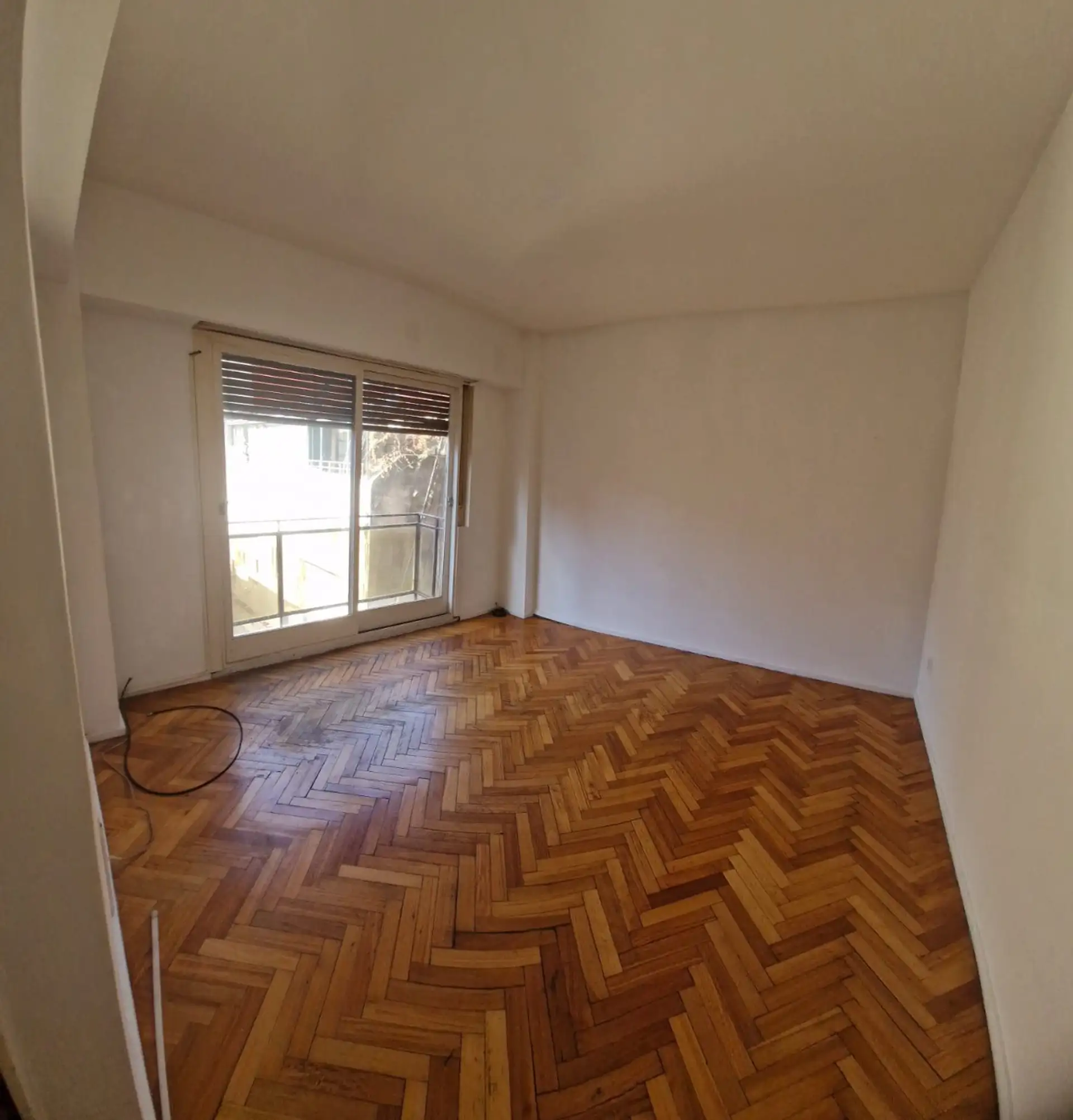 Two-room apartment with a partial tower view and street-facing windows in Recoleta Botanico. Total private area is 38.48 m², with a shared lobby, parquet flooring, and elevator access. The unit has one bedroom with four-door wardrobe, a living-dining room that opens to a narrow balcony, a small kitchen with space for a fridge, a full bathroom, and a separate laundry area. Hot water is provided by a gas heater (calefón) and heating is via a slab heater (losa radiante). Building fees are ARS 176,2