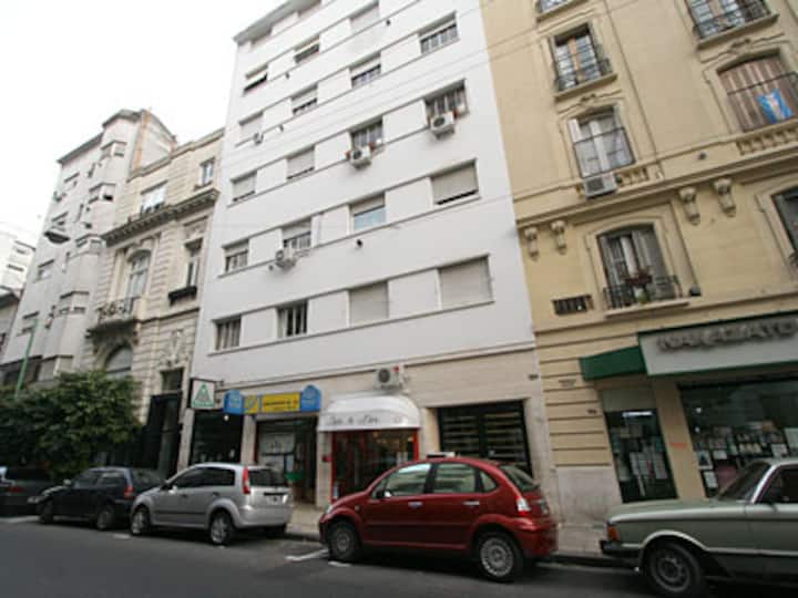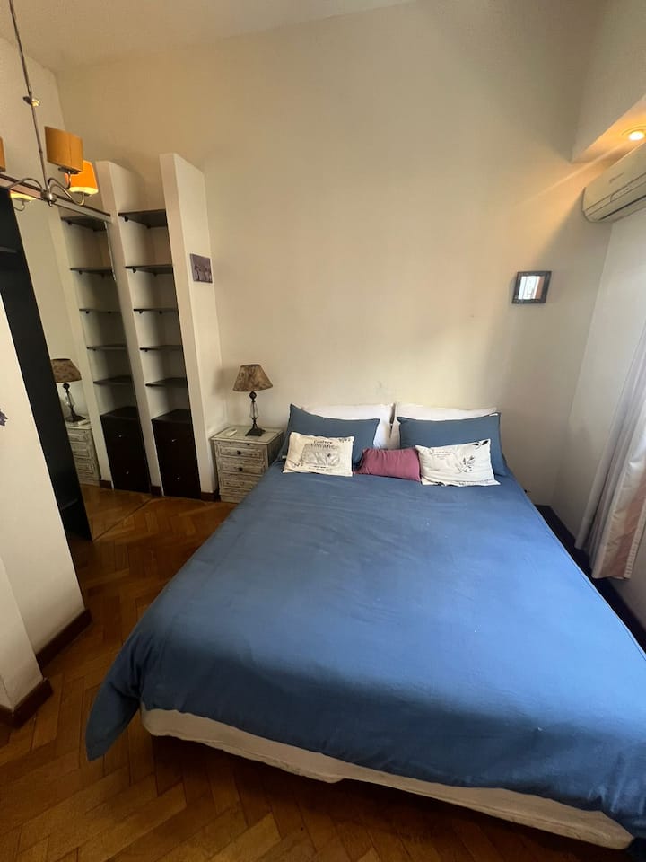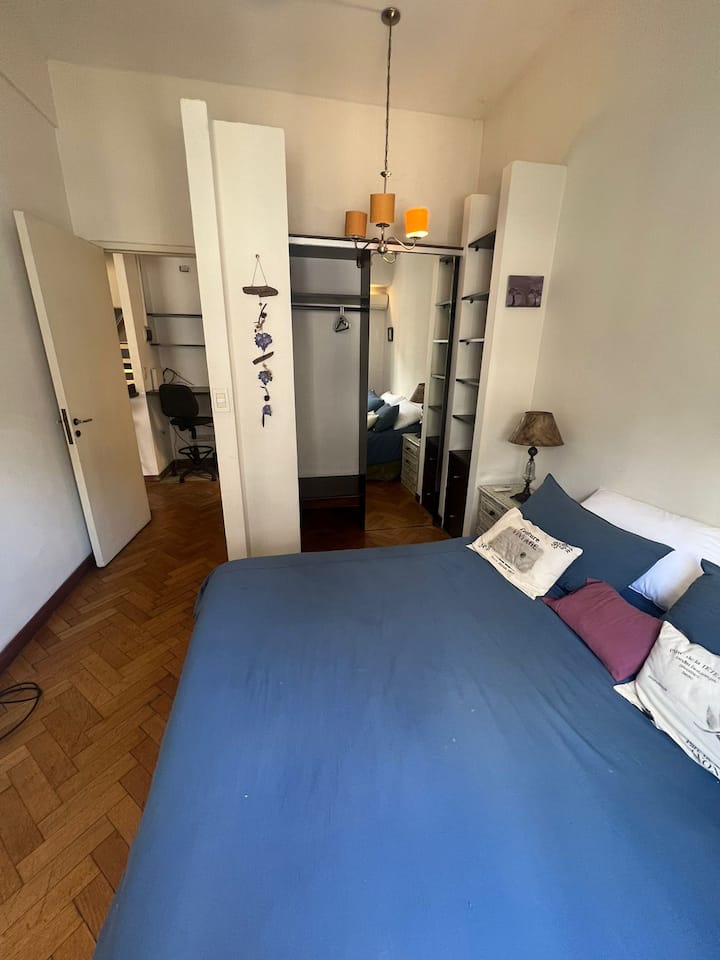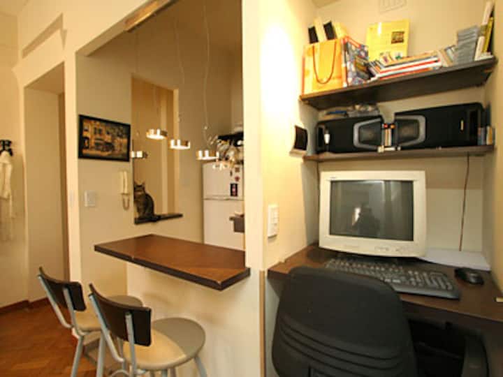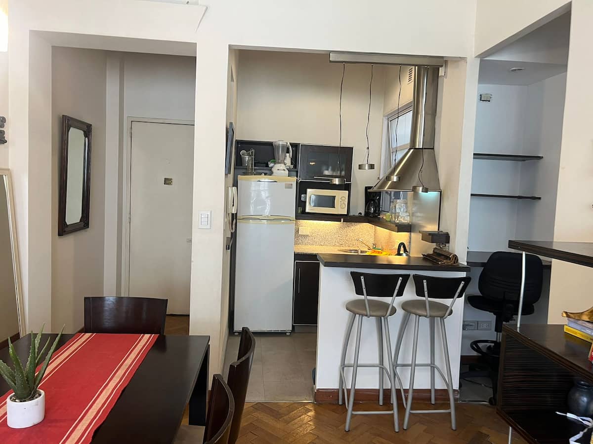 Furnished two-room apartment in Recoleta with 1 bedroom and a dressing room. There is an open-plan American kitchen with a bar, a desk, a living room, and a full bathroom with a bathtub. Hot water is central, and hot/cold air conditioning is installed in both rooms, while the living room has stable A/C. The bathroom and kitchen have windows for ventilation.