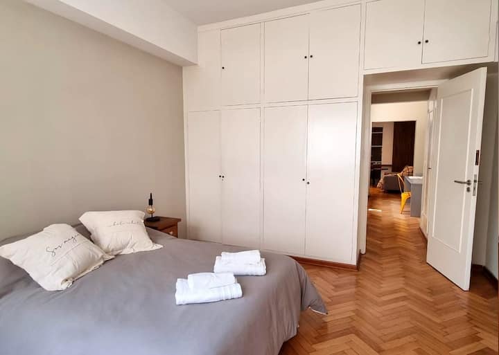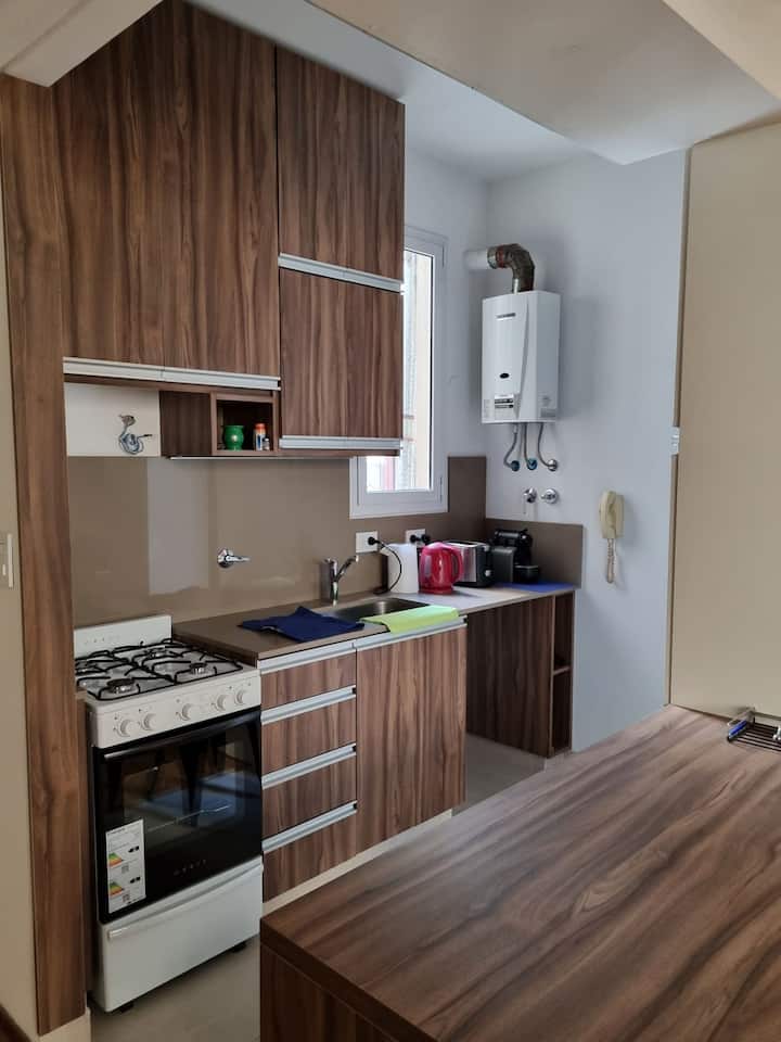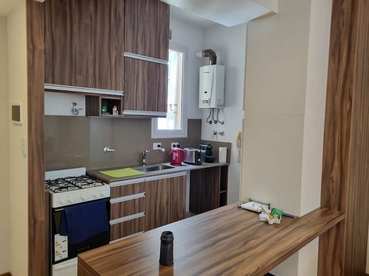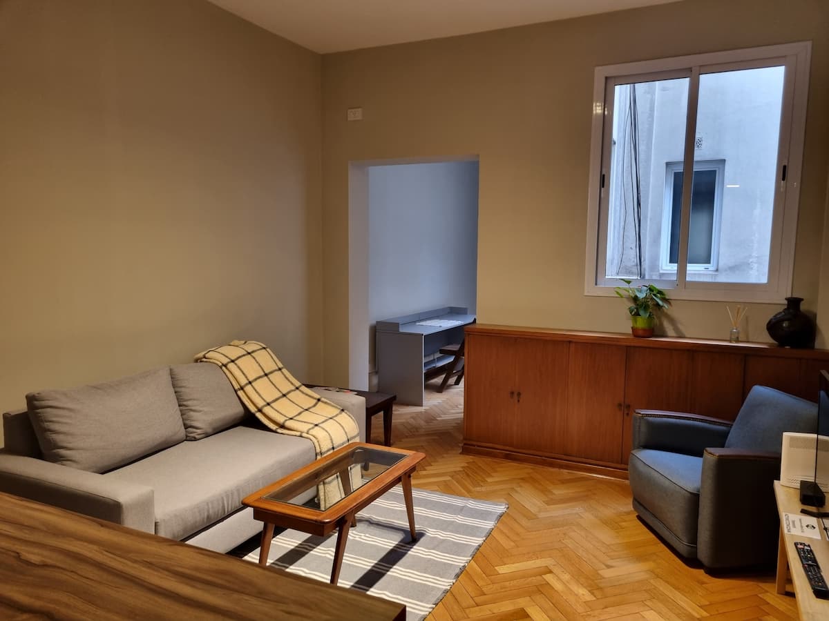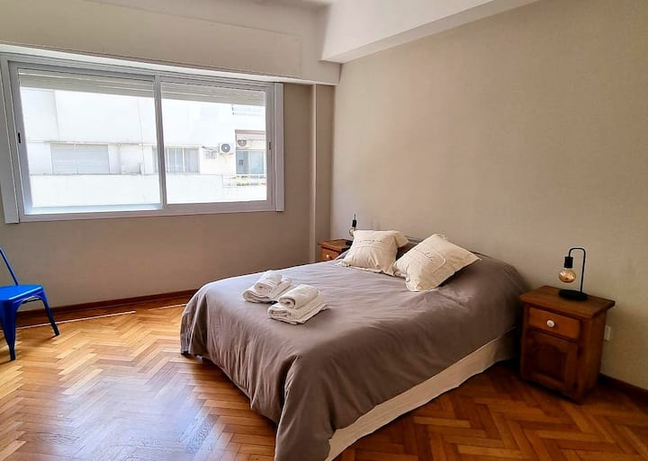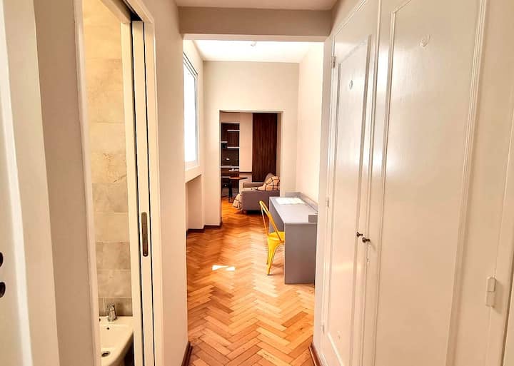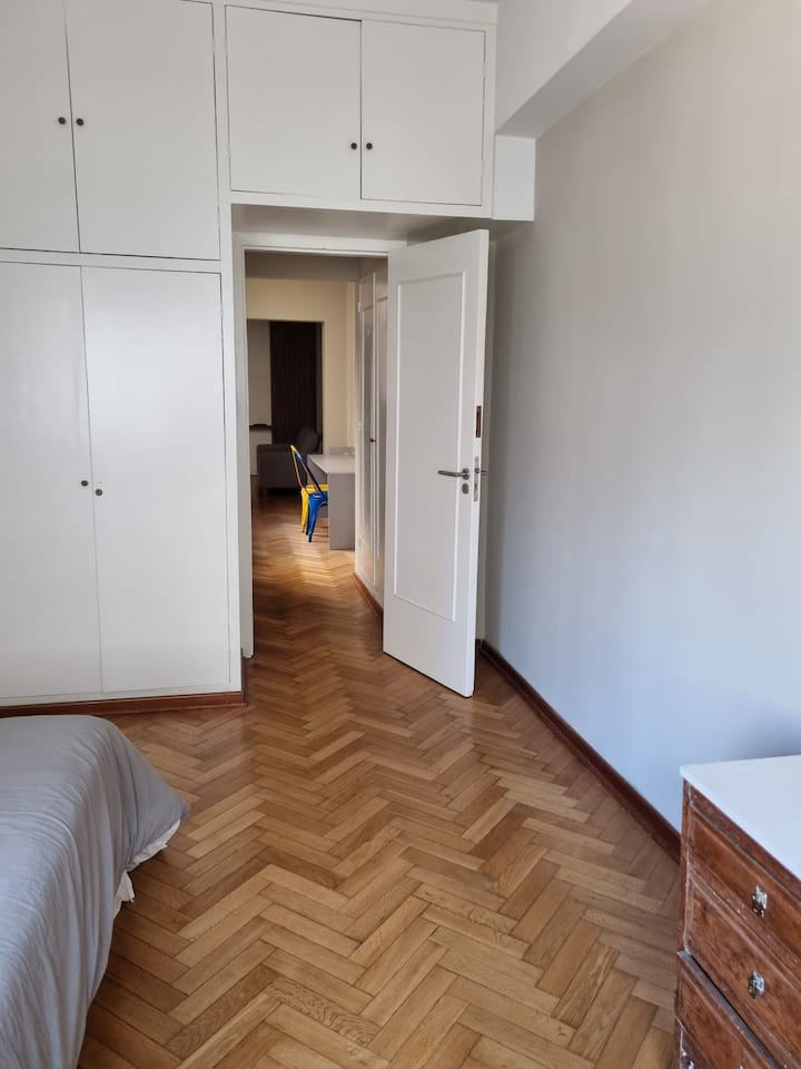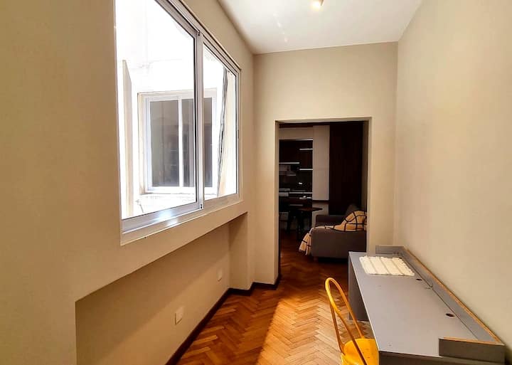 Two-room apartment on the 6th floor on Uriburu Street, Recoleta, across the street. The unit has 58 m², with a front bedroom measuring 6 x 5 and a bathroom. The kitchen is integrated with the living room, and there is a hallway with a desk. Located five blocks from Cementerio de la Recoleta and two blocks from El Ateneo; public transport access includes bus routes and underground lines.