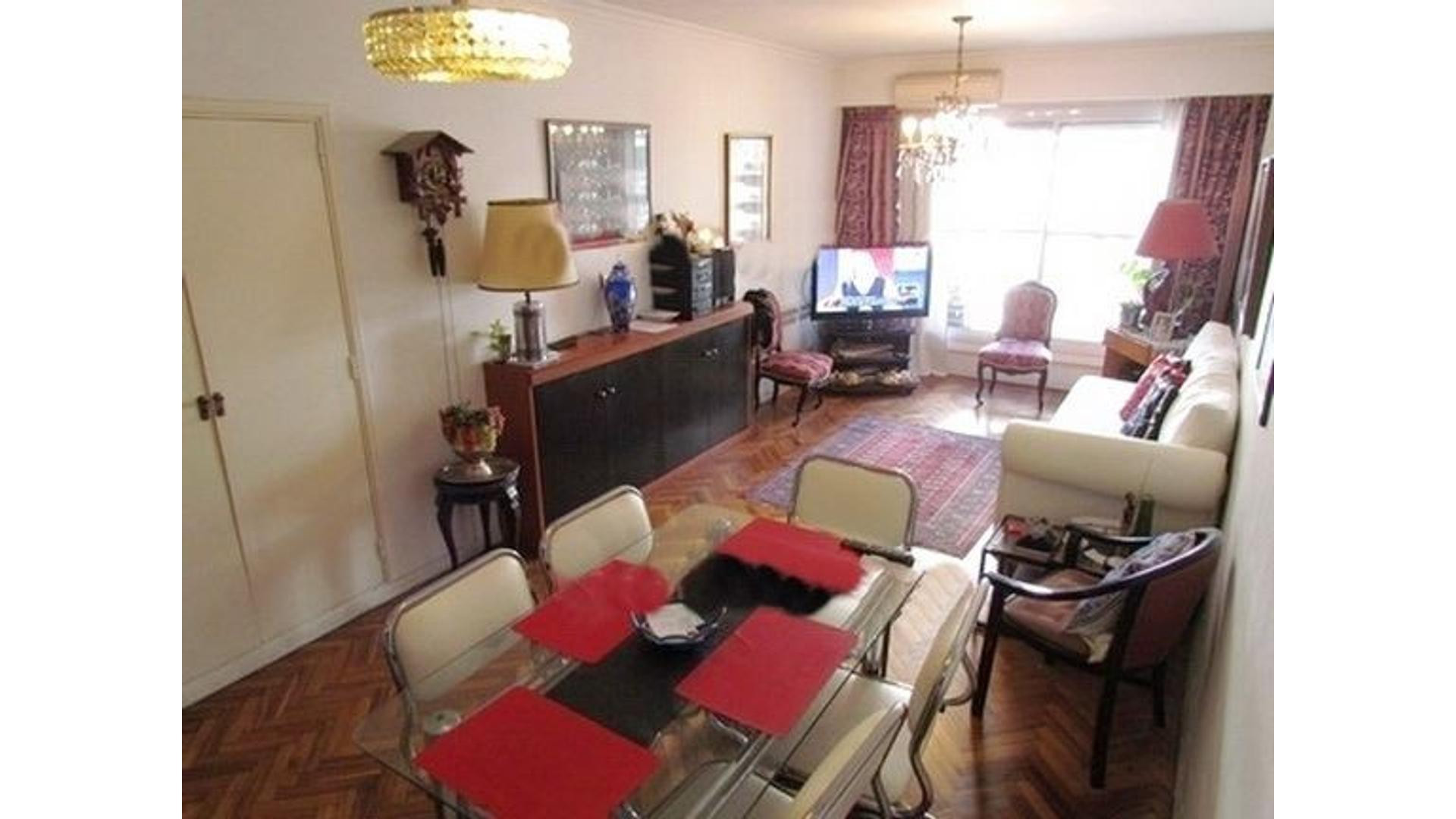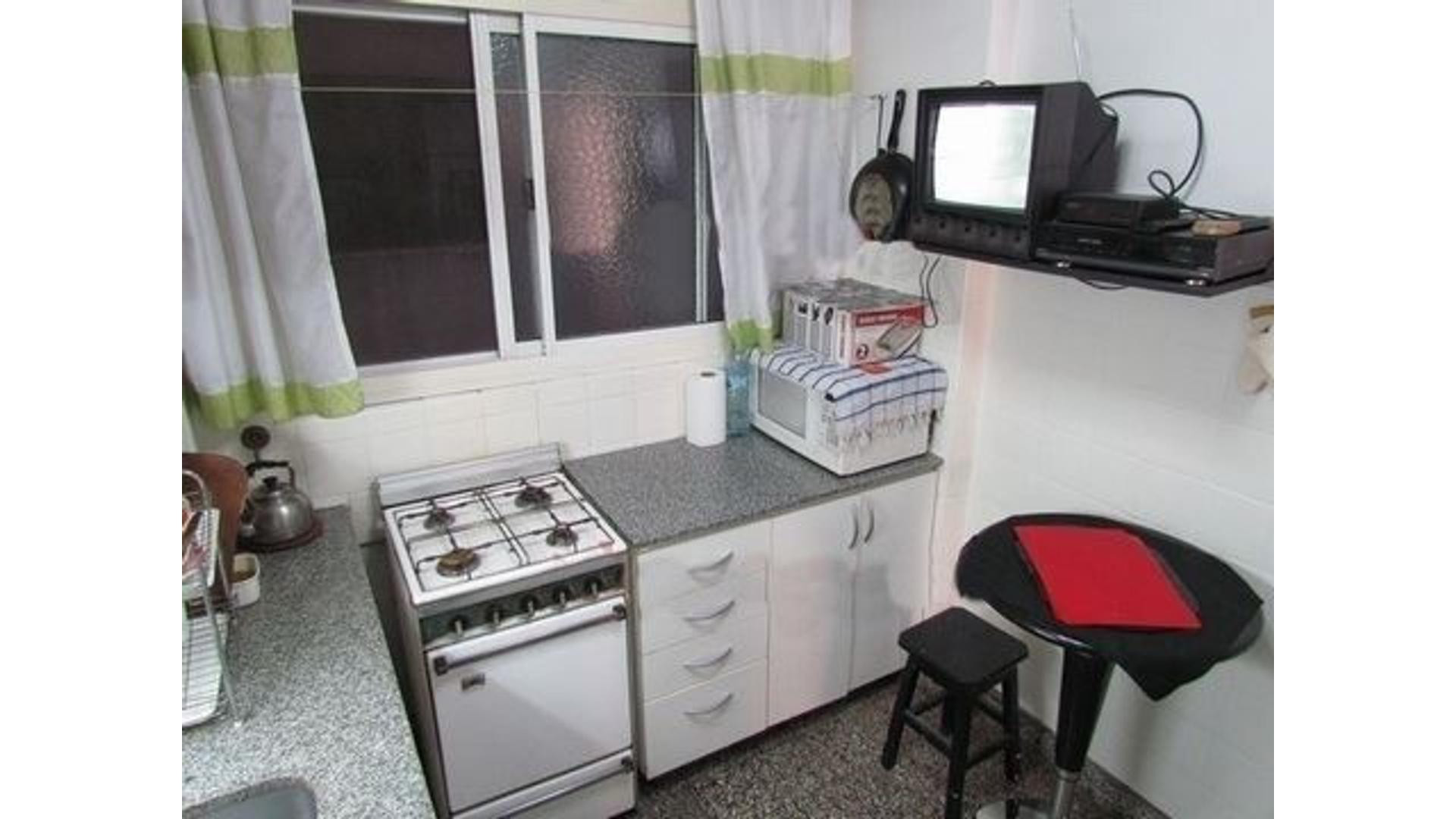 One-bedroom apartment of 40 m² in Recoleta, street-facing with views of Av. Cnel Díaz and a balcony running the length of the unit. Separate kitchen, full bathroom, and central hot water. Air conditioning for heating and cooling, washer-dryer, fridge (no-frost), and a 32-inch LED TV.