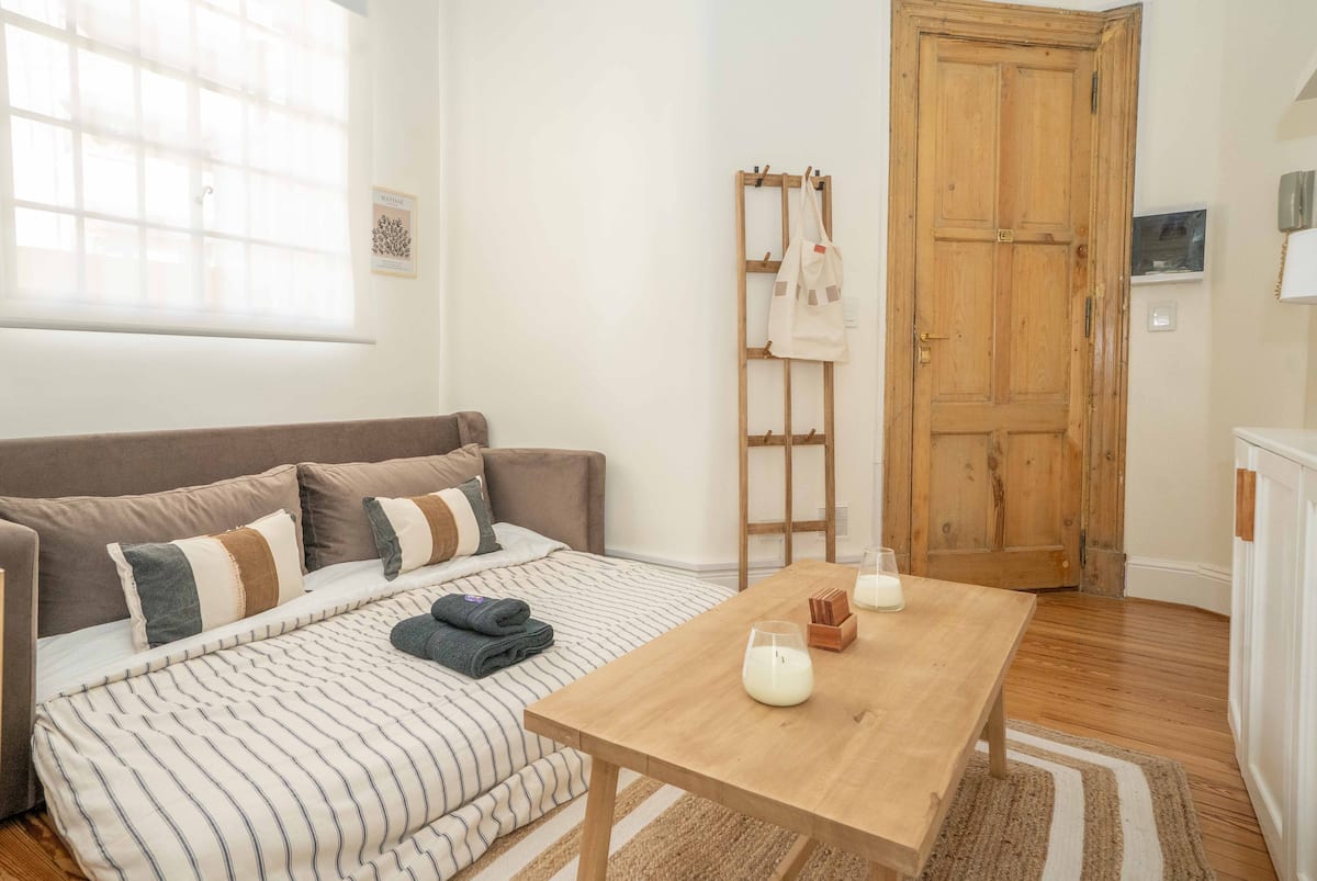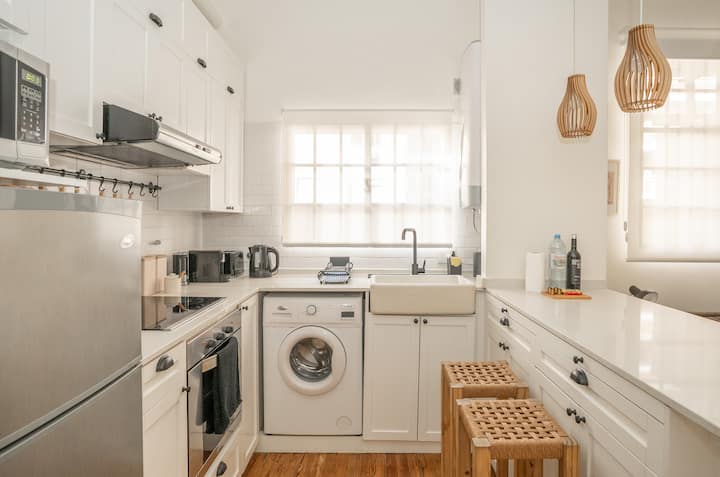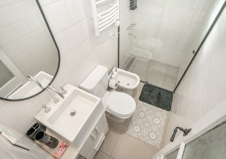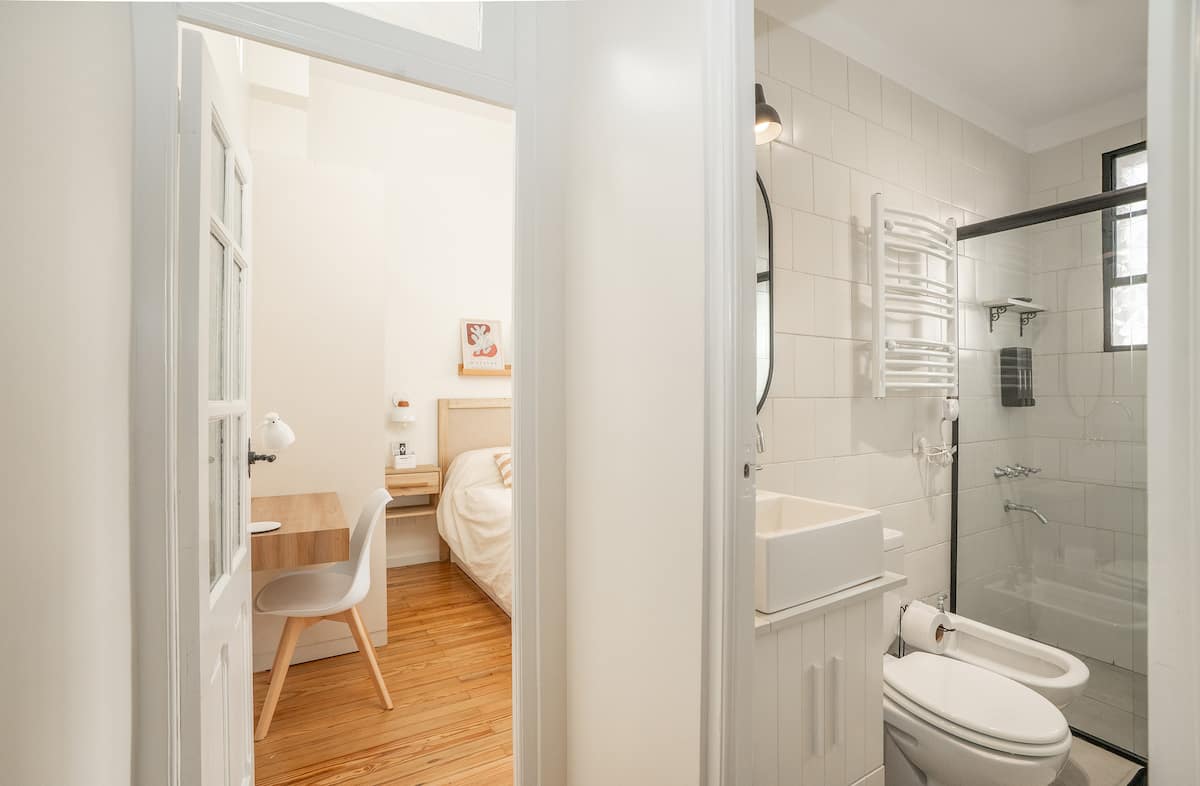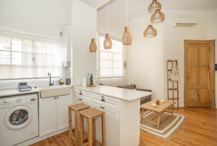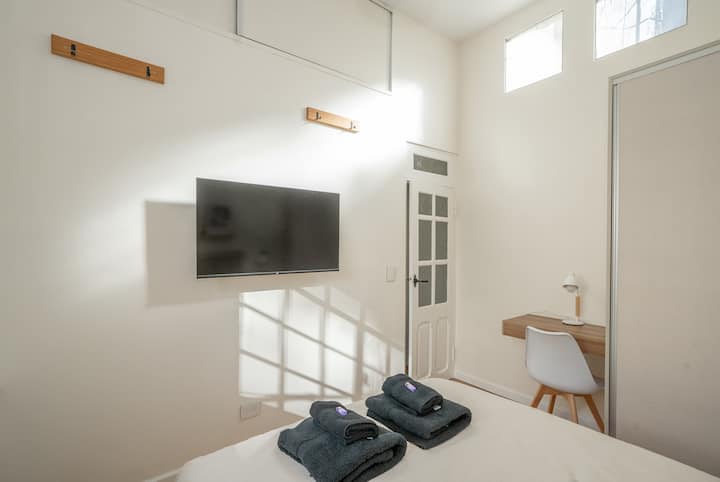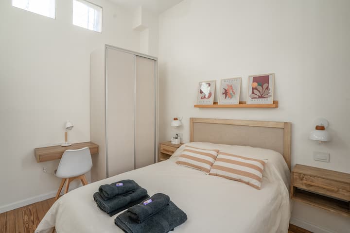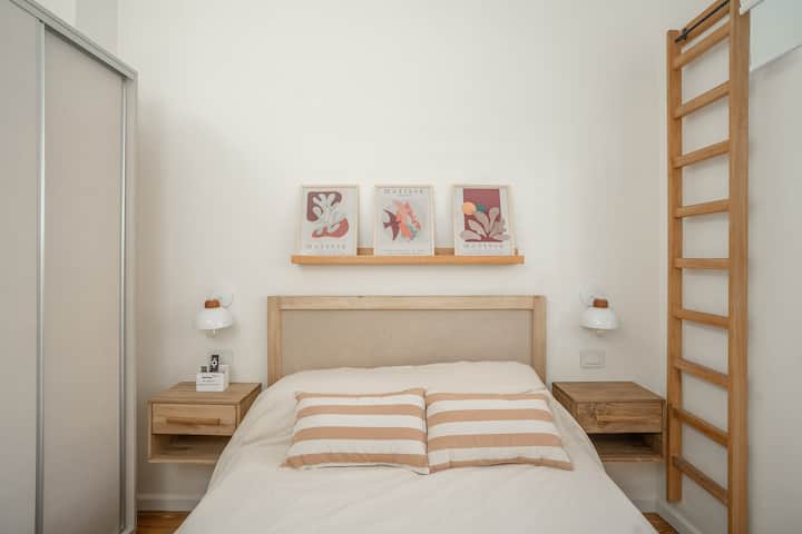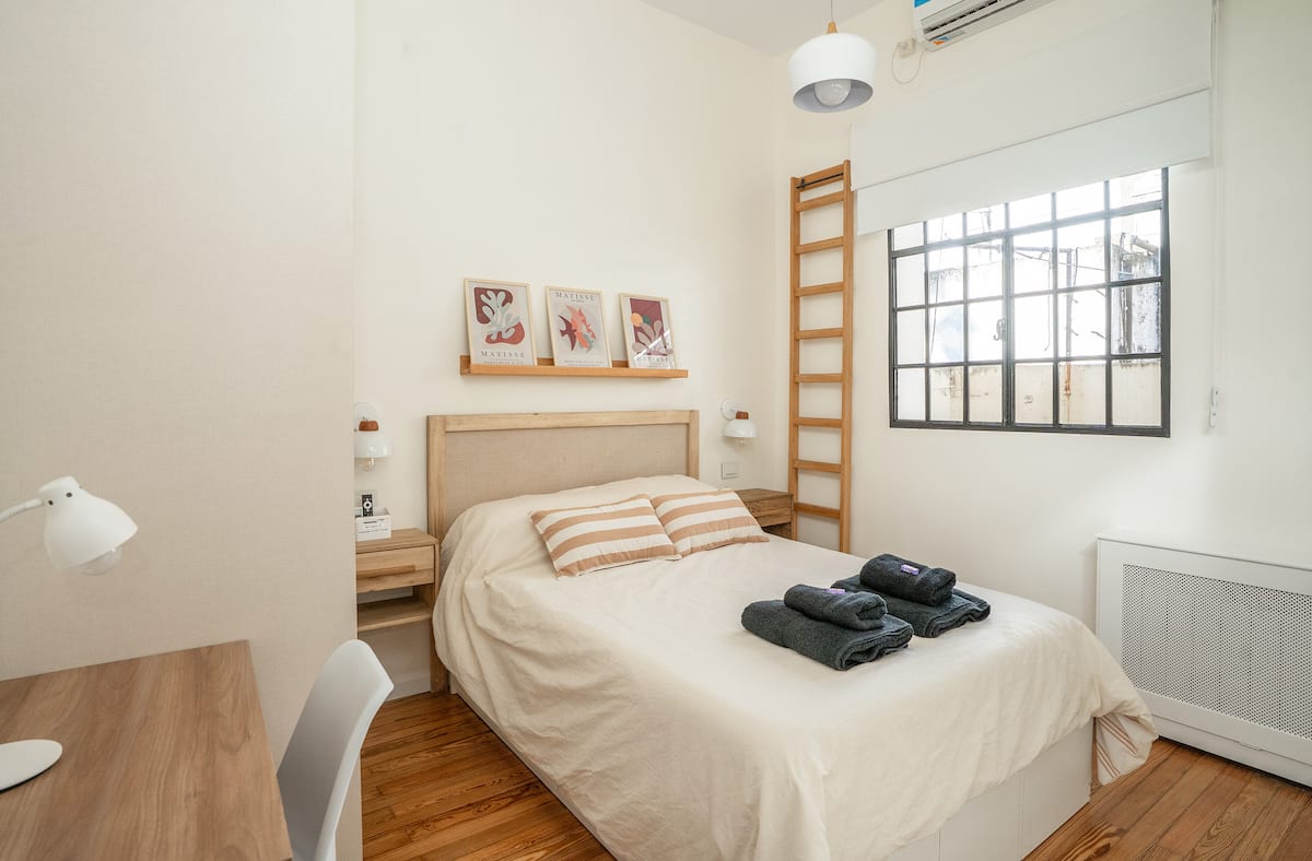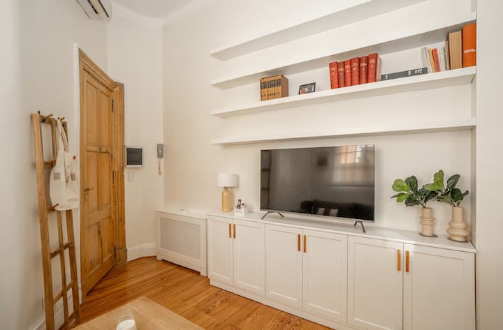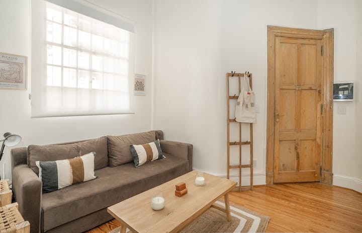 Two-room apartment in Recoleta, refurbished and presented as new. The bedroom has a closet, a work desk and a Smart TV. The living room includes a sofa with pull-out bed and a Smart TV. The fully equipped kitchen has an electric oven, refrigerator, coffee maker, microwave, toaster, electric kettle and kitchen utensils. The bathroom has been modernised, and the unit has air conditioning in all rooms plus radiator heating.