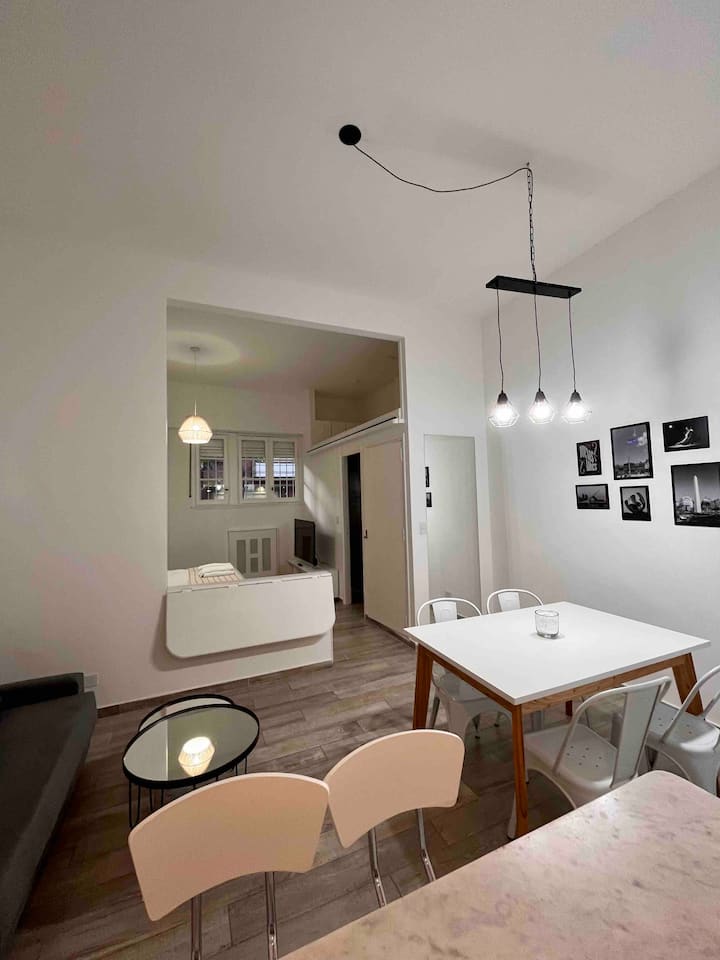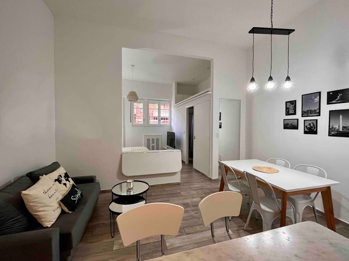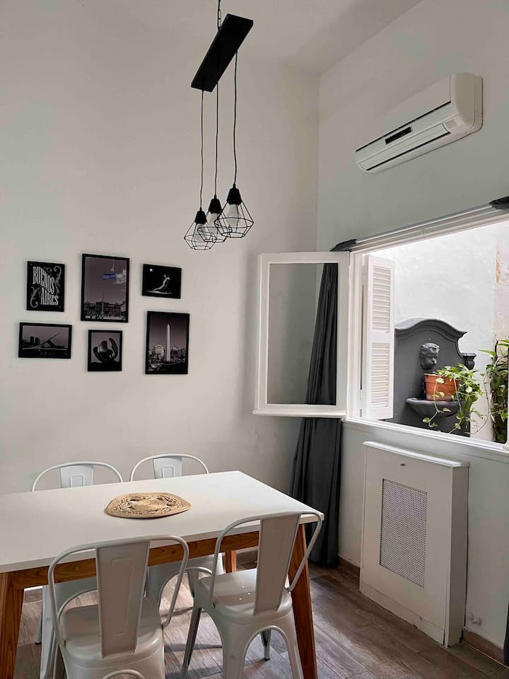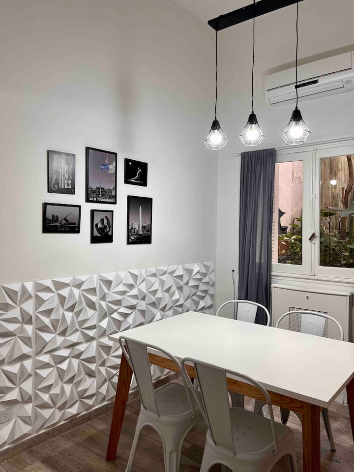 Recycled studio apartment in a building in Recoleta. It is for up to 4 people and includes a private patio. The apartment is described as fully refurbished, with modern design.
