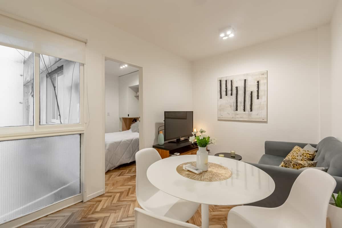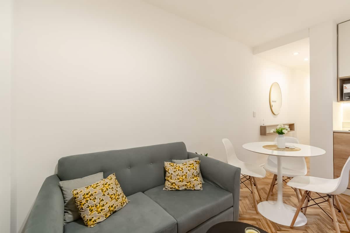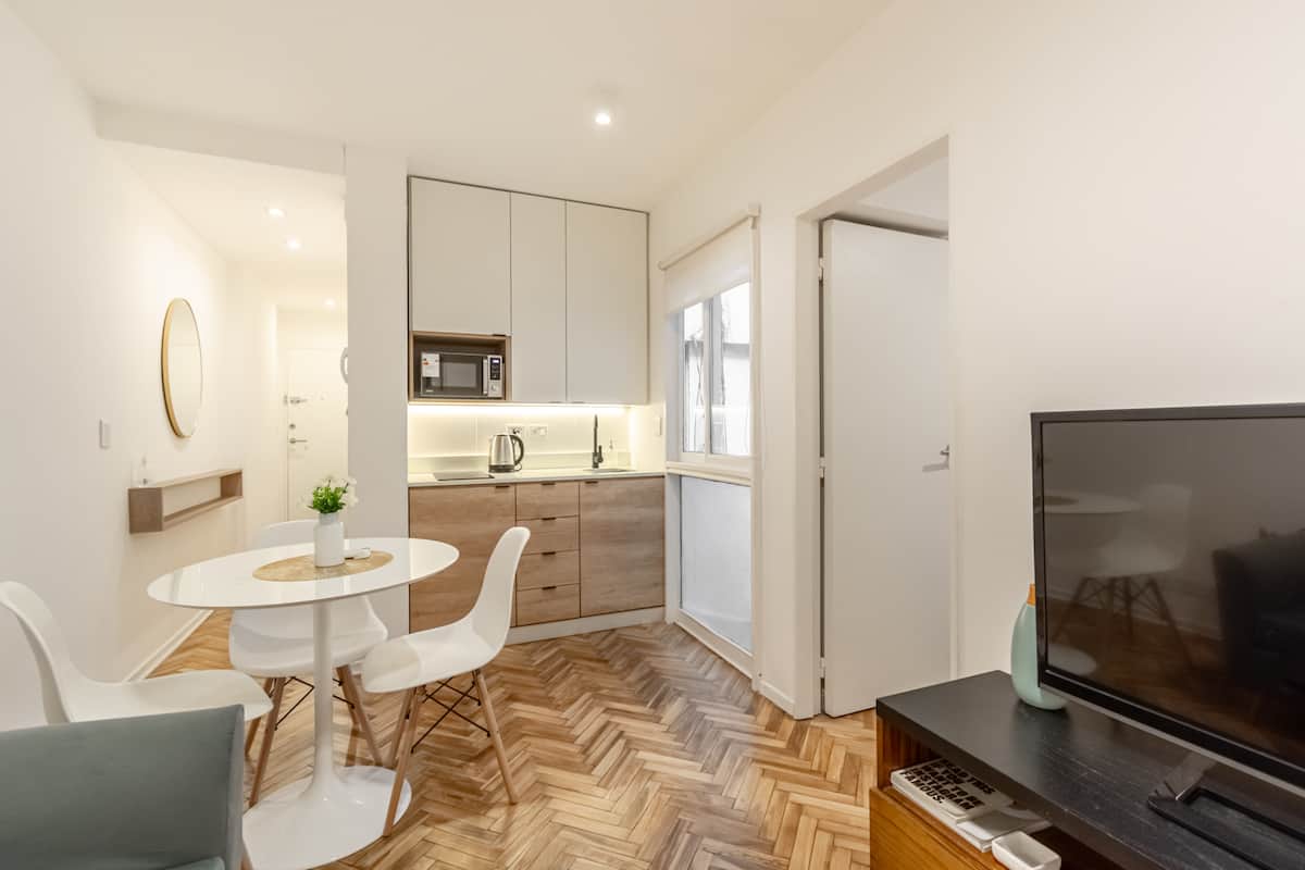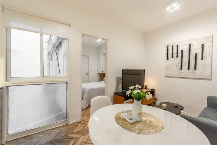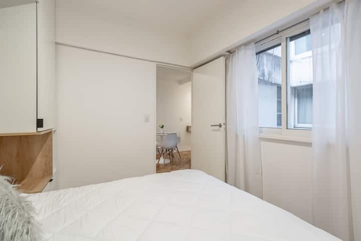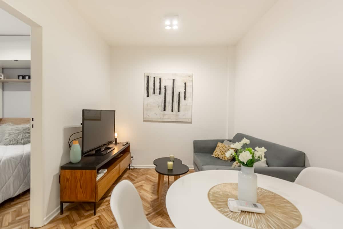 Furnished one-bedroom apartment in Recoleta with a full kitchen, oven and microwave. There is a dining table with two chairs, a sofa, Smart TV and WiFi. It has a double bed and a full bathroom.