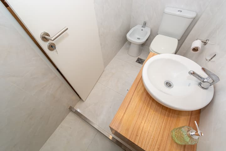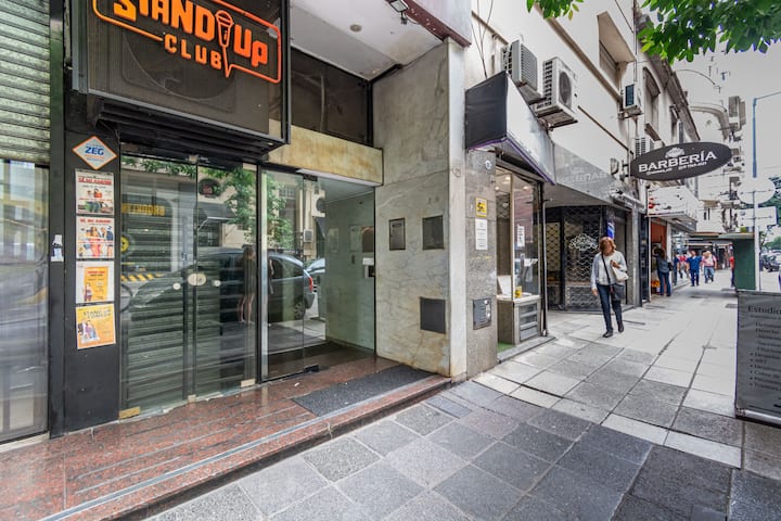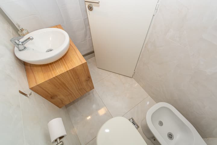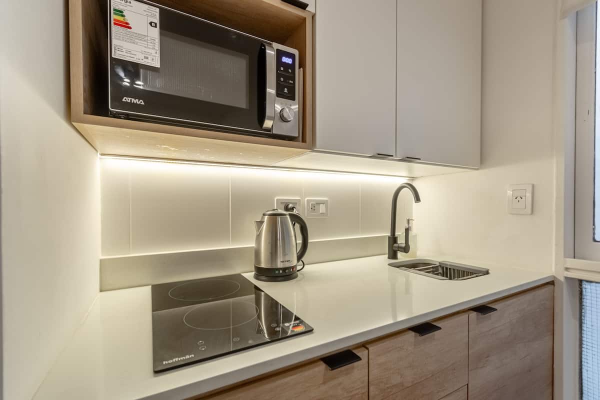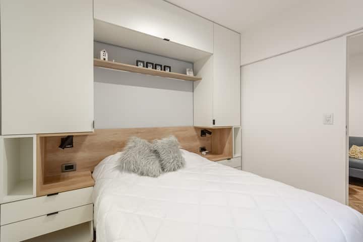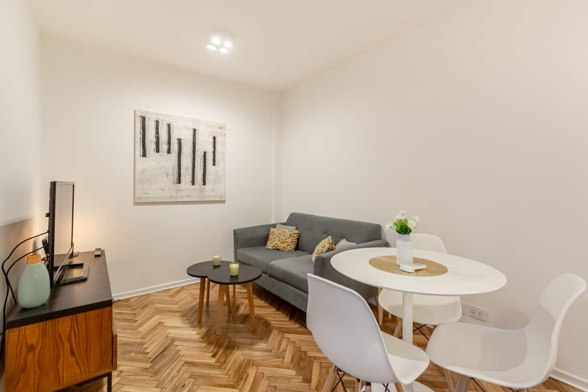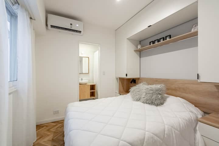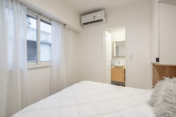 Furnished one-bedroom apartment in Recoleta with a full kitchen, oven and microwave. There is a dining table with two chairs, a sofa, Smart TV and WiFi. It has a double bed and a full bathroom.