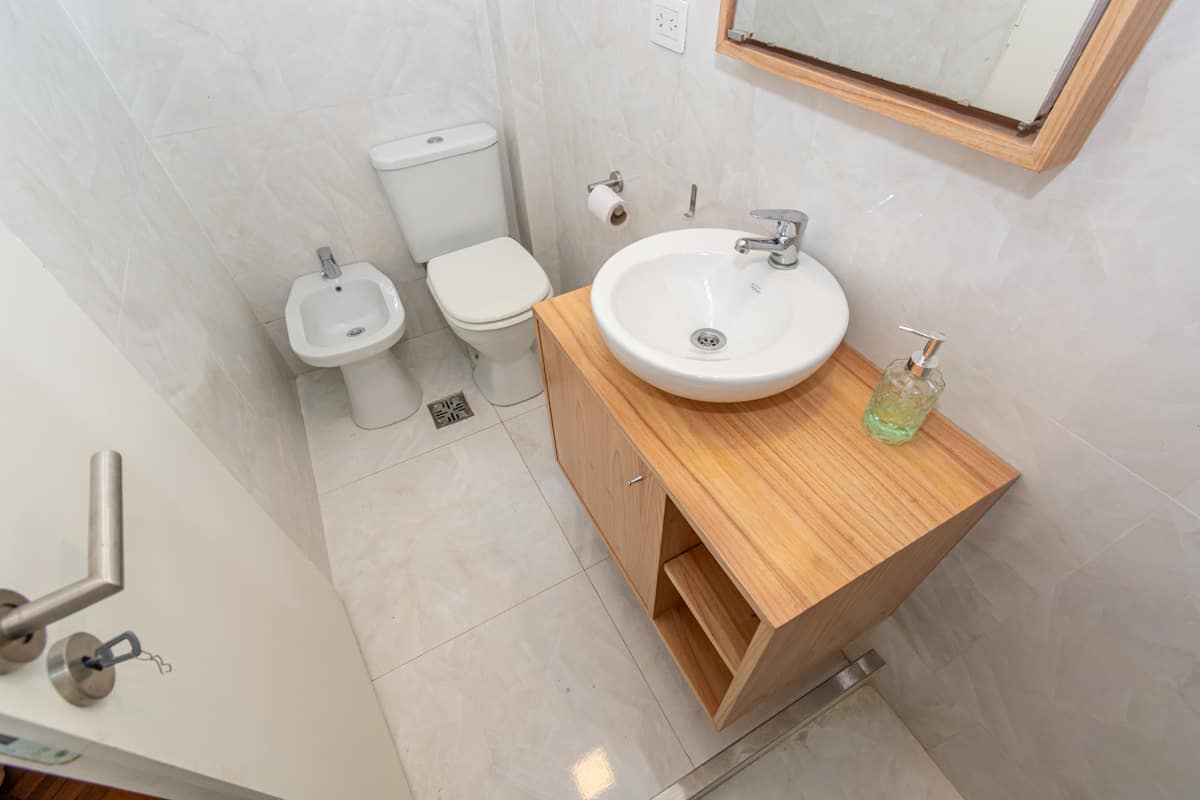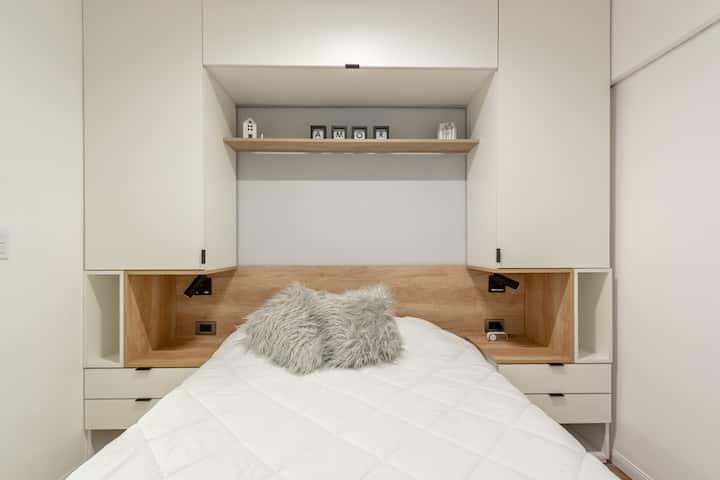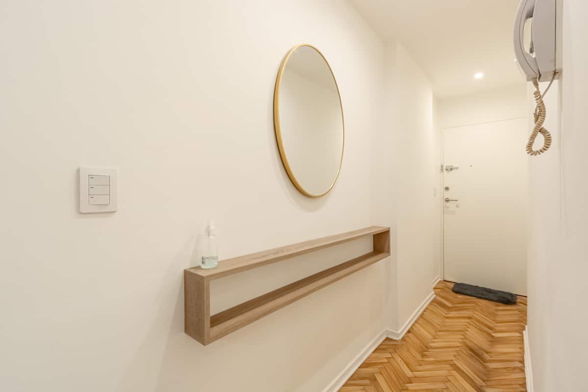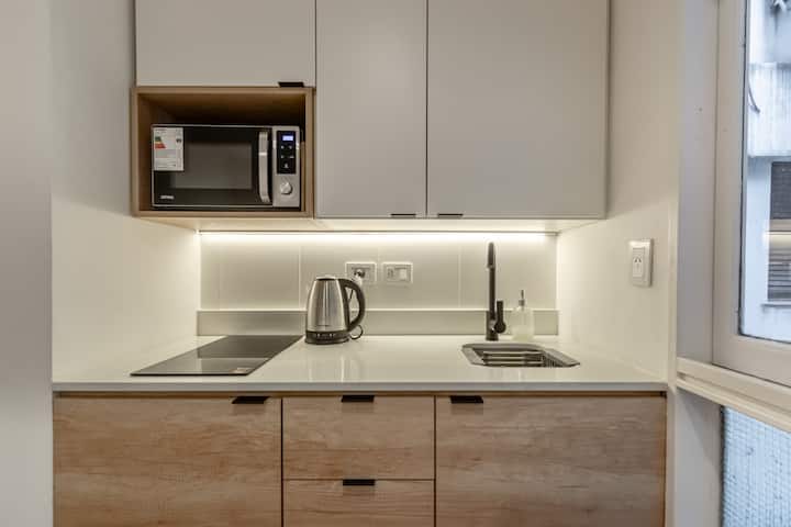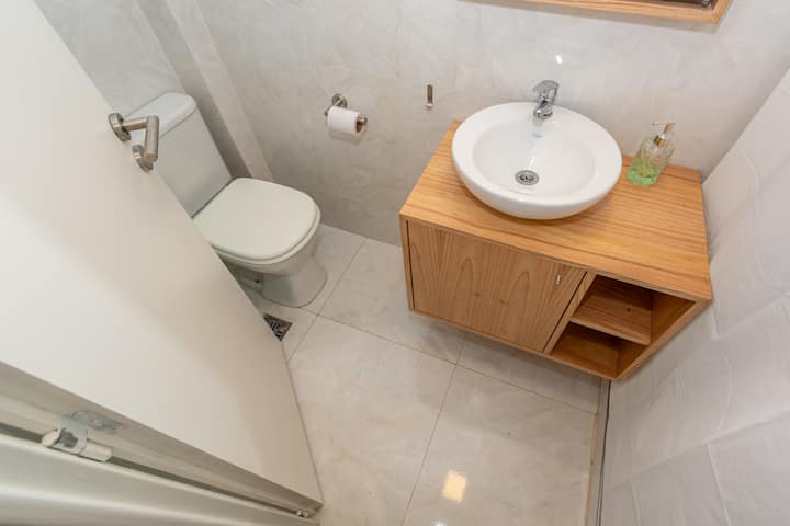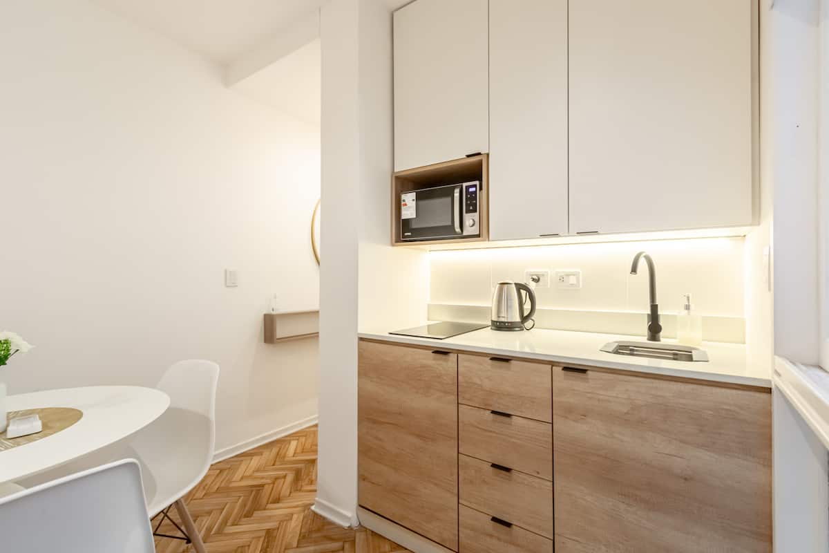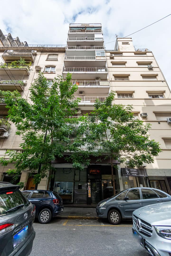 Furnished one-bedroom apartment in Recoleta with a full kitchen, oven and microwave. There is a dining table with two chairs, a sofa, Smart TV and WiFi. It has a double bed and a full bathroom.