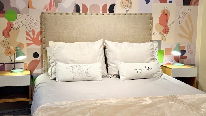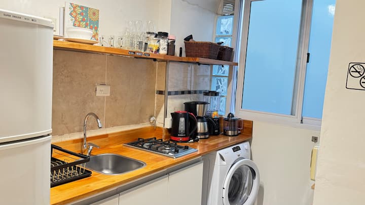 One-bedroom apartment in Recoleta with a queen-size bed and a desk for work. The apartment has hot/cold air conditioning, an integrated gas kitchen with an electric oven, juicer, blender and coffee maker, and a 40-inch LED TV with basic video cable (not smart). Check-in is from 1:00 pm to 8:00 pm; outside these hours, the key is located 70 metres from the building. Building security and camera monitoring require a valid photo personal identification of registered guests, sent via the platform be