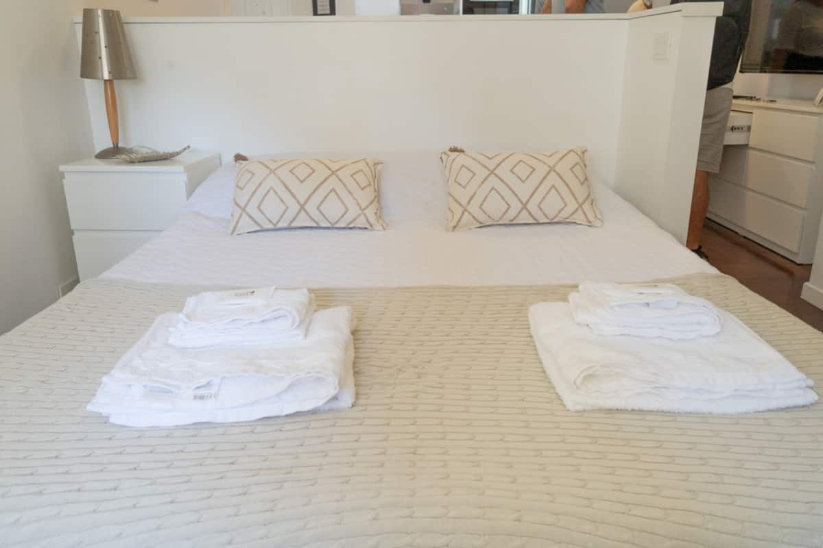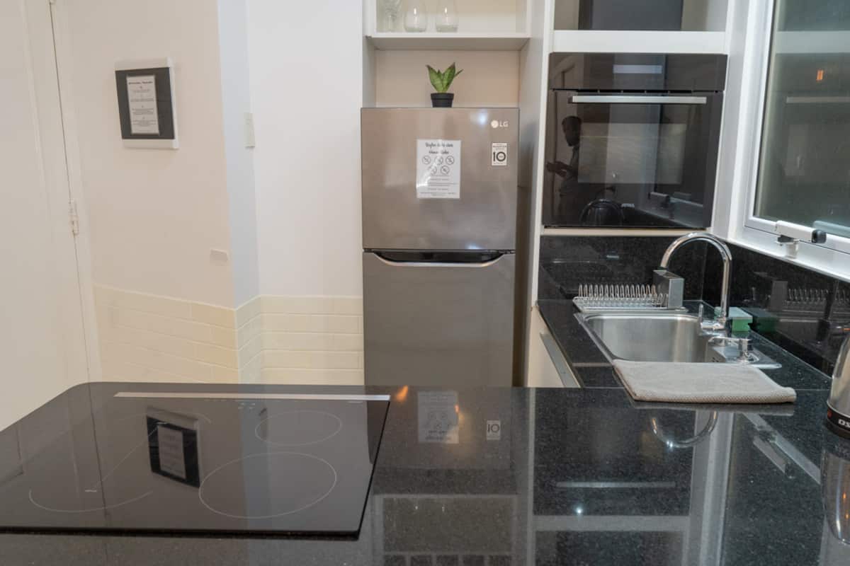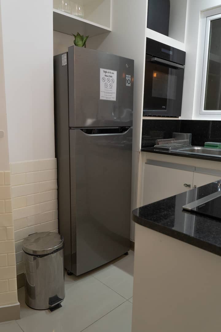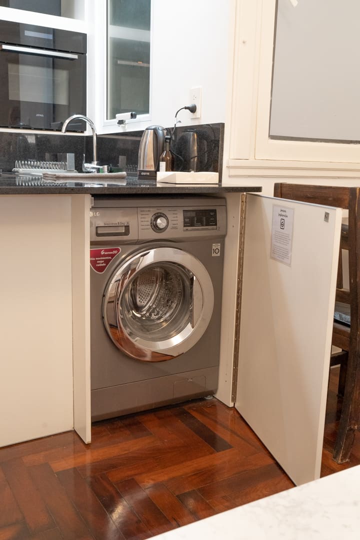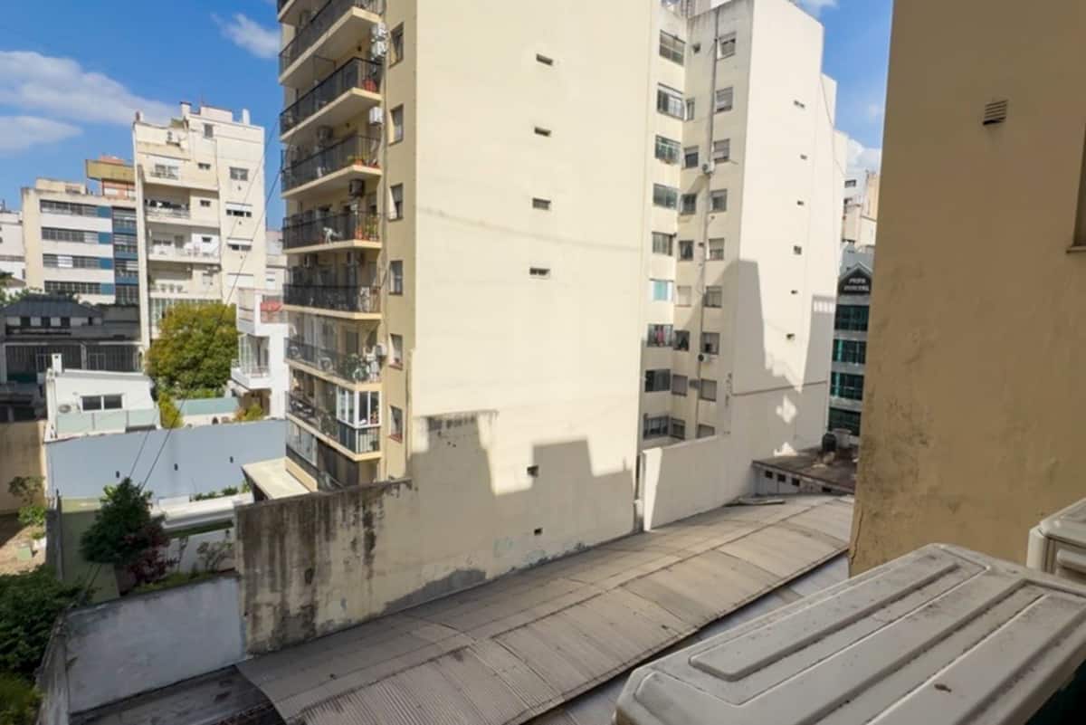 Renovated one-bedroom apartment in Recoleta, in a historic building with typical local architecture and murals. The bedroom has a queen bed, and the living room includes a modern armchair. The bathroom has a powerful shower. The kitchen has a glass cooktop and an electric oven, and there is also an automatic washing machine and a large refrigerator. Located about 50 metres from Av. Santa Fe and close to Subte line D.